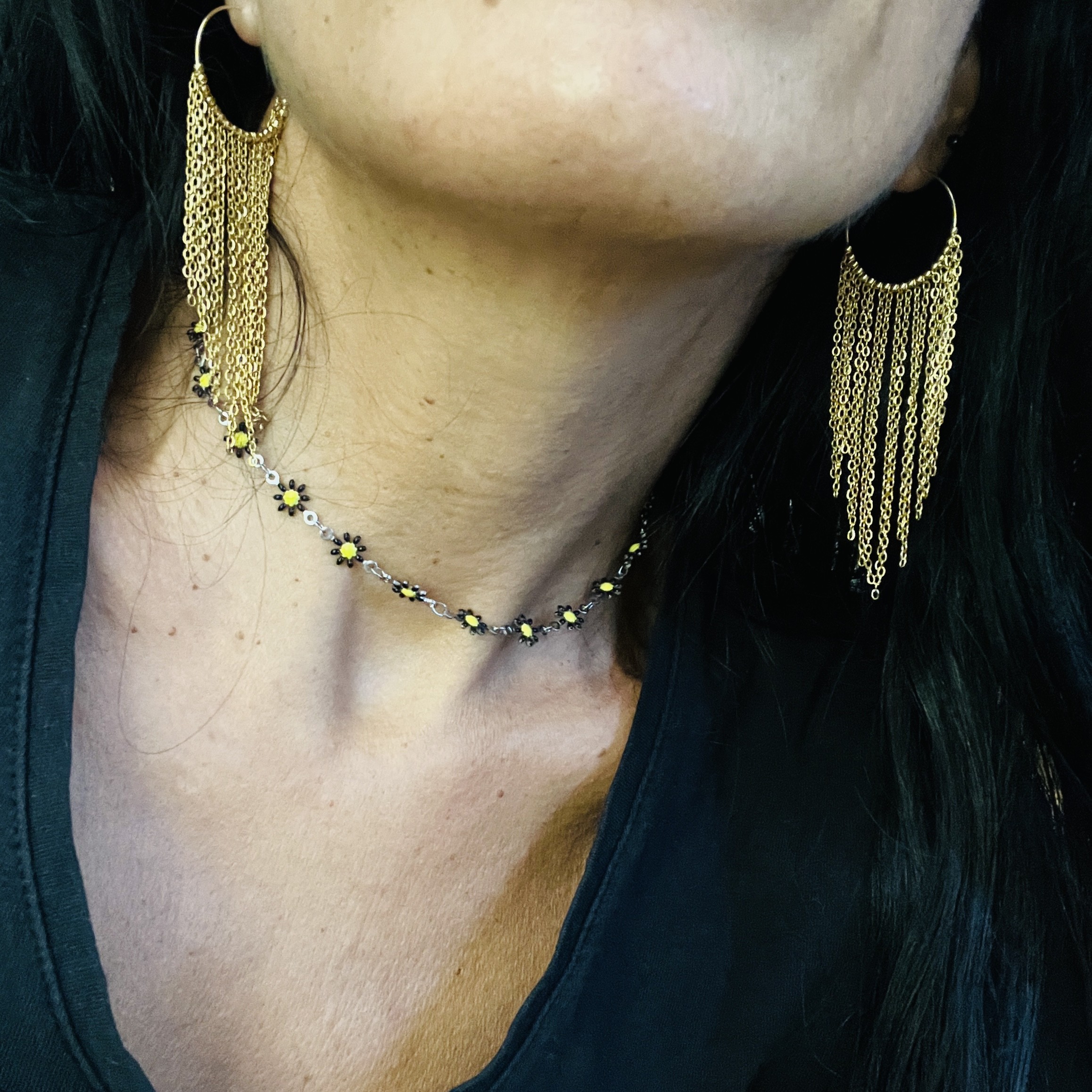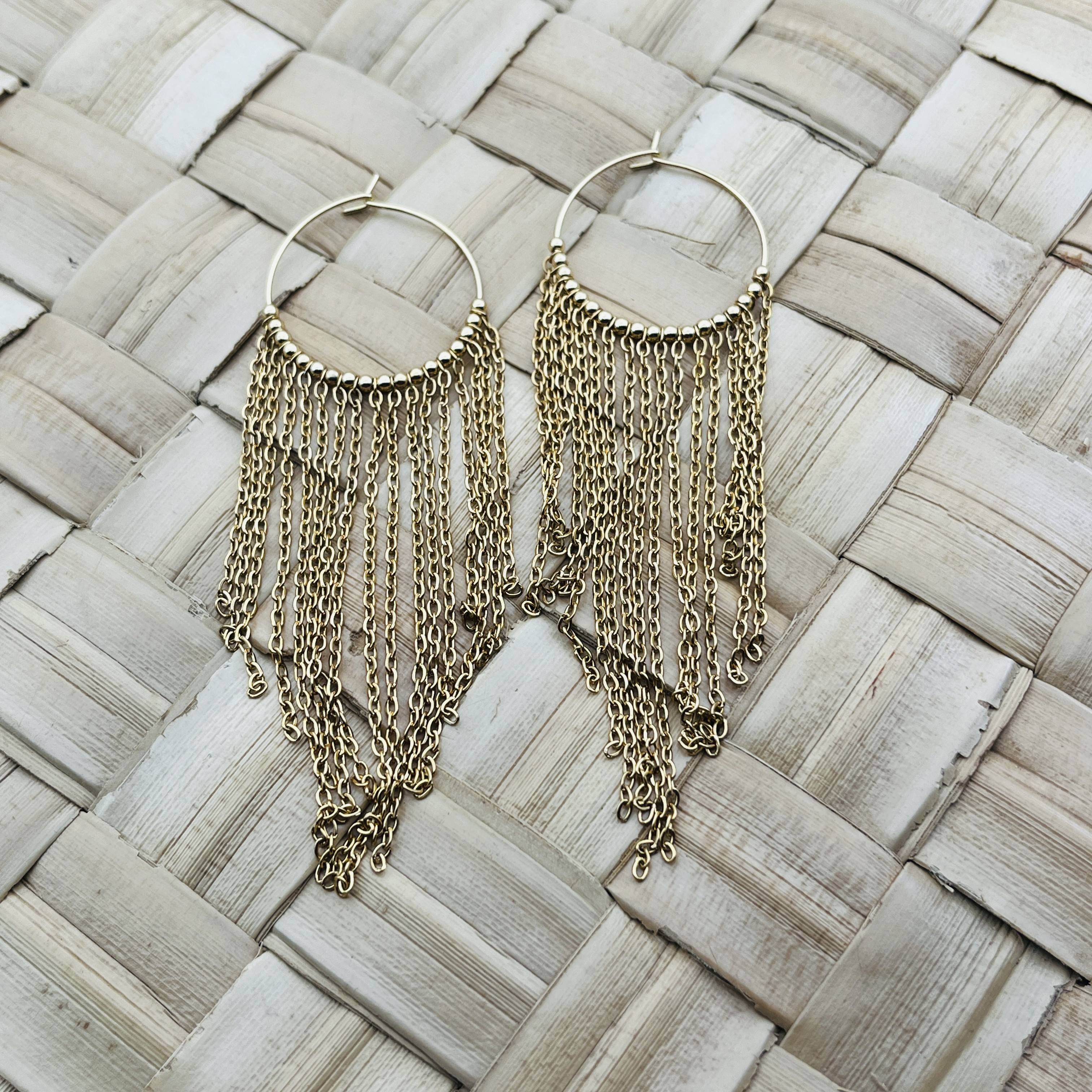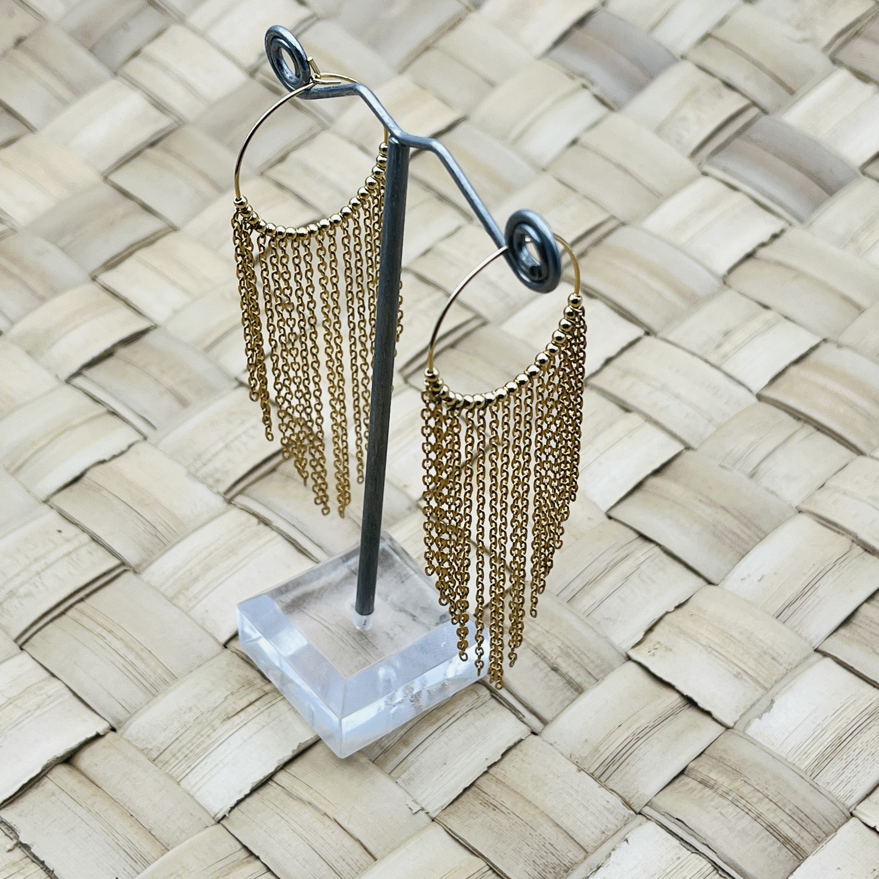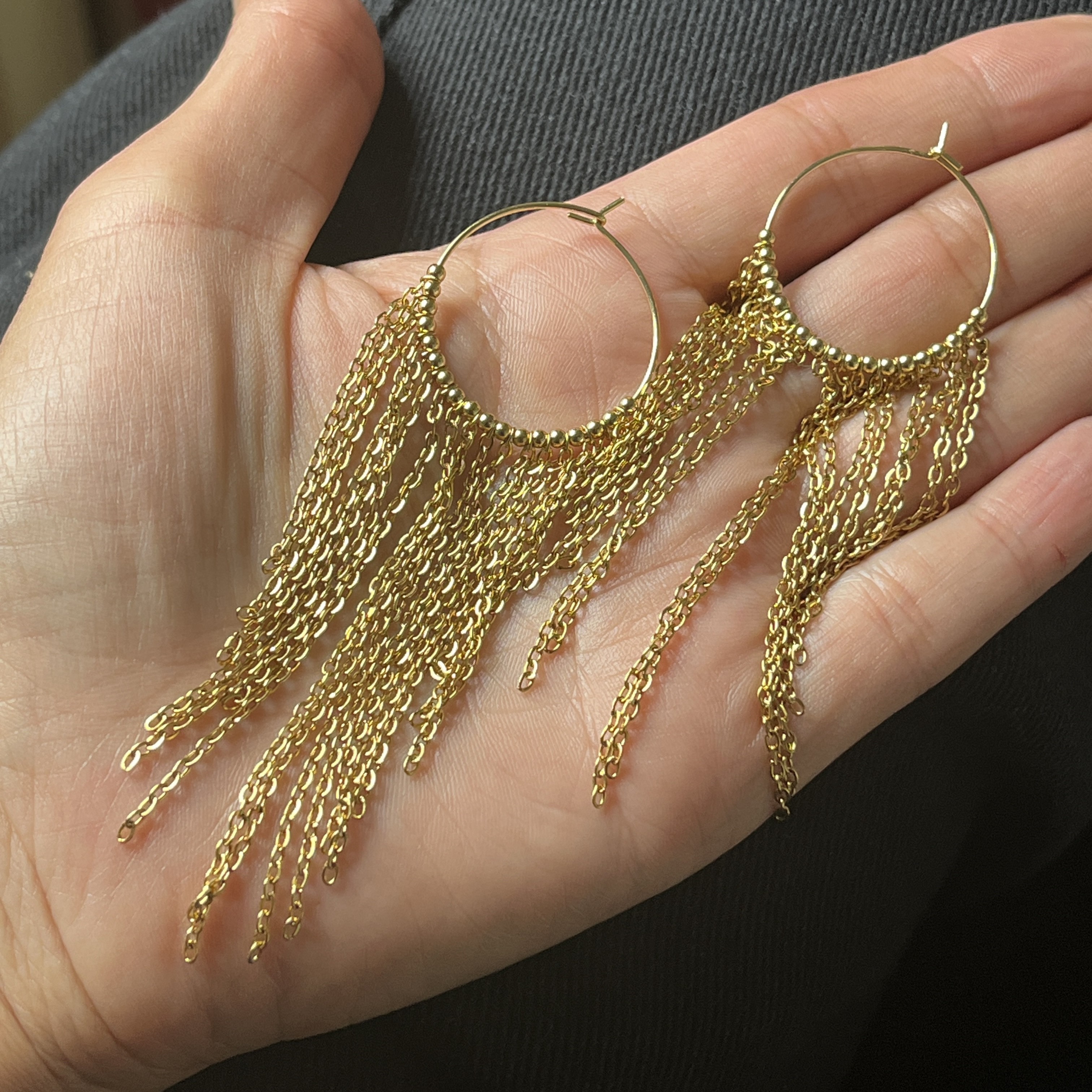 Ces créoles élégantes mêlent finesse et mouvement avec leurs chaînes dorées en dégradé, délicatement espacées de petites billes. Leur fluidité rappelle une cascade lumineuse qui capte chaque rayon de lumière.