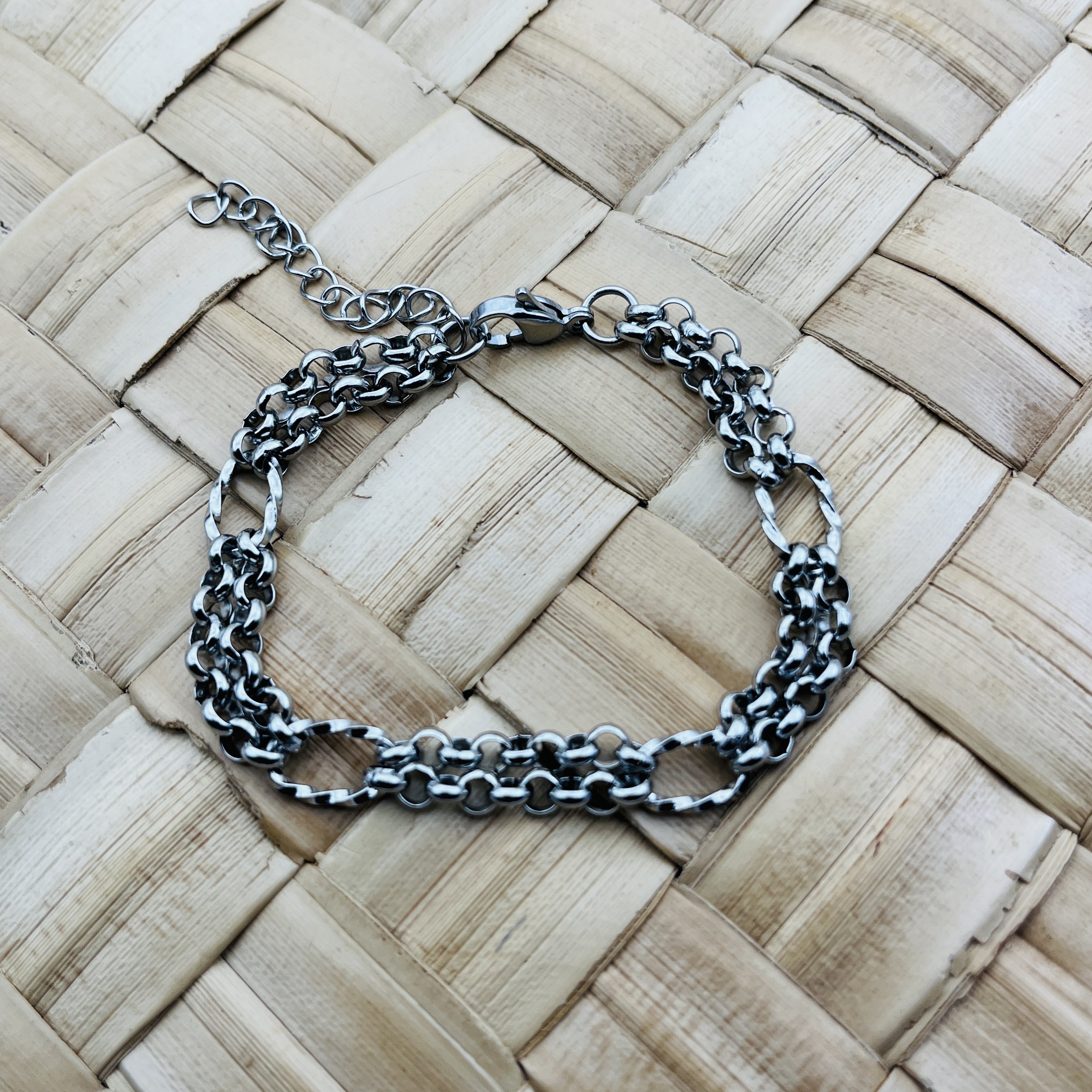Un bijou au style affirmé qui joue sur l’entrelacement des maillons et des chaînes. Sa teinte grise métal lui confère une allure moderne et intemporelle, parfaite pour accessoiriser aussi bien un look casual qu’élégant. Léger mais plein de caractère, ce bracelet apportera une touche urbaine et raffinée à ton poignet.