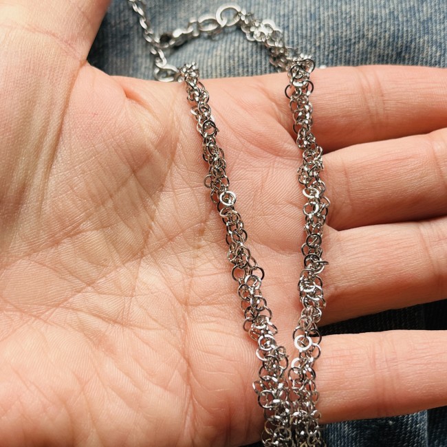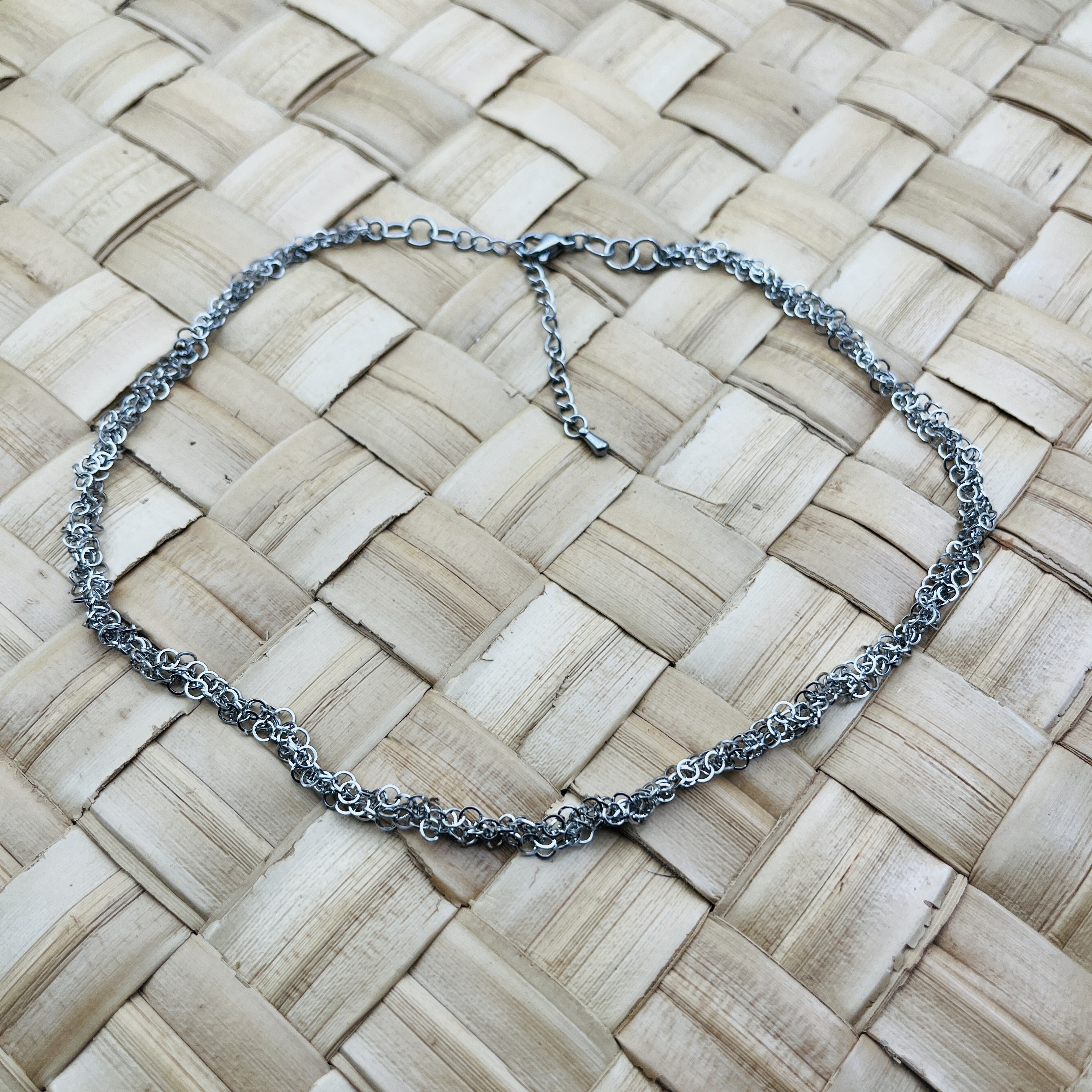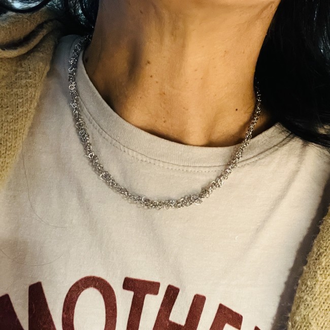 Un jeu subtil d’entrelacs métalliques qui donne à ce collier un style à la fois raffiné et audacieux. Les maillons s’enroulent les uns aux autres pour créer une texture unique, pleine de mouvement et de caractère.