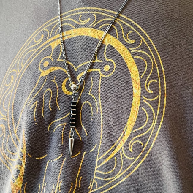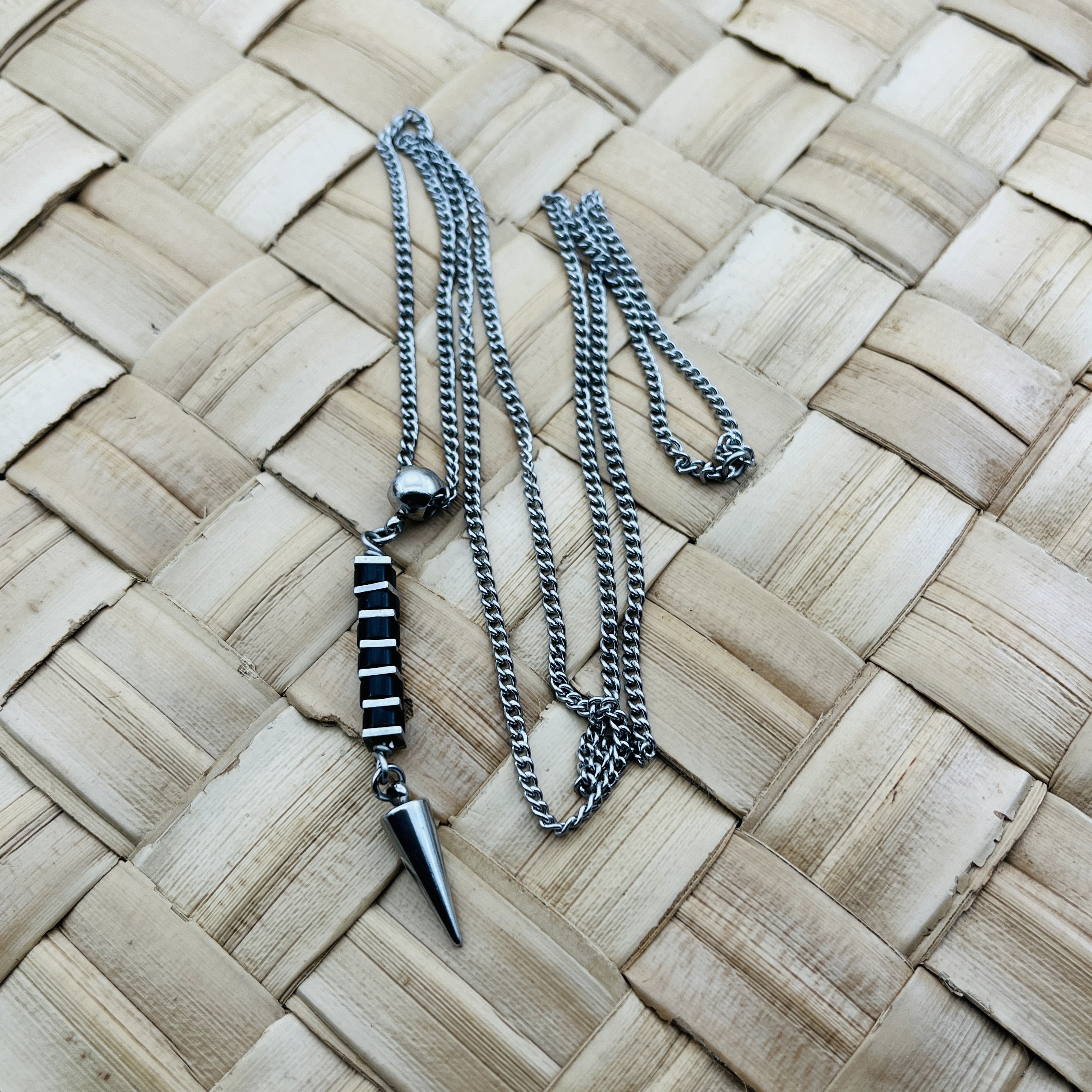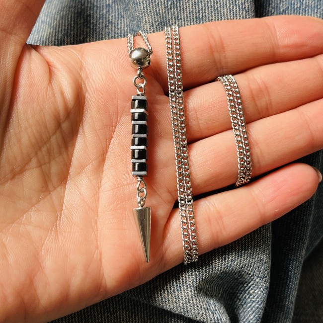 Le pendentif conique en acier apporte une touche moderne et affirmée, idéale pour un style à la fois sobre et puissant.