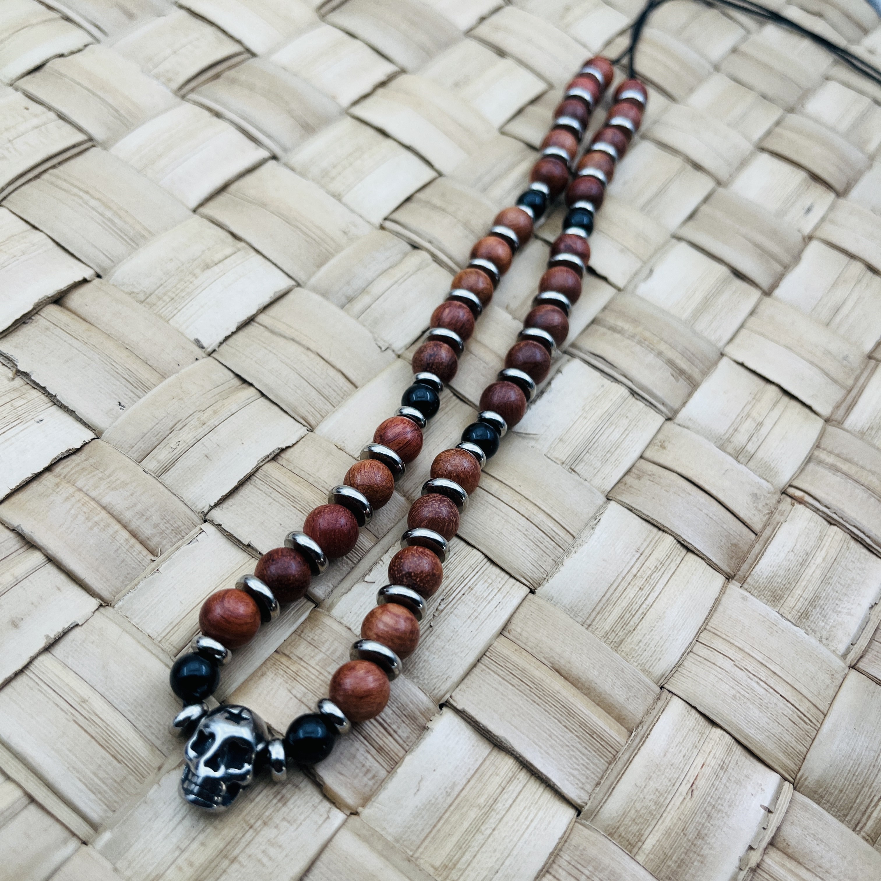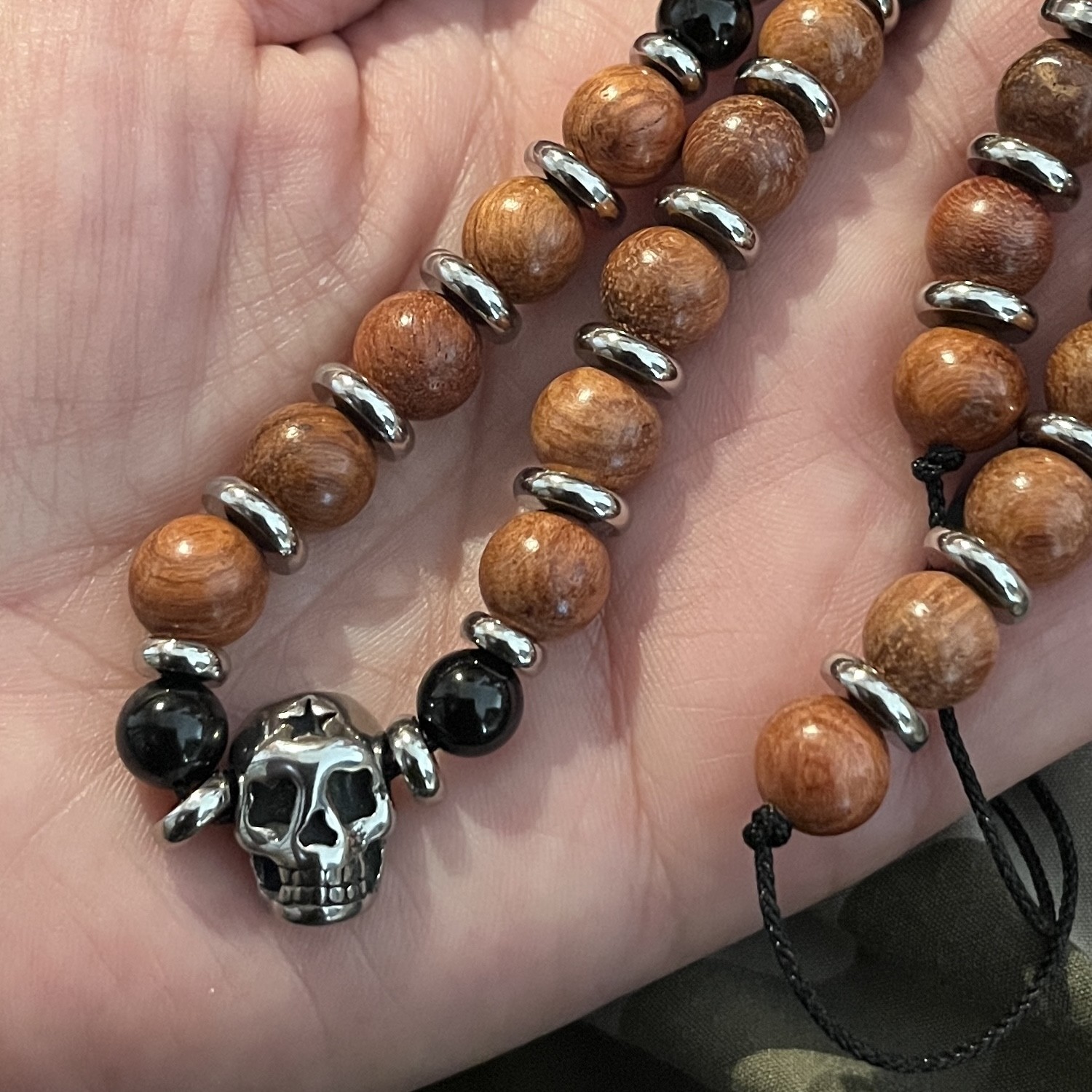 Perles de bois de Santal 8mm, rondelles et tête de mort argentées.