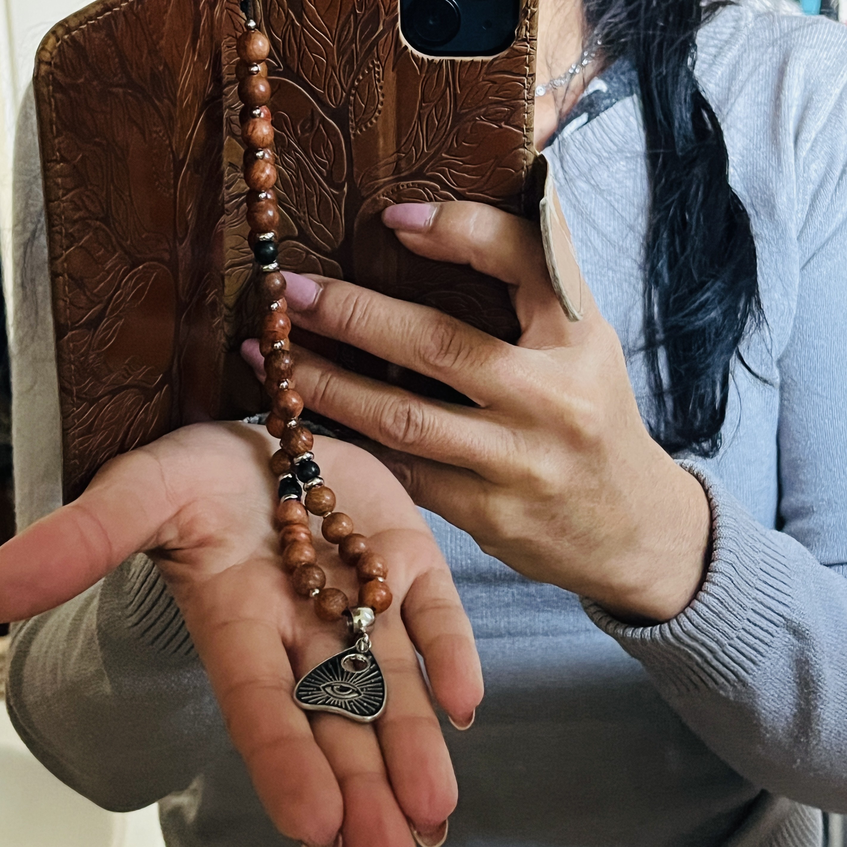 Cette création bijou poignée de téléphone associe la puissance naturelle de la Shungite, pierre de protection reconnue pour neutraliser les ondes électromagnétiques et wifi, à la douceur boisée du Santal, qui favorise la sérénité et l’ancrage.