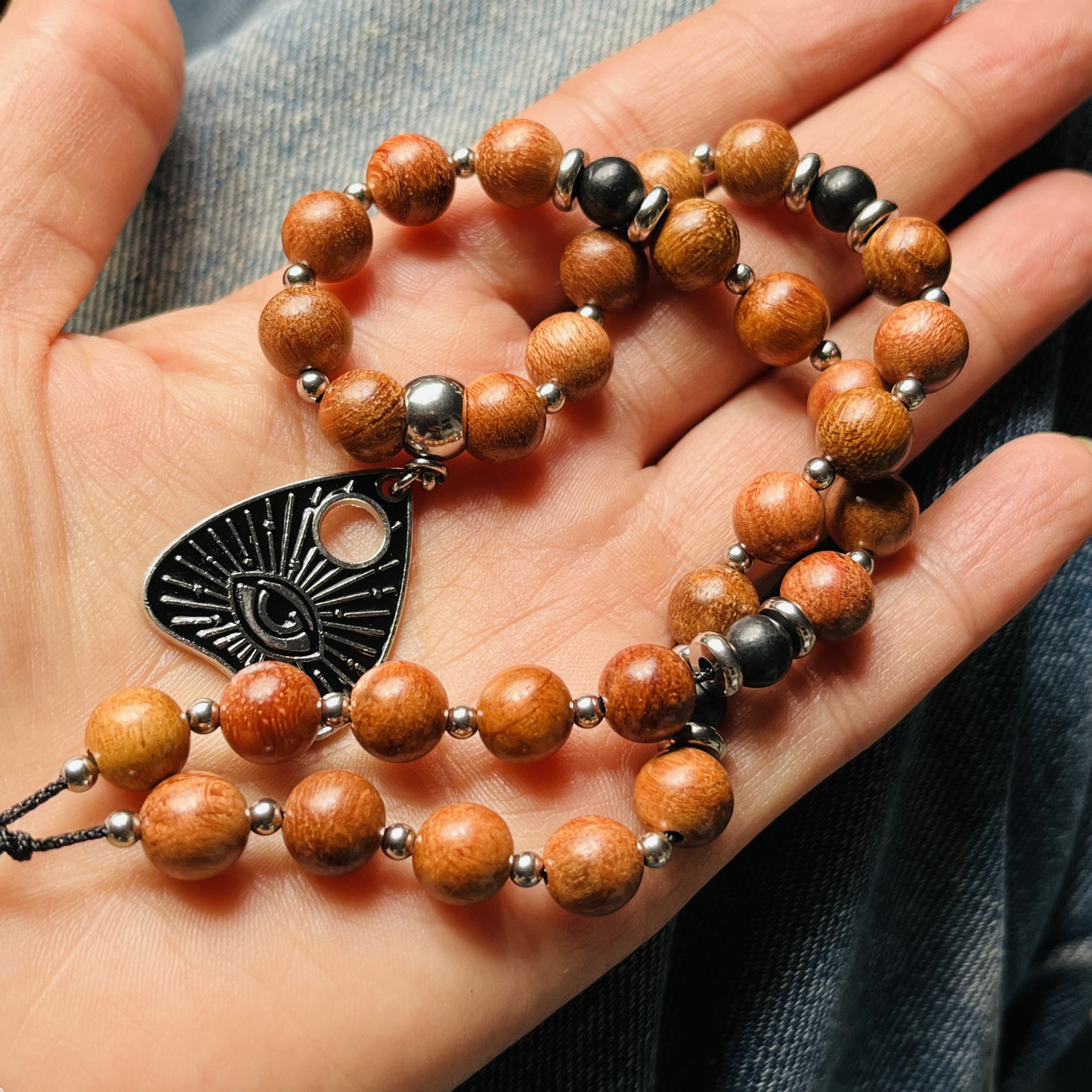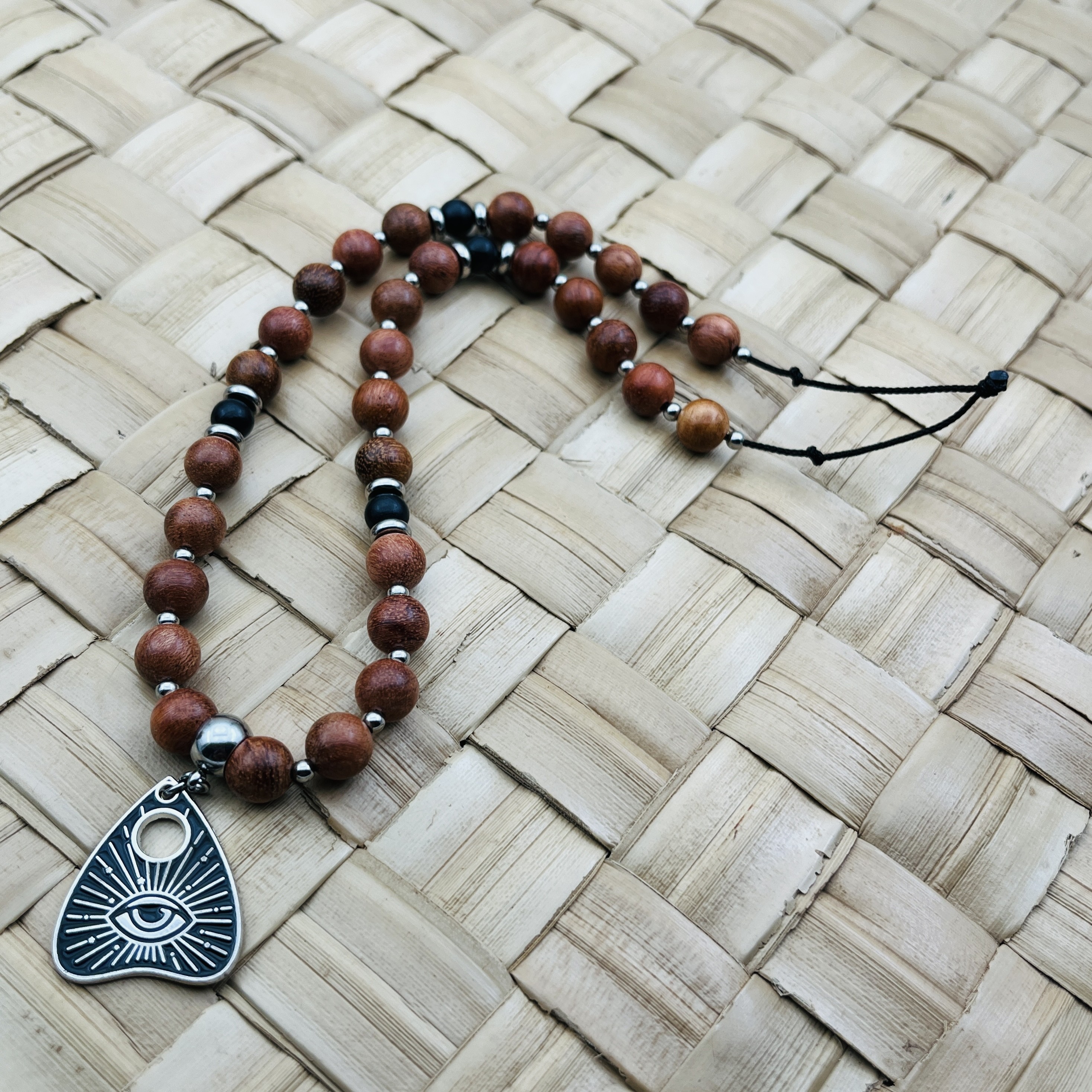 Le pendentif en forme de planchette ornée d’un œil rayonnant symbolise la clarté intérieure, la protection spirituelle et la connexion à l’intuition, il représente ici la vigilance et la lumière intérieure.