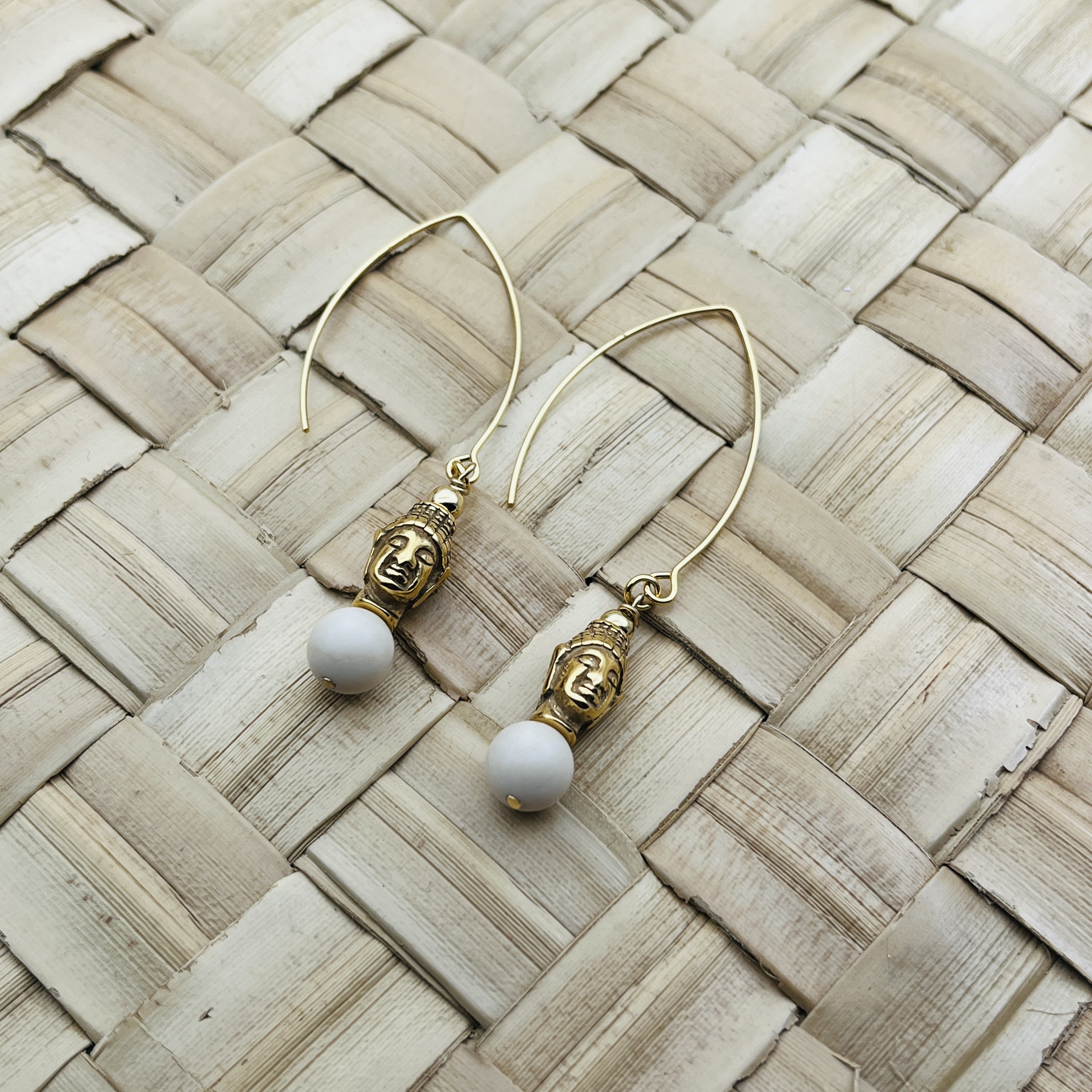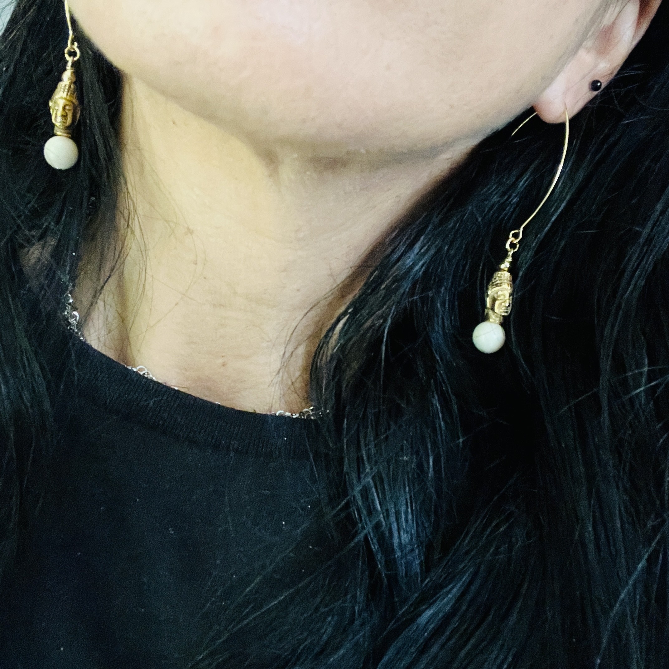 Boucles d'oreilles dorée tête de bouddha sur crochets arabesques avec perles fossiles rivière. Acier inoxydable. Long 7cm