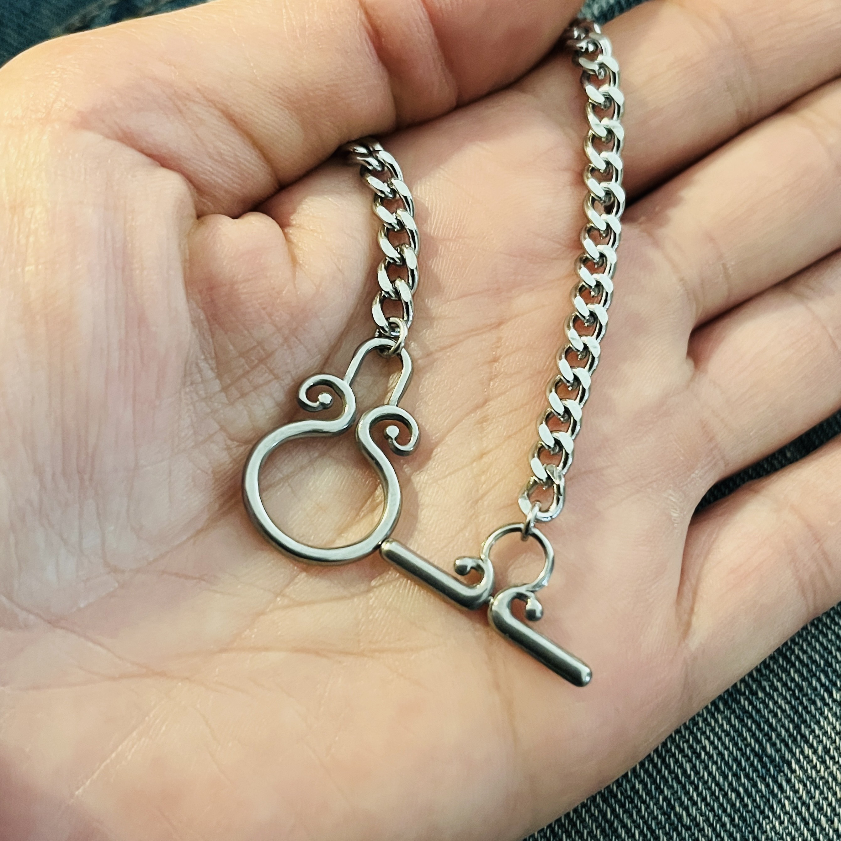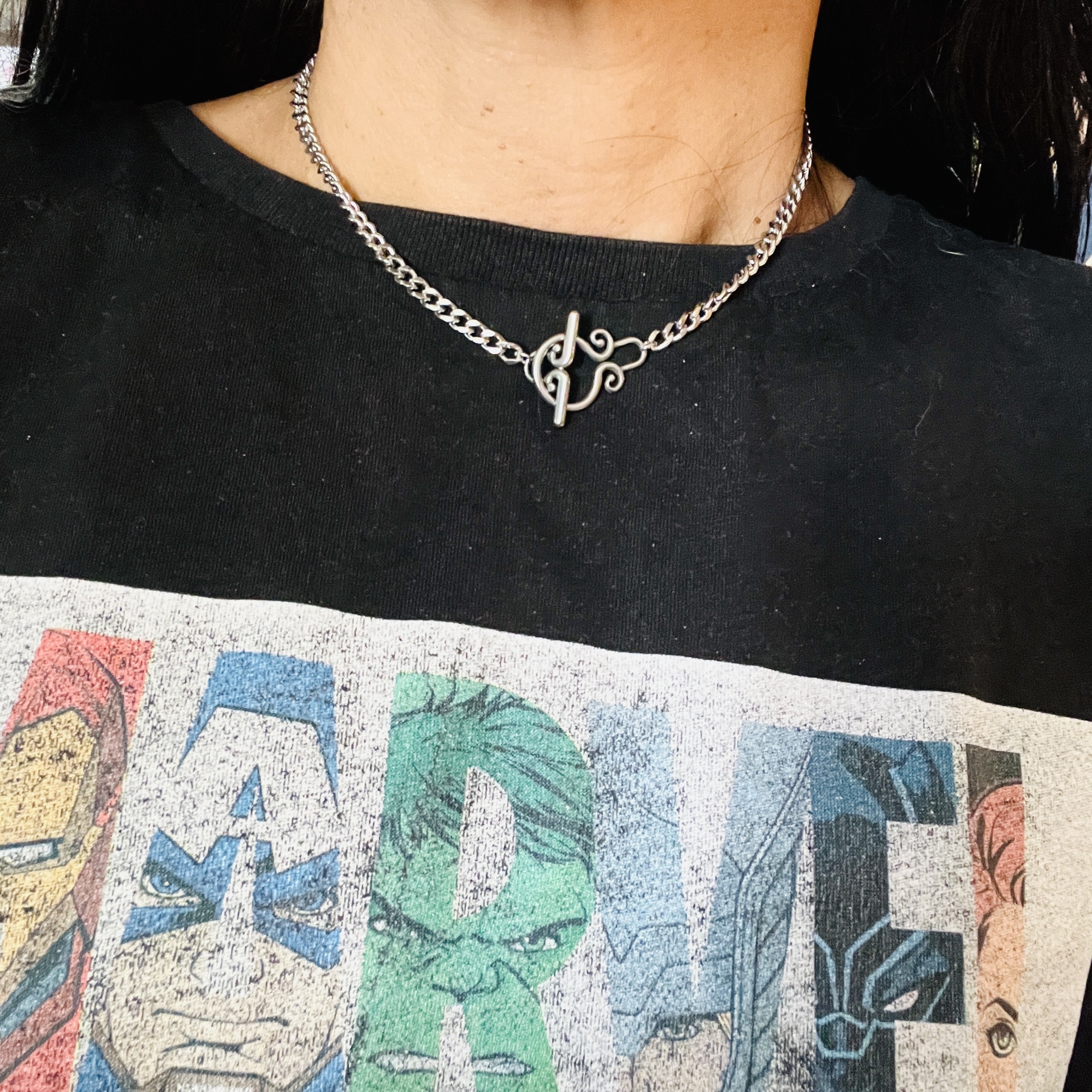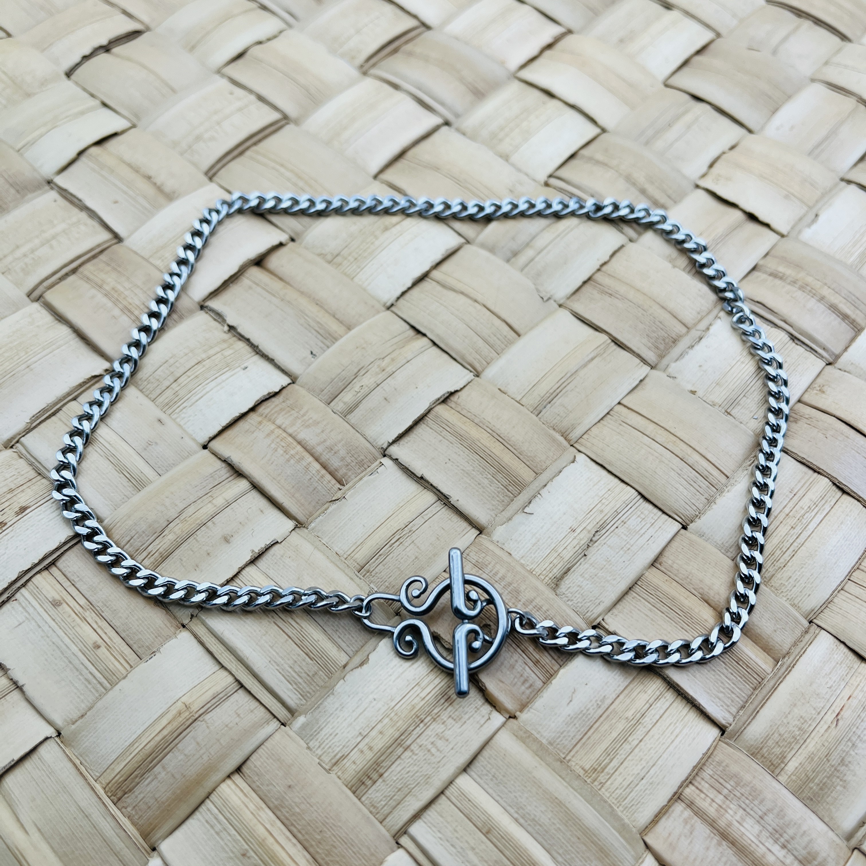 Un collier modèle simple et tendance, avec une chaîne maille cheval en acier inoxydable et un fermoir toggle décoré arabesque mis en avant comme élément central...un style moderne, souvent apprécié pour son côté minimaliste mais affirmé.