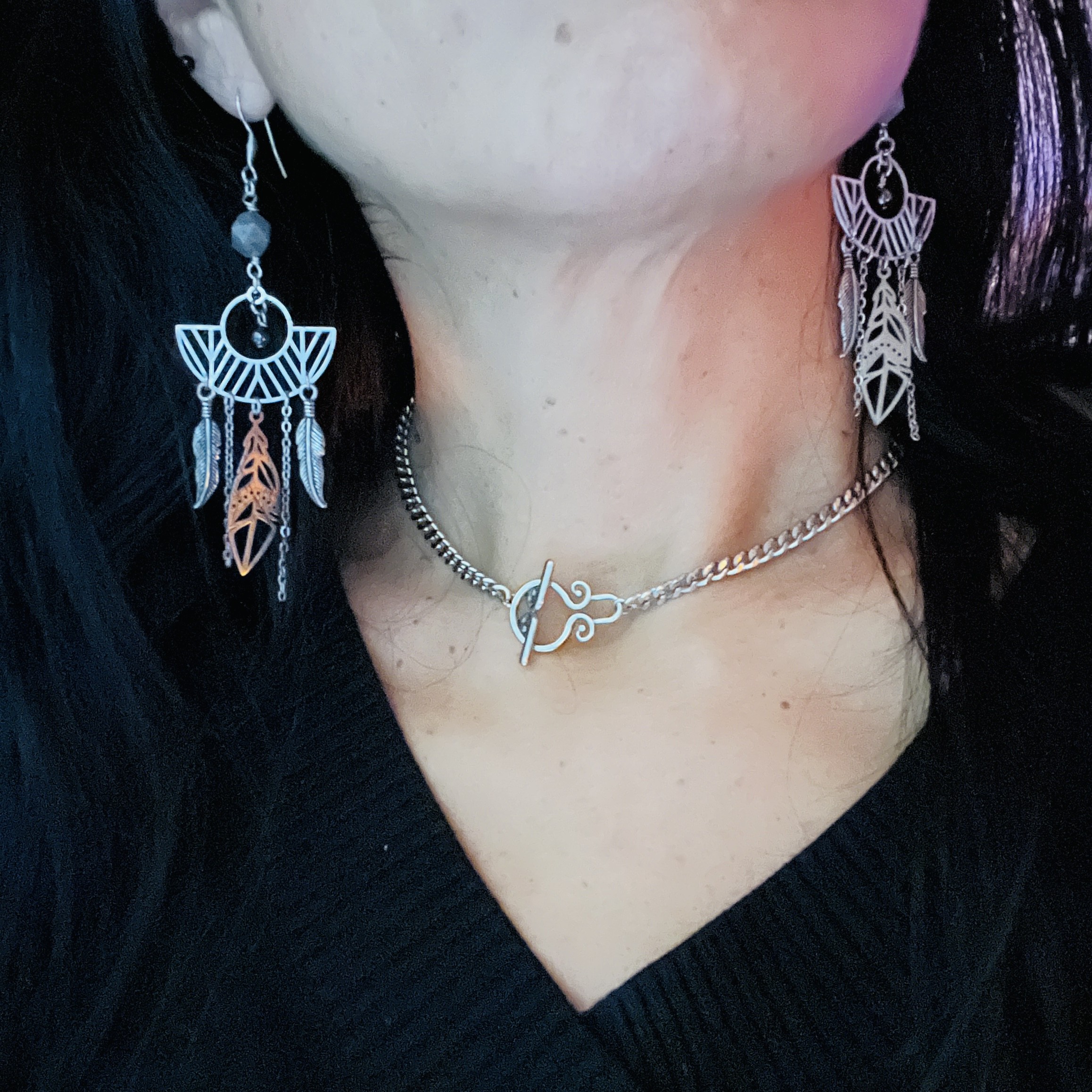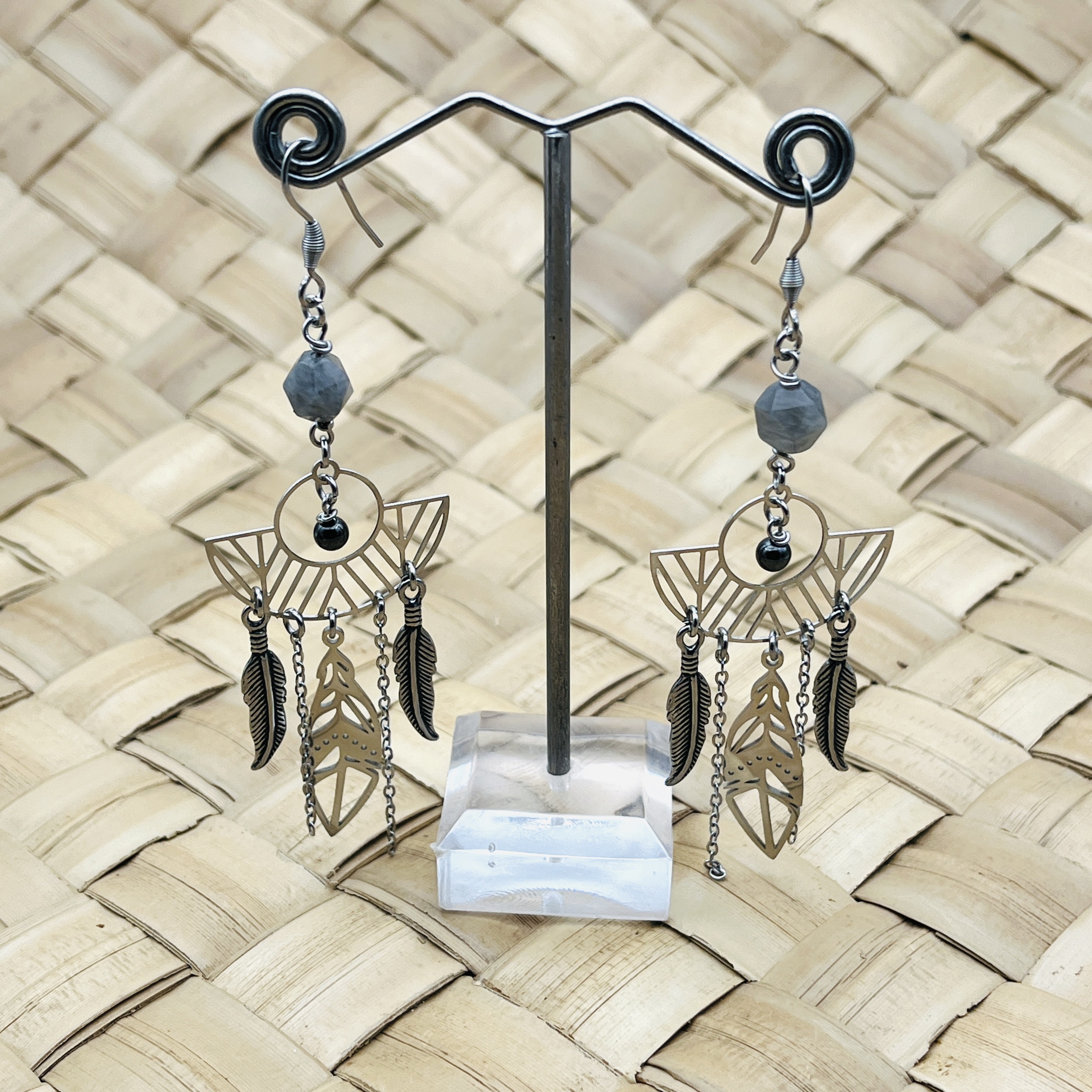 Un duo harmonieux de Quartz Girasol et d’Hématite aimantée, sublimé par une structure géométrique ajourée inspirée des attrape-rêves. Les plumes et les chaînes fines apportent légèreté et mouvement, dans un style à la fois mystique et apaisant.