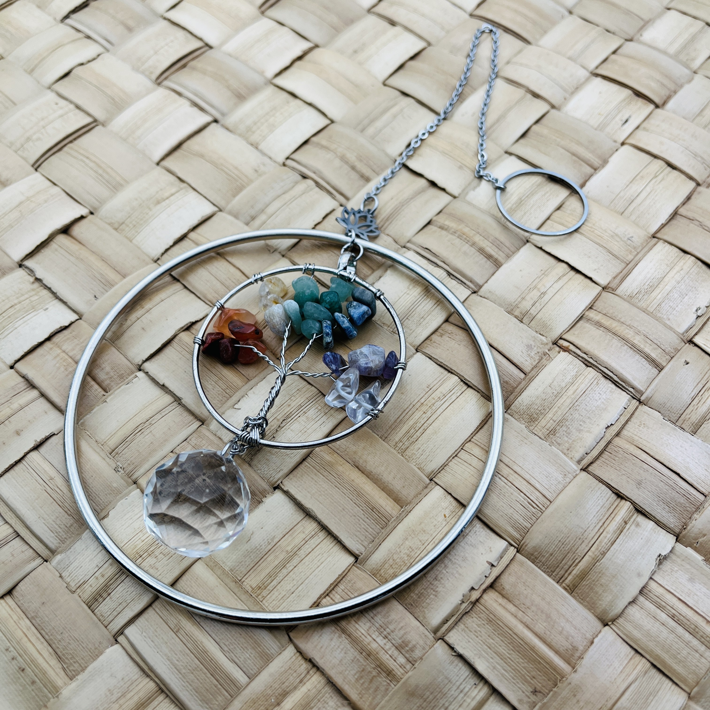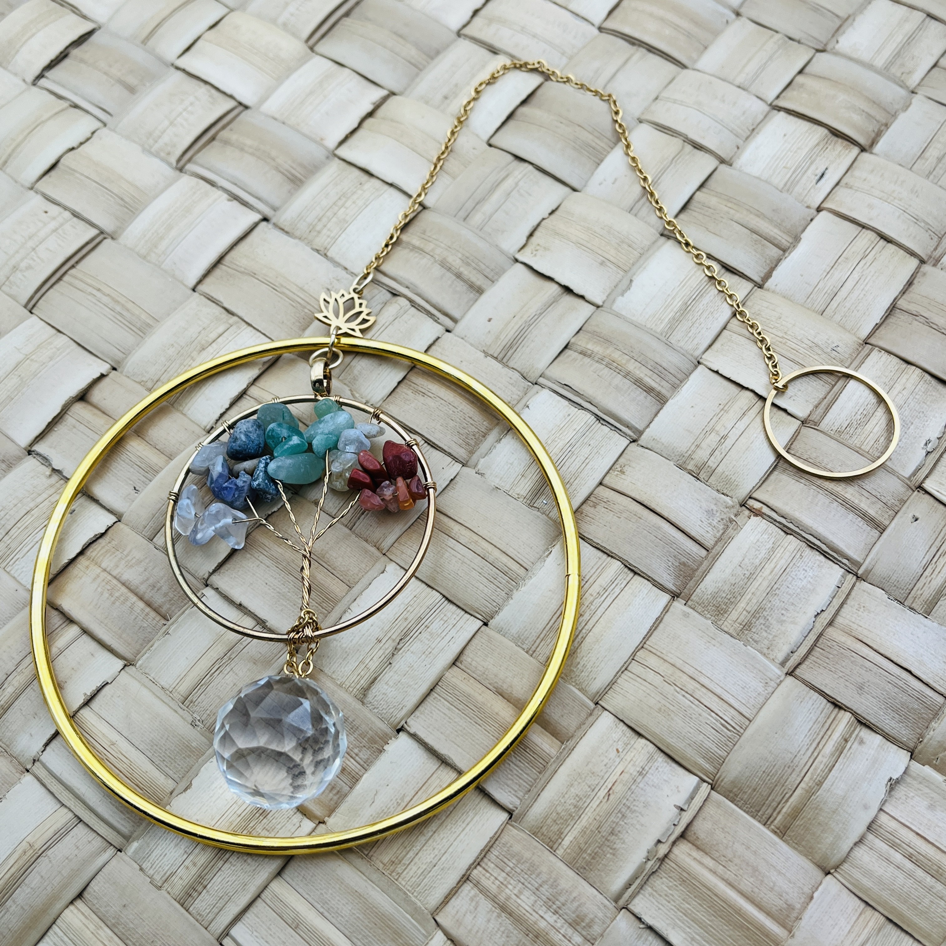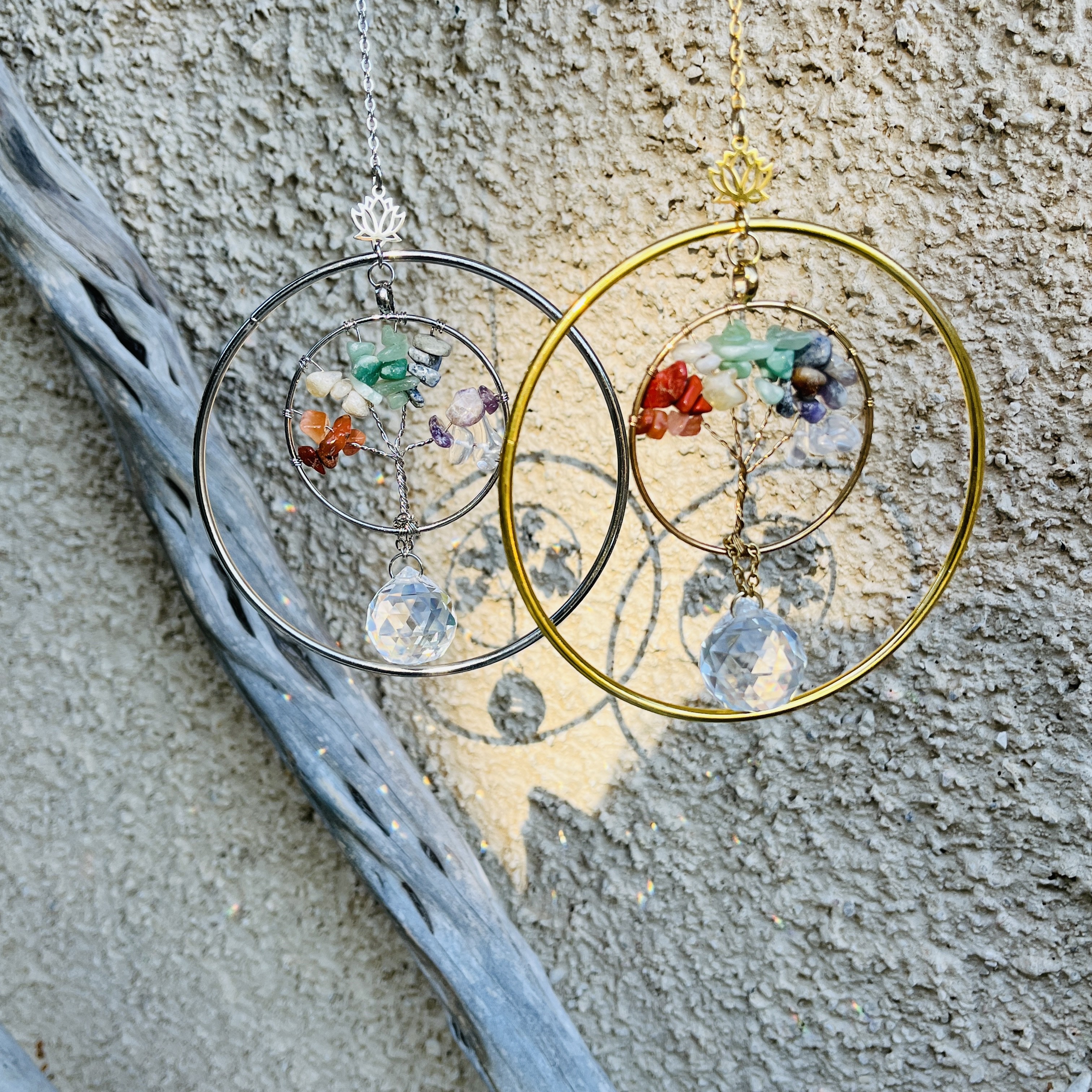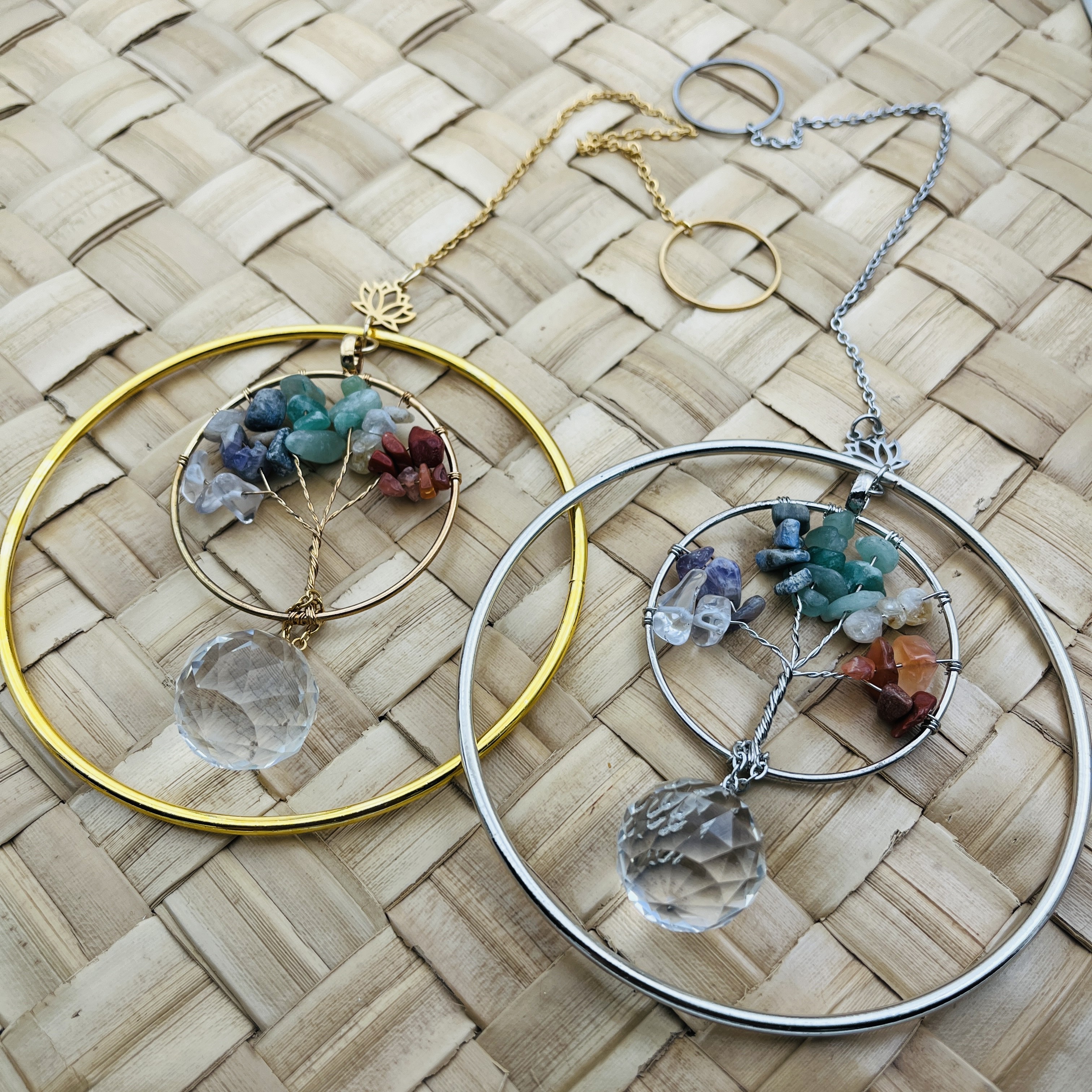 Chaque modèle est composé d’un double cercle orné d’un lotus assorti (argenté ou doré) renfermant un Arbre de Vie façonné à la main avec des pierres naturelles multicolores. En son centre, un cristal Feng Shui capte la lumière et diffuse de délicats reflets arc-en-ciel dans la pièce.