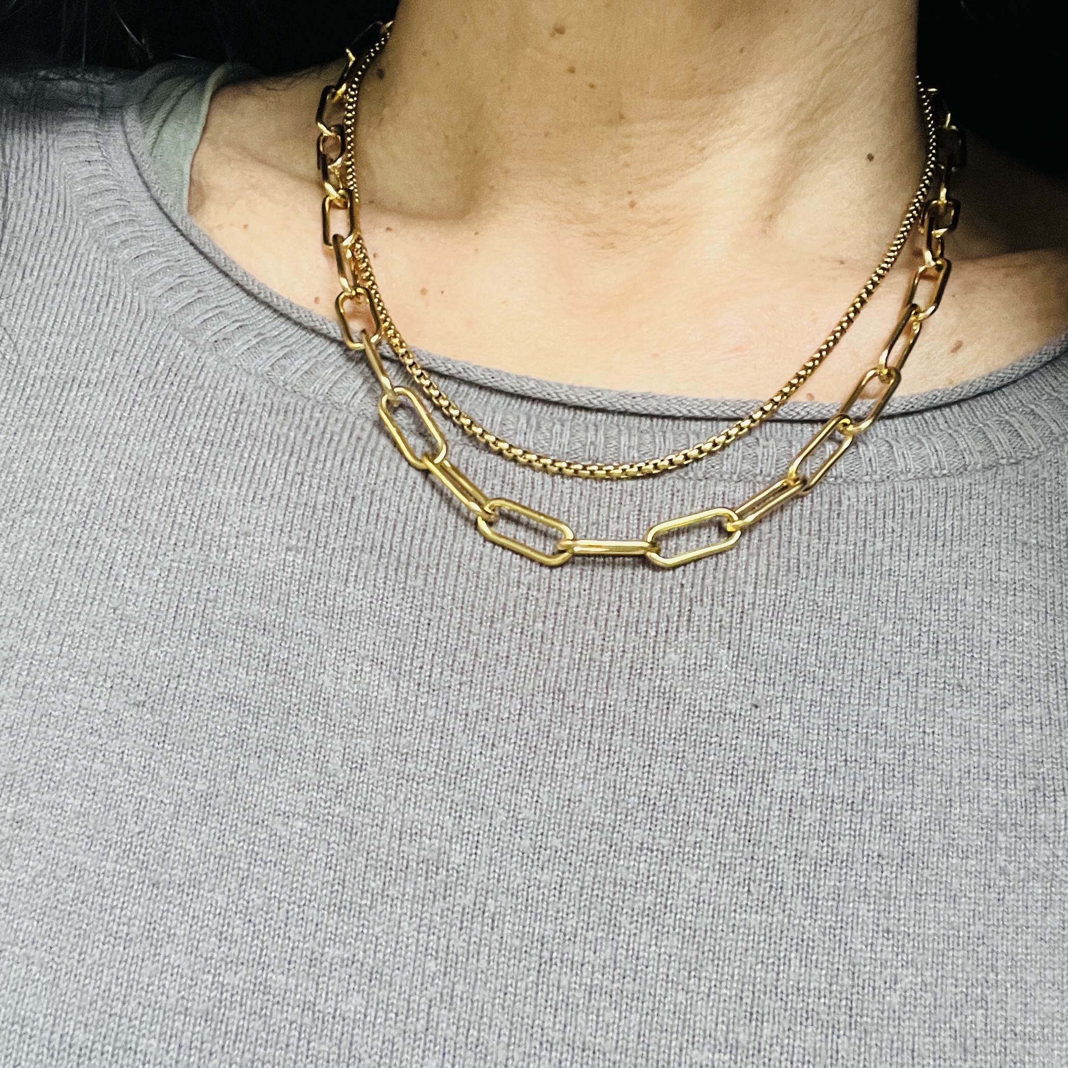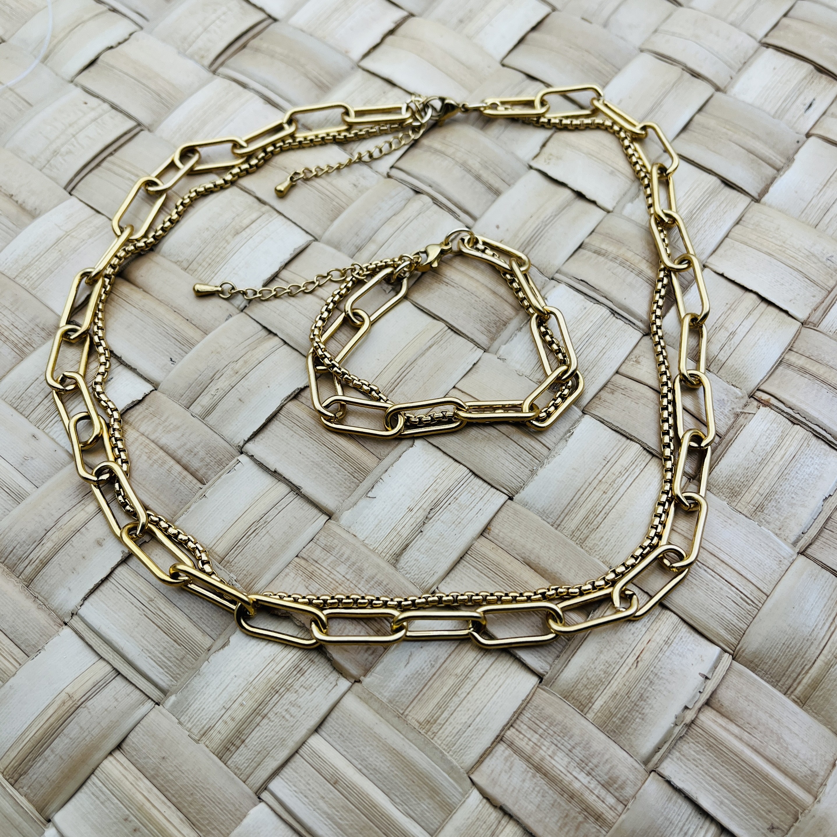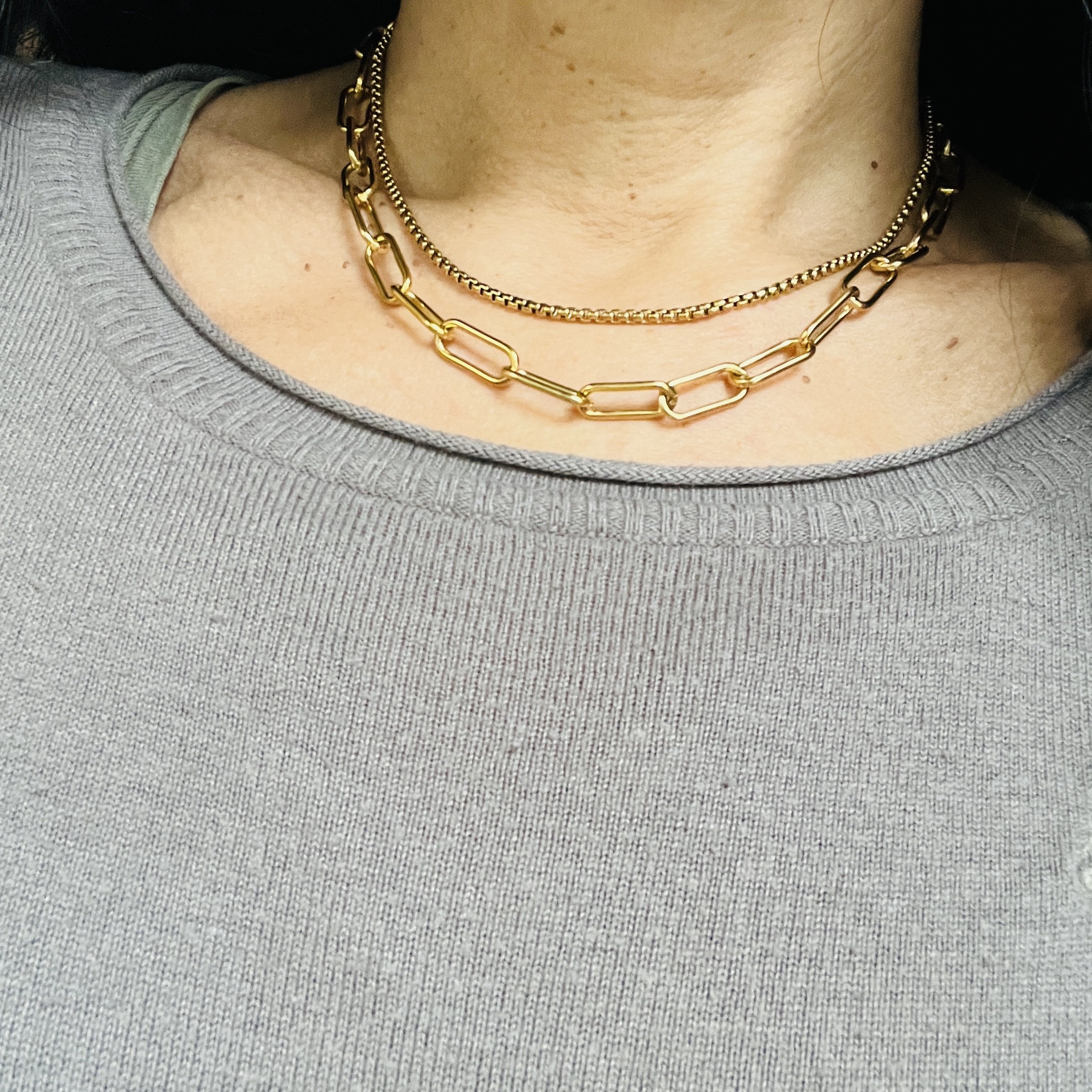 Élégante et moderne, cette parure associe deux styles de chaînes pour un rendu à la fois raffiné et tendance.