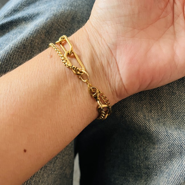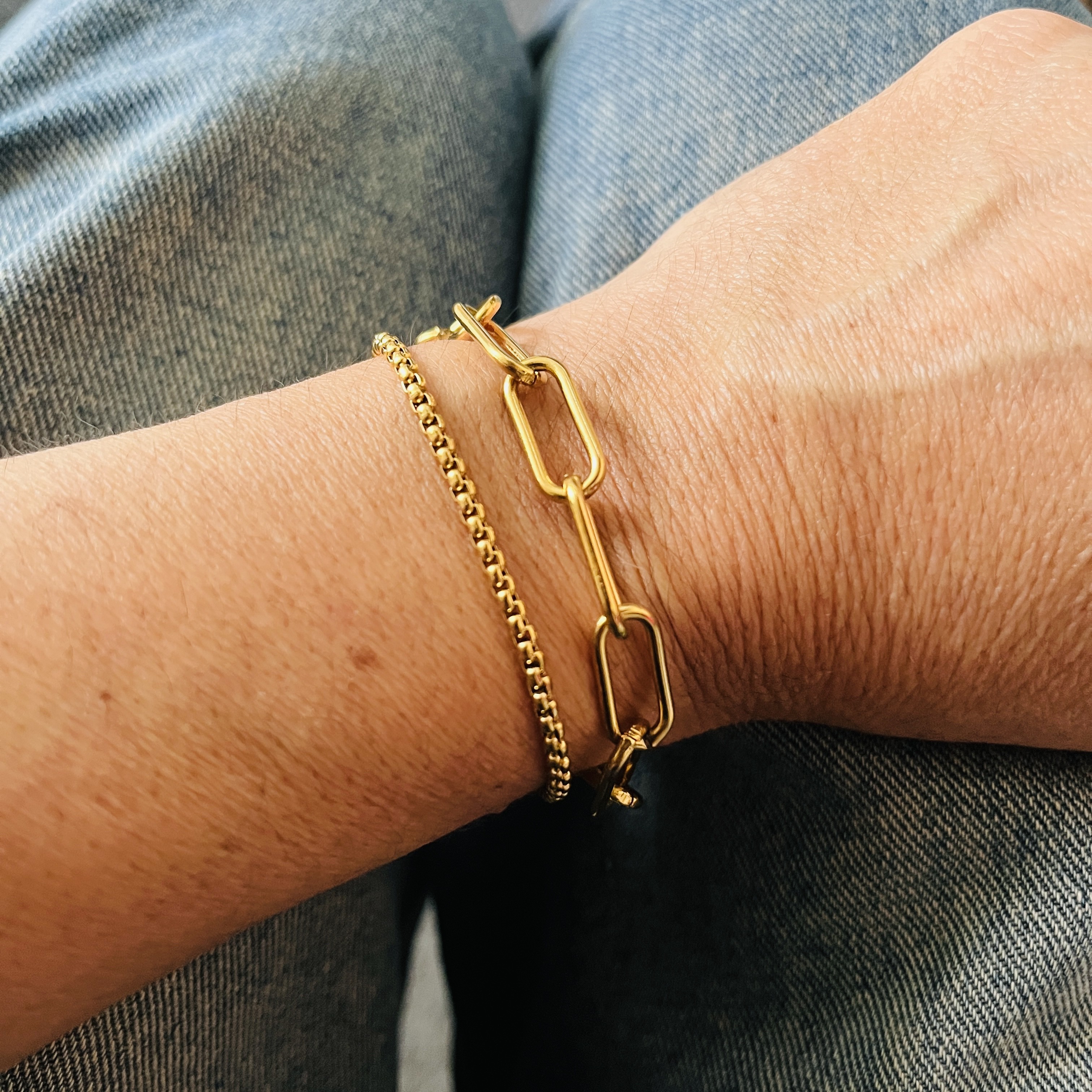 Le collier et le bracelet se composent d'une chaîne à gros maillons rectangulaires et d'une chaîne vénitienne plus fine, créant un équilibre parfait entre force et délicatesse.