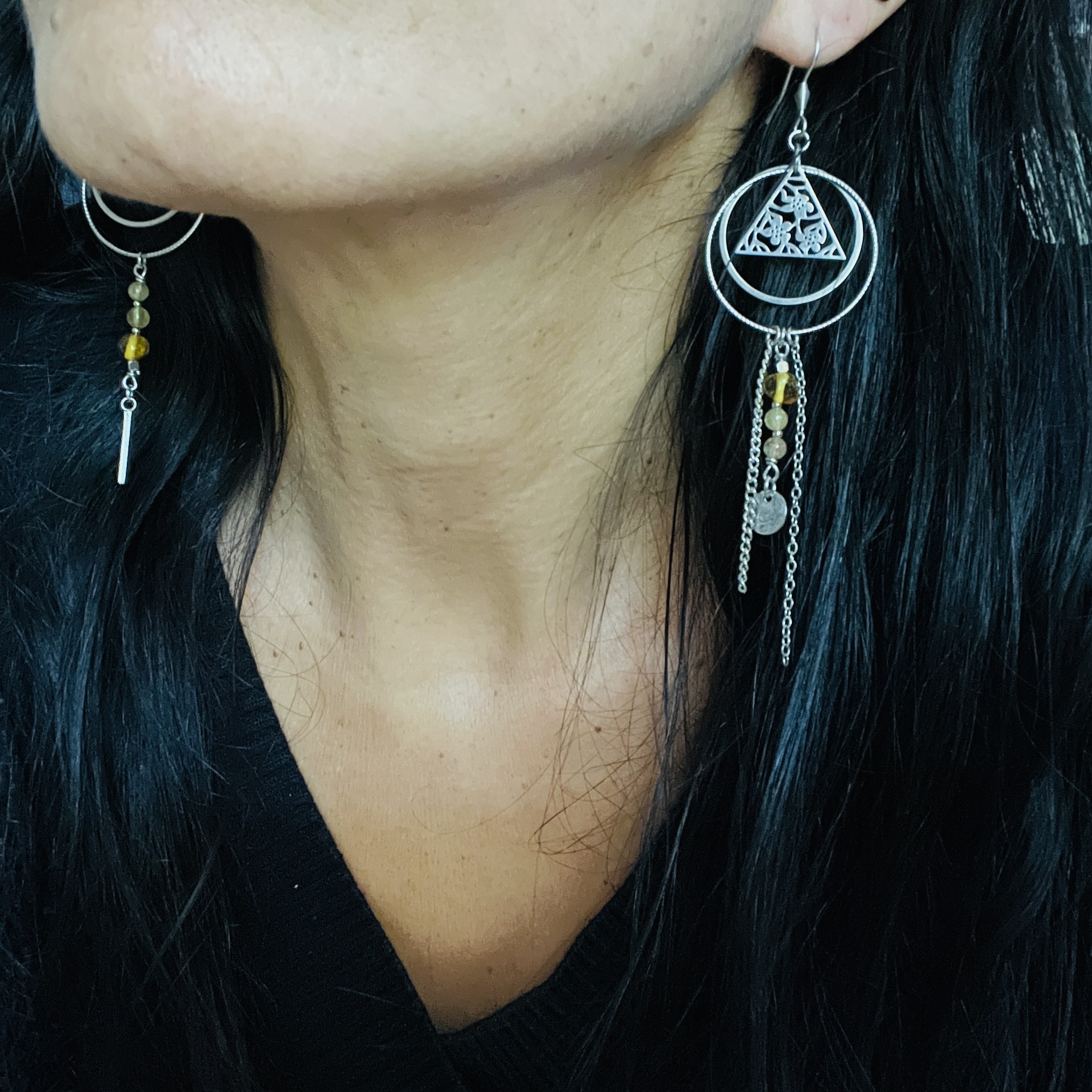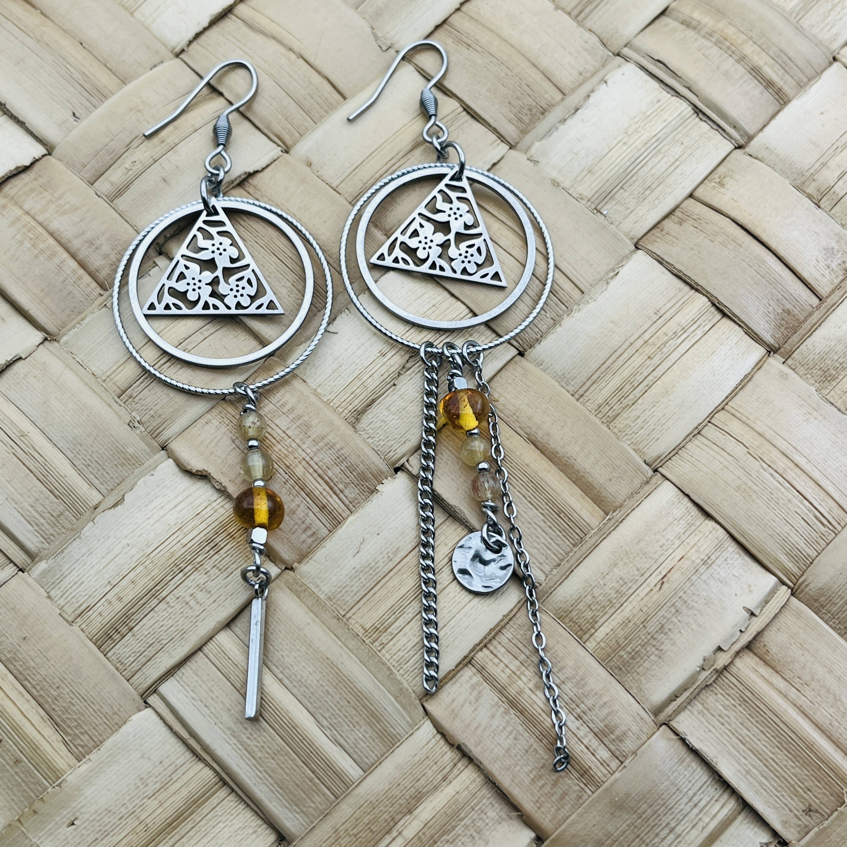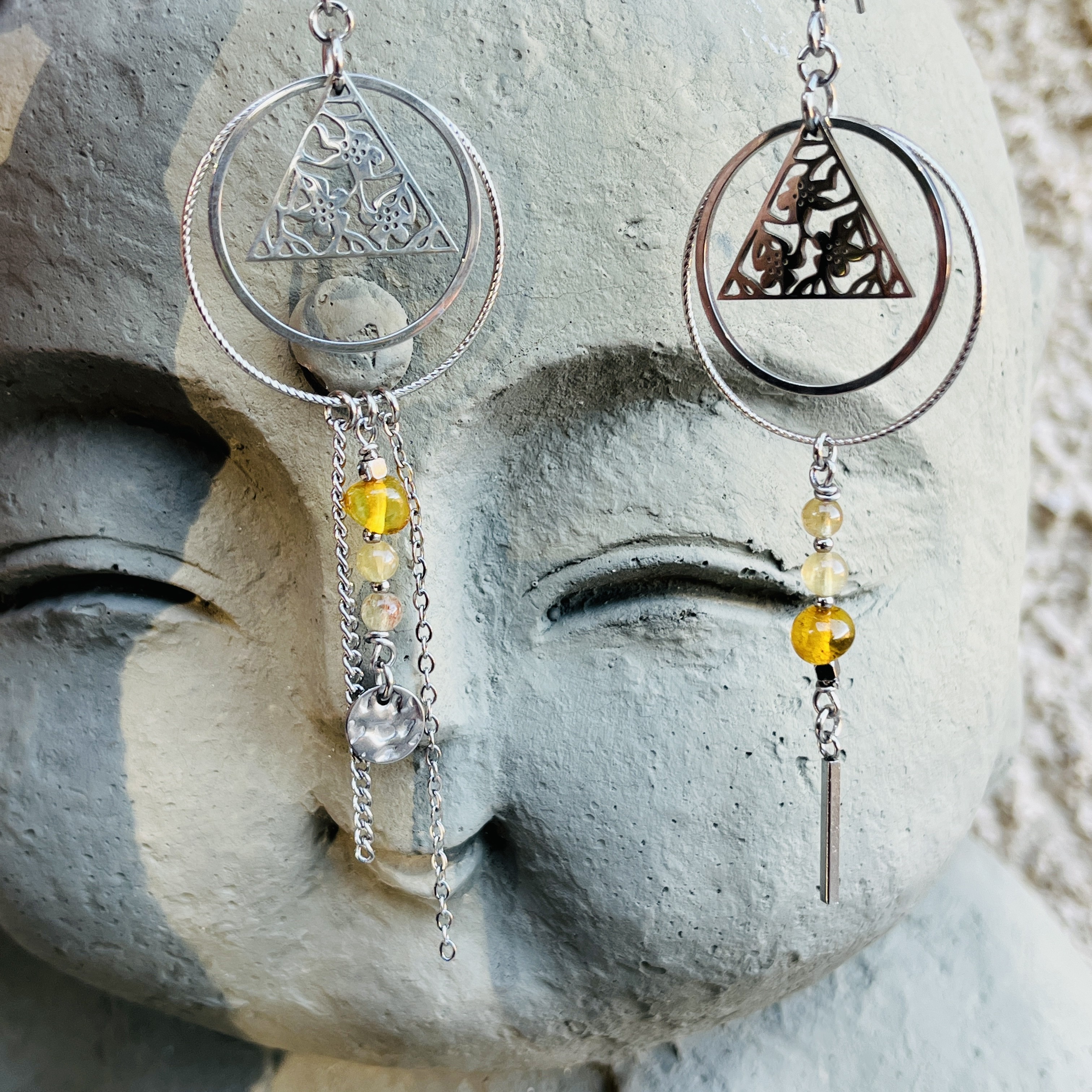 Un jeu d’équilibre et de lumière : ces boucles d’oreilles mêlent cercles et triangles ajourés en acier inoxydable pour une allure moderne et spirituelle.