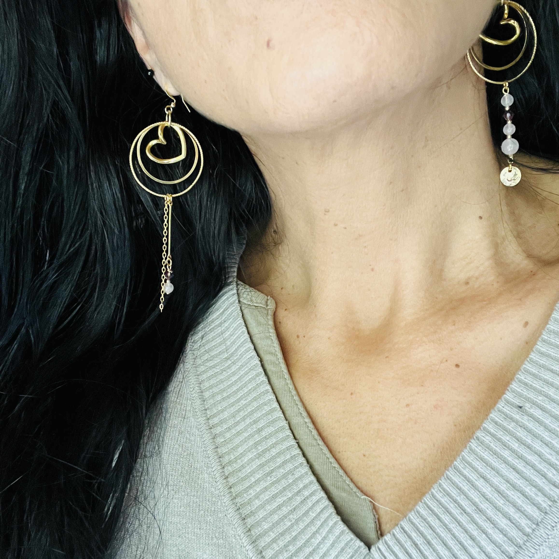 Réalisées en acier inoxydable doré, elles mettent en valeur de jolis cœurs ajourés suspendus à des cercles texturés, symbole d’amour et d’harmonie.