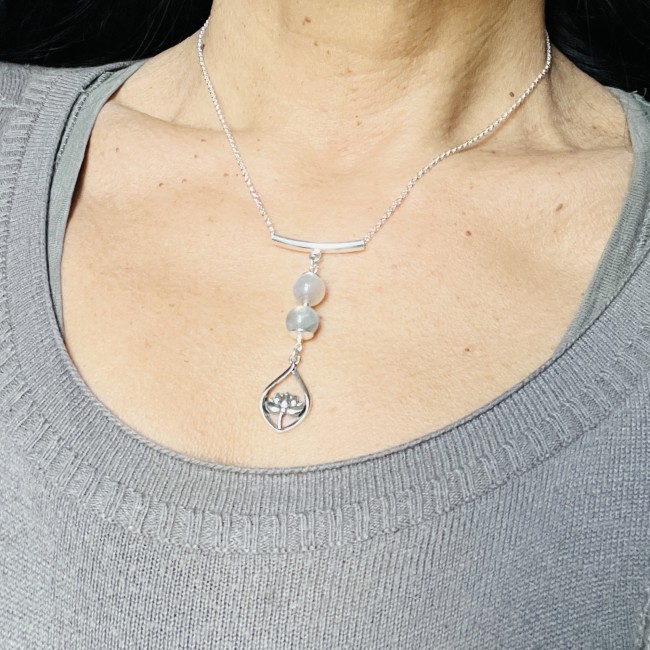 Son design épuré se compose d’une bélière tube contemporaine, de deux perles de labradorite naturelle aux reflets bleutés et d’un pendentif Lotus finement travaillé, symbole de pureté, de transformation et de sérénité.