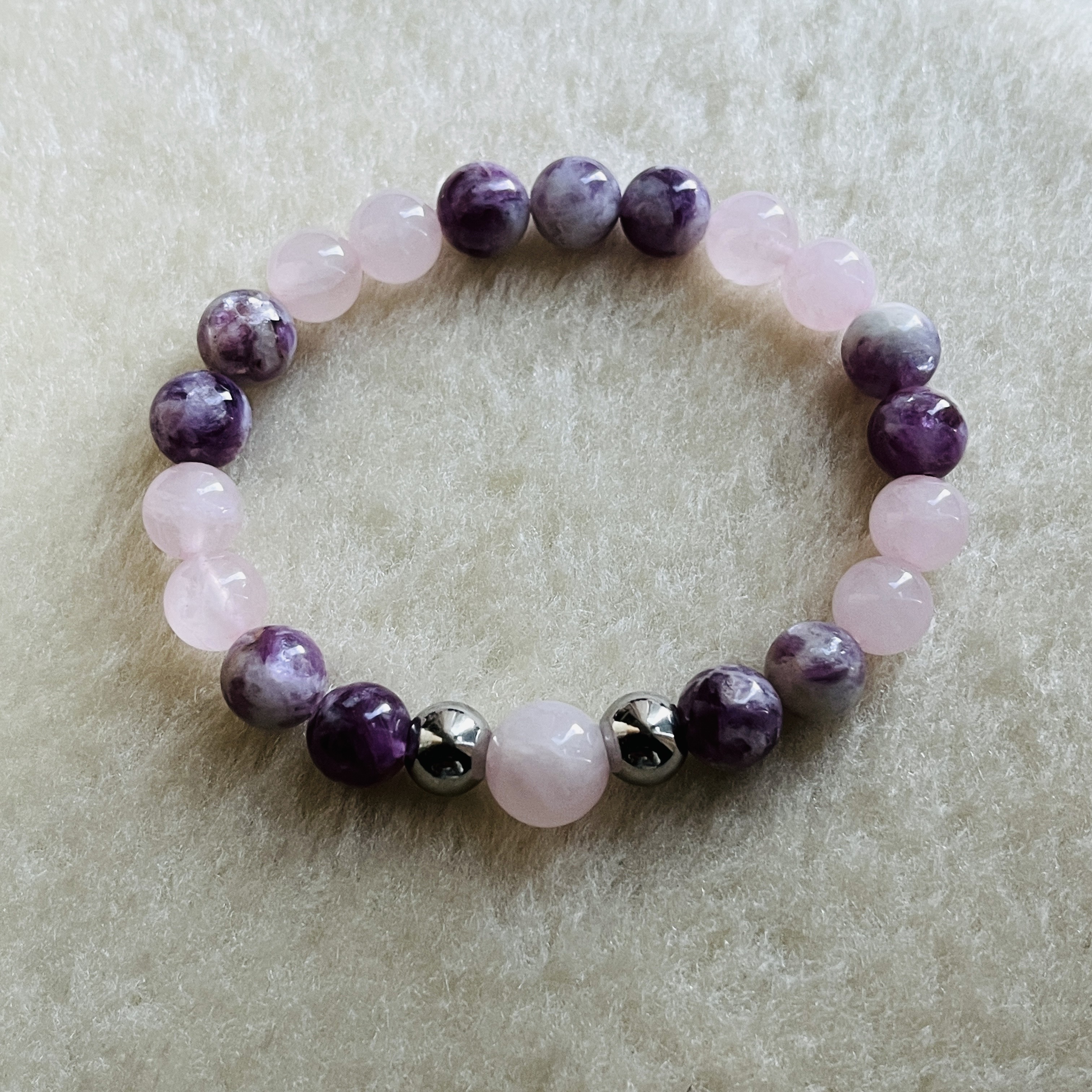 Un bracelet tout en douceur, pensé pour apporter apaisement émotionnel et énergie réconfortante. Il associe la tendresse du Quartz rose à la puissance calmante du Quartz lithium, avec une jolie perle centrale de 10 mm qui attire immédiatement le regard.