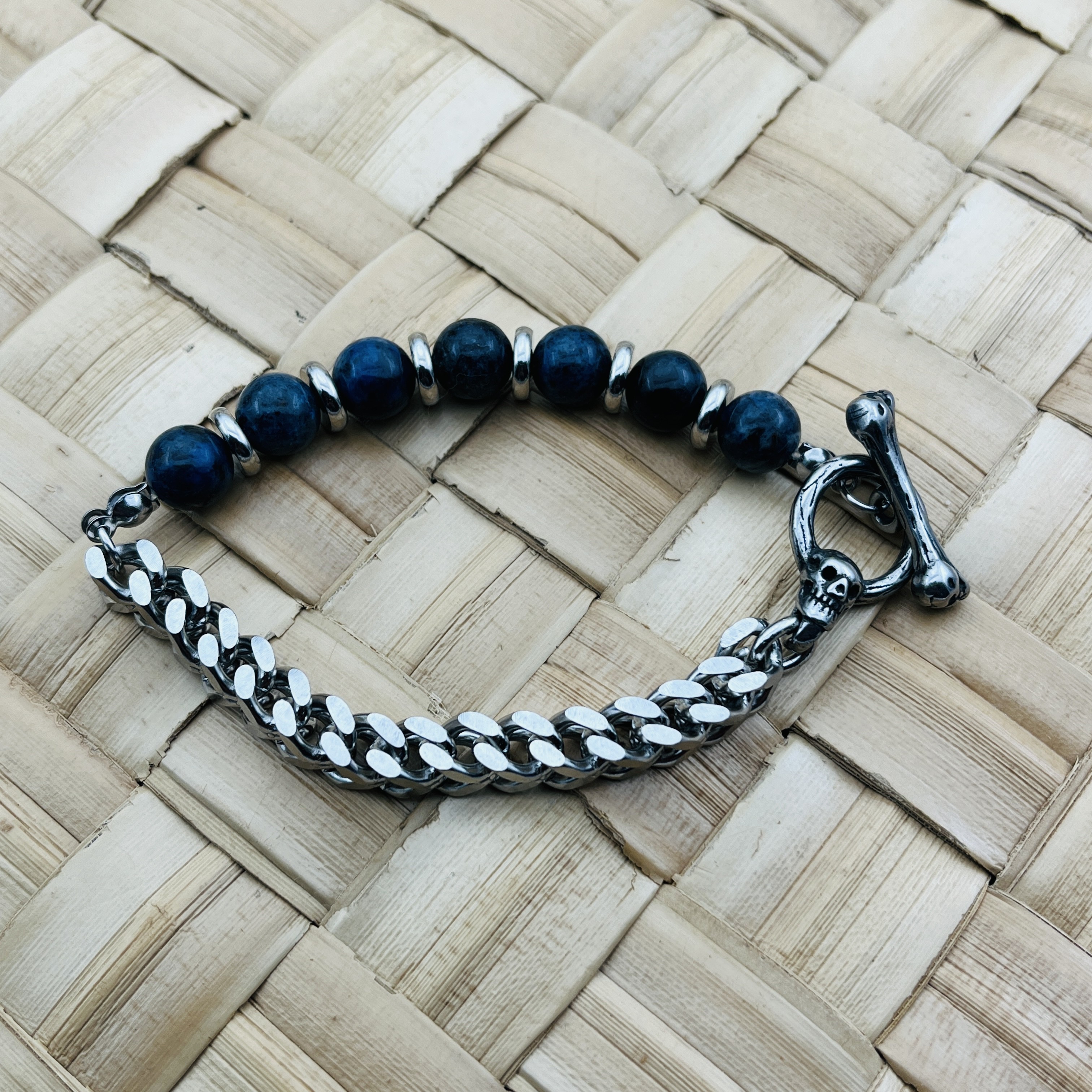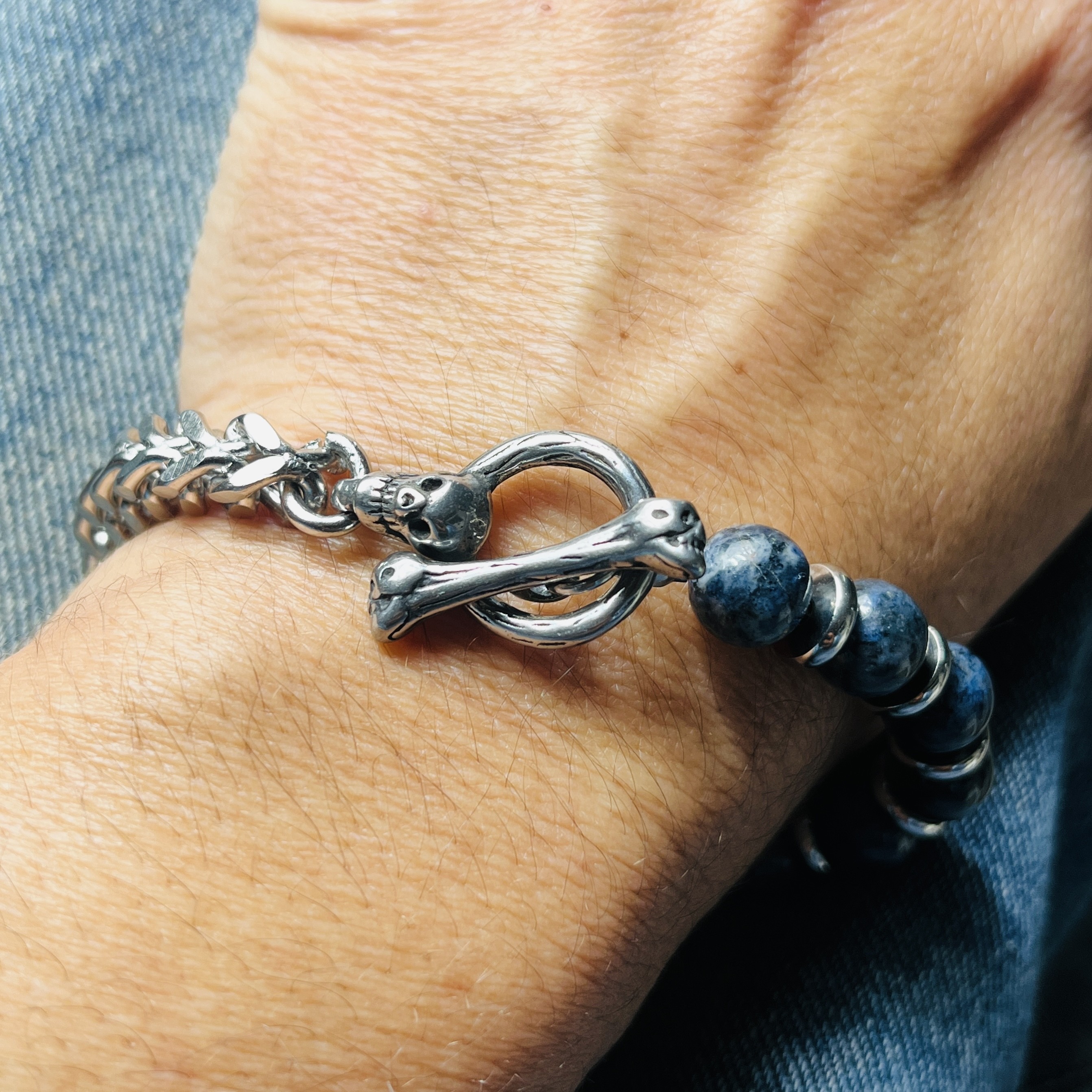 Bracelet Homme bi matière avec un côté chaîne épaisse/carrée Foxtail et un côté pierres en perles Dumortierite et rondelles en acier, agrémenté d'un fermoir Toggle tête de mort.