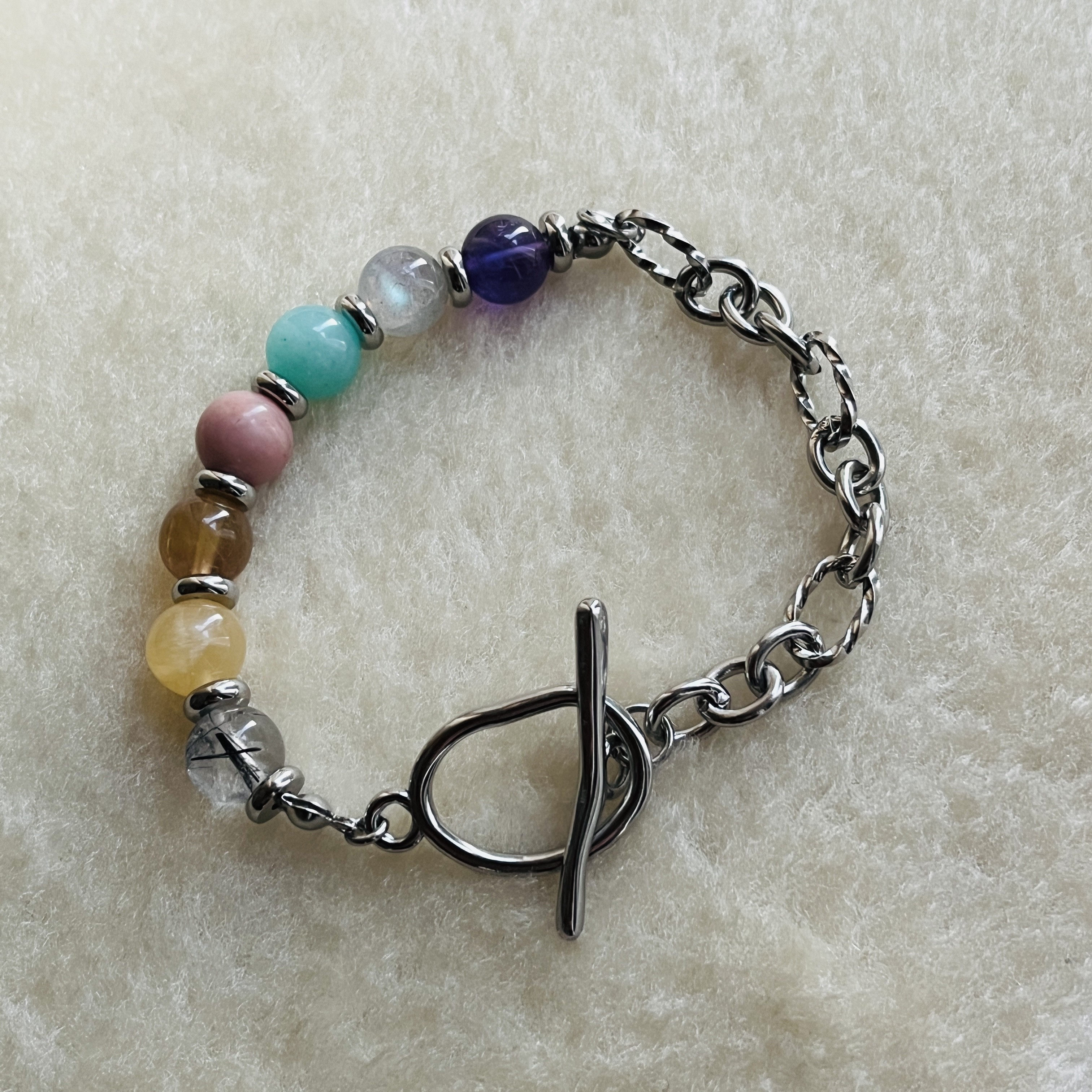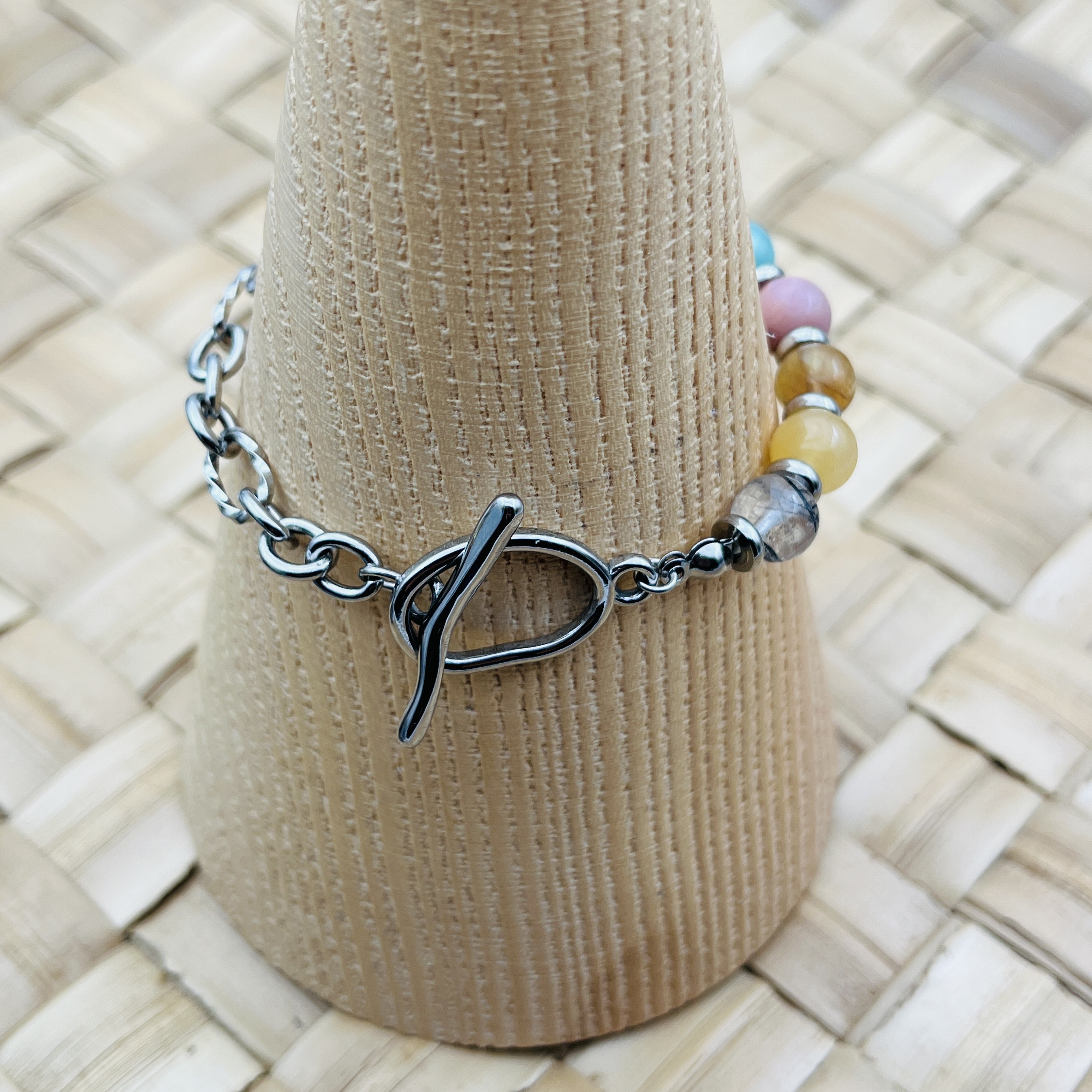 Monté sur une chaîne Figaro en acier inoxydable avec un fermoir ovale Toggle, ce bracelet allie solidité, élégance et belles énergies.