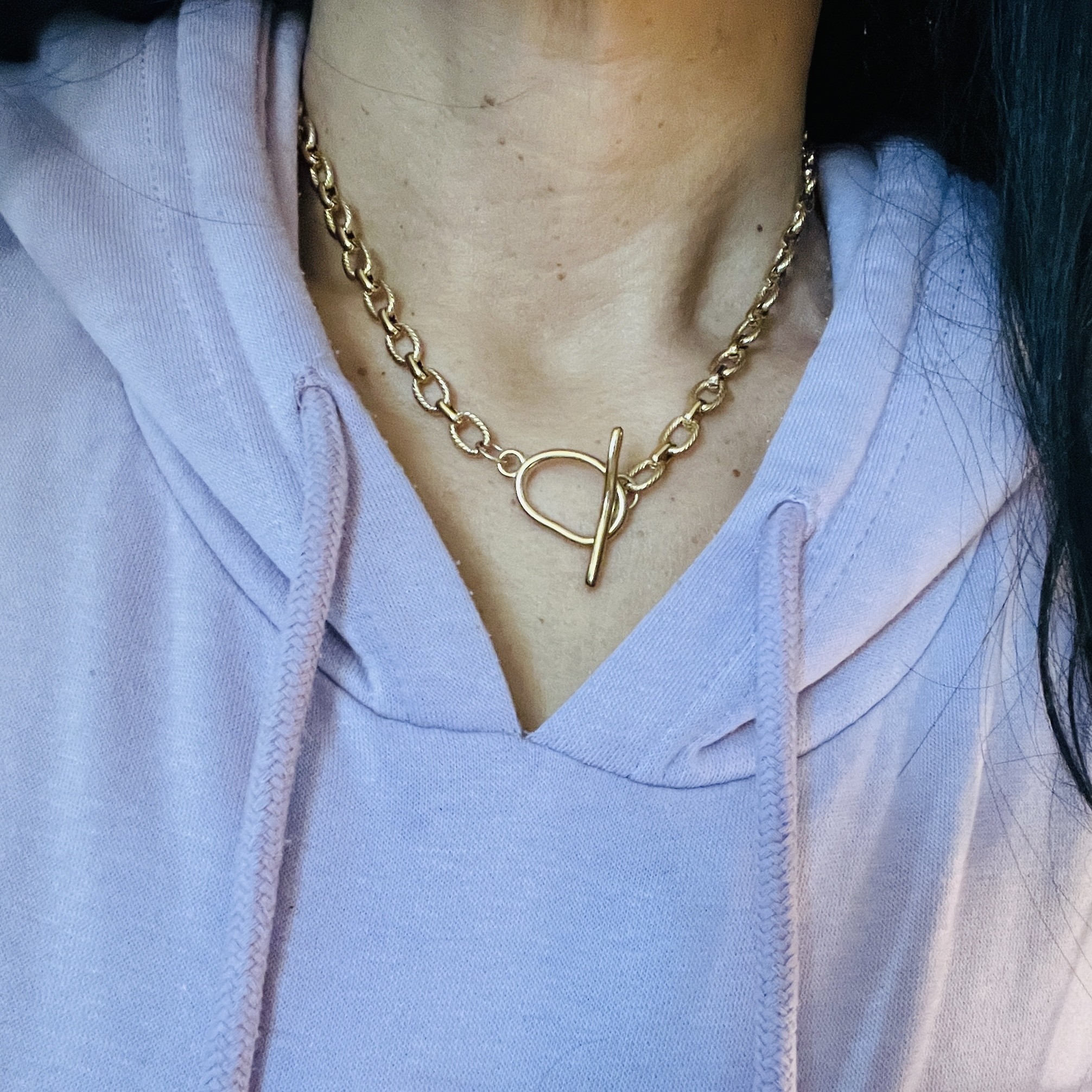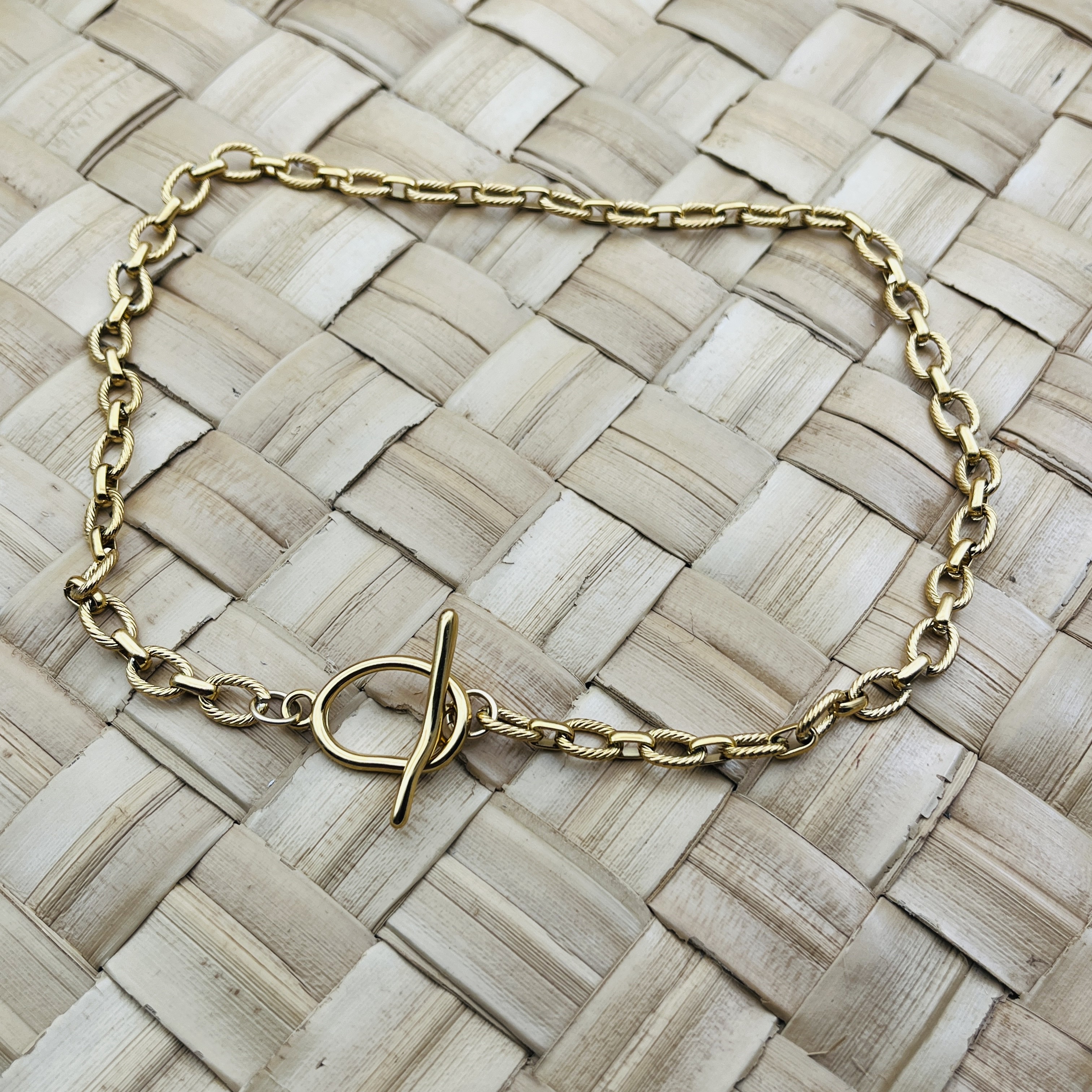 Collier original et élégant, chaîne épaisse maille forçat à gros anneaux décorés, fermoir Toggle sur le devant.