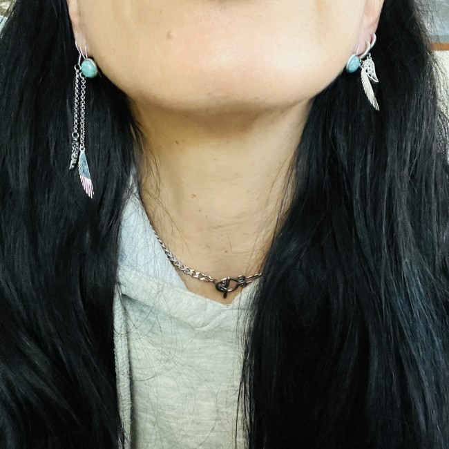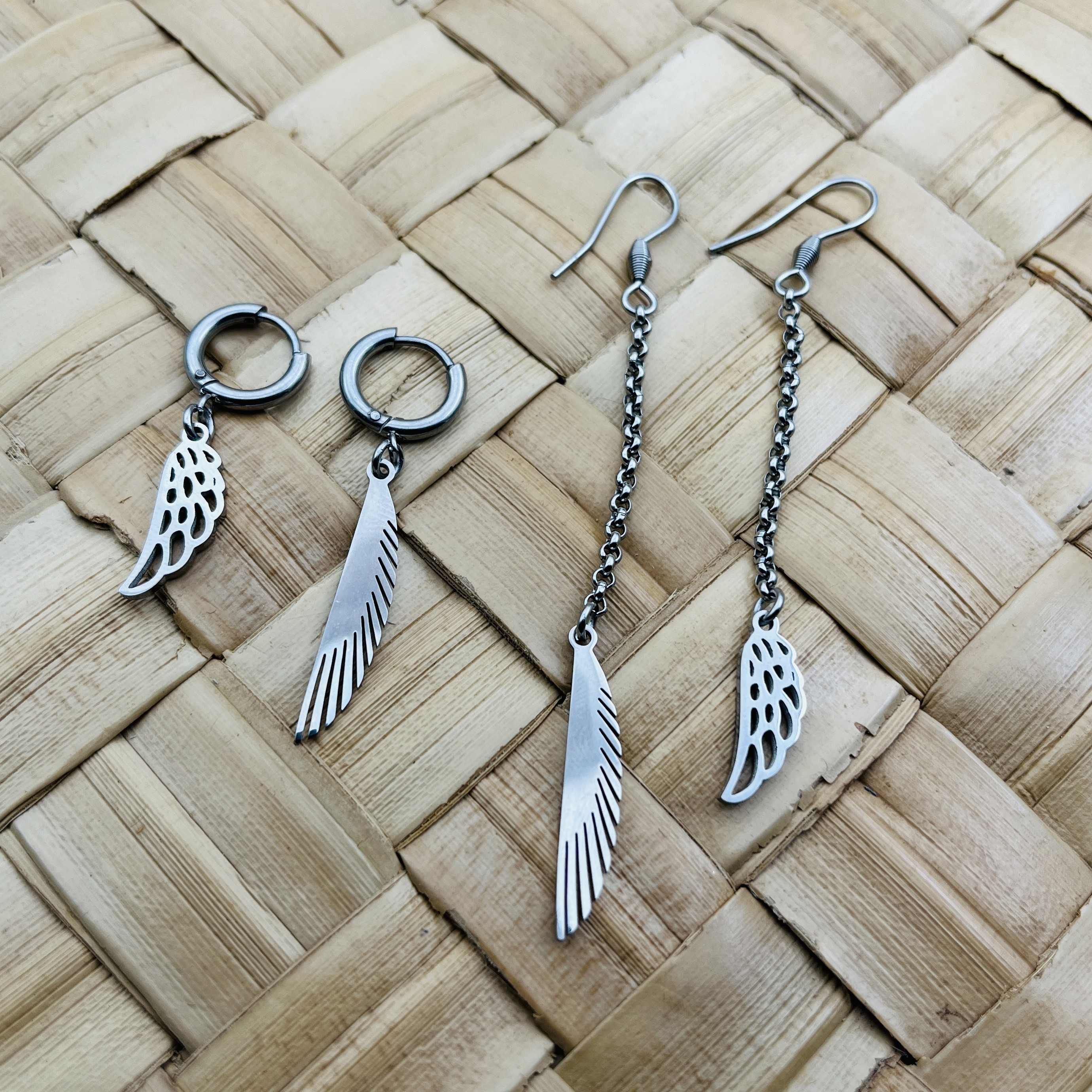 Boucles d'oreilles en deux versions dépareillées, ailes longue ou courtes, sur dormeuses ou sur crochets avec chaînes.