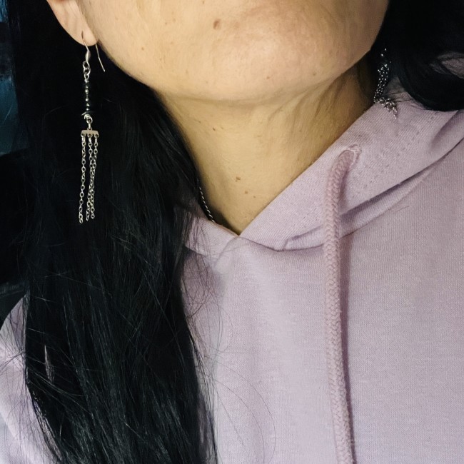 Élégantes et affirmées, ces boucles d’oreilles mêlent la profondeur de l’onyx naturel à la fluidité des chaînes en acier inoxydable. Leur design vertical allonge la silhouette et apporte un mouvement subtil à chaque geste.