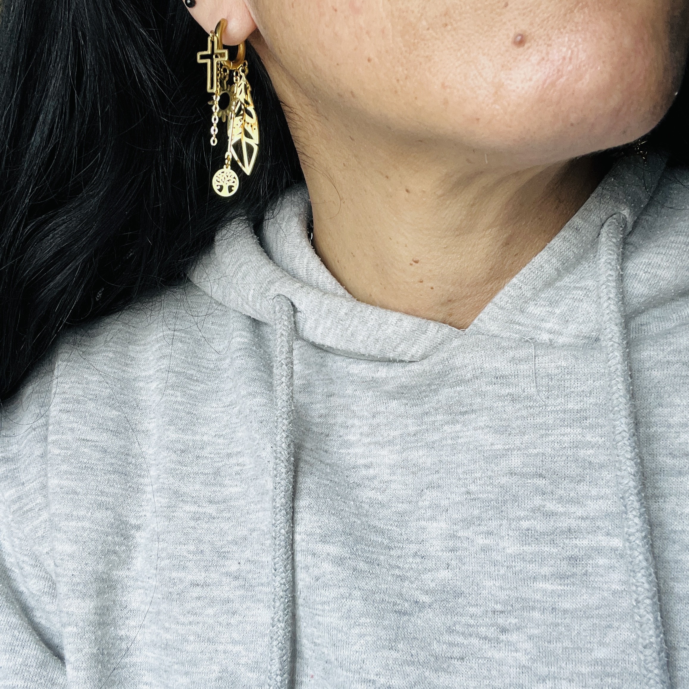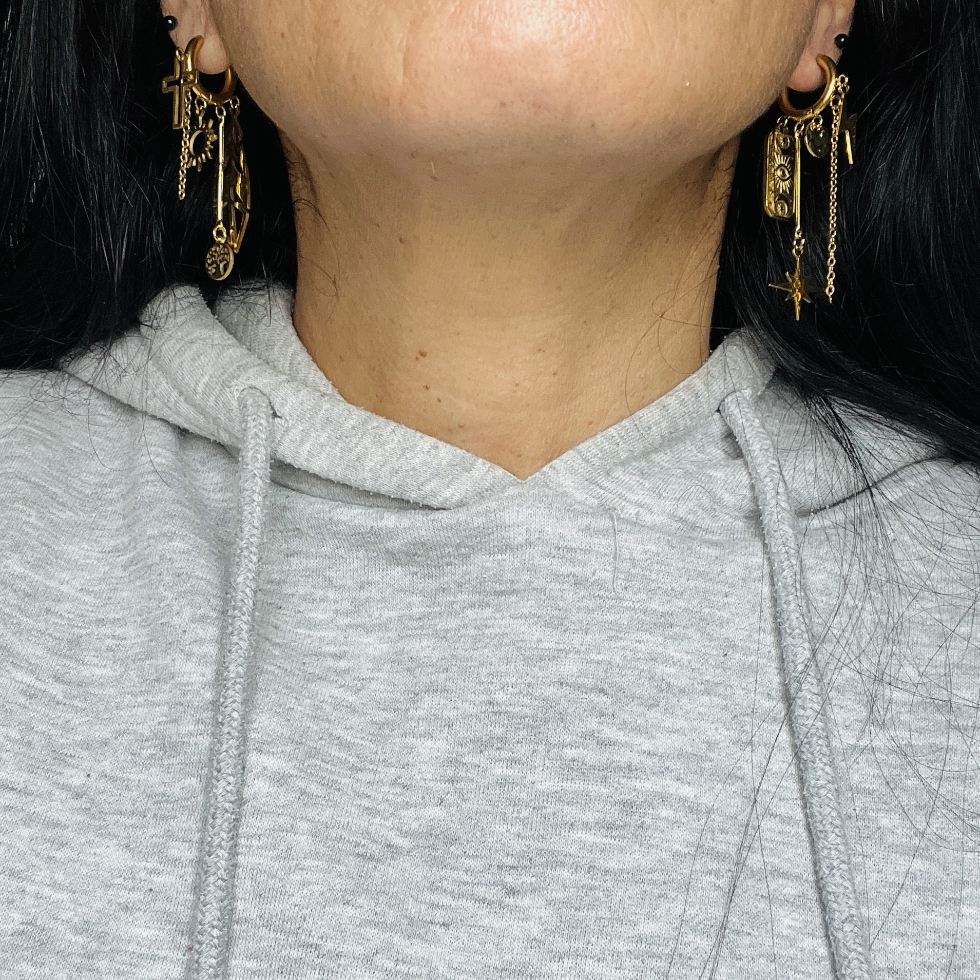 Dormeuses en acier inoxydable doré, ornées de multiples breloques symboliques : éclair, chaîne, sequin, étoile, mauvais œil, croix, soleil, arbre de vie et plume.