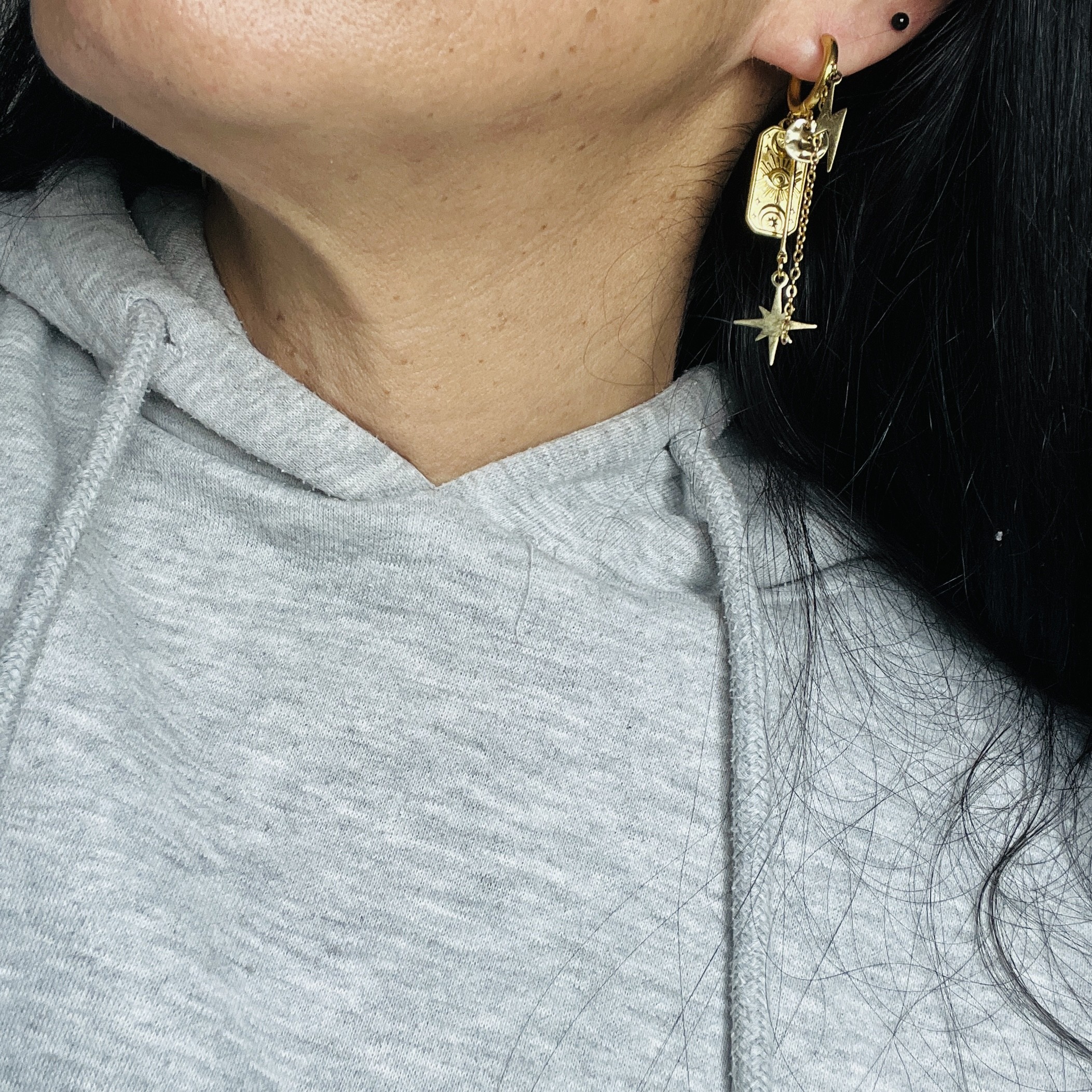 Chaque élément apporte sa propre énergie, créant un bijou audacieux et lumineux, à la fois protecteur et spirituel. Ces boucles au style affirmé subliment le visage et racontent une histoire, entre force, intuition et liberté.