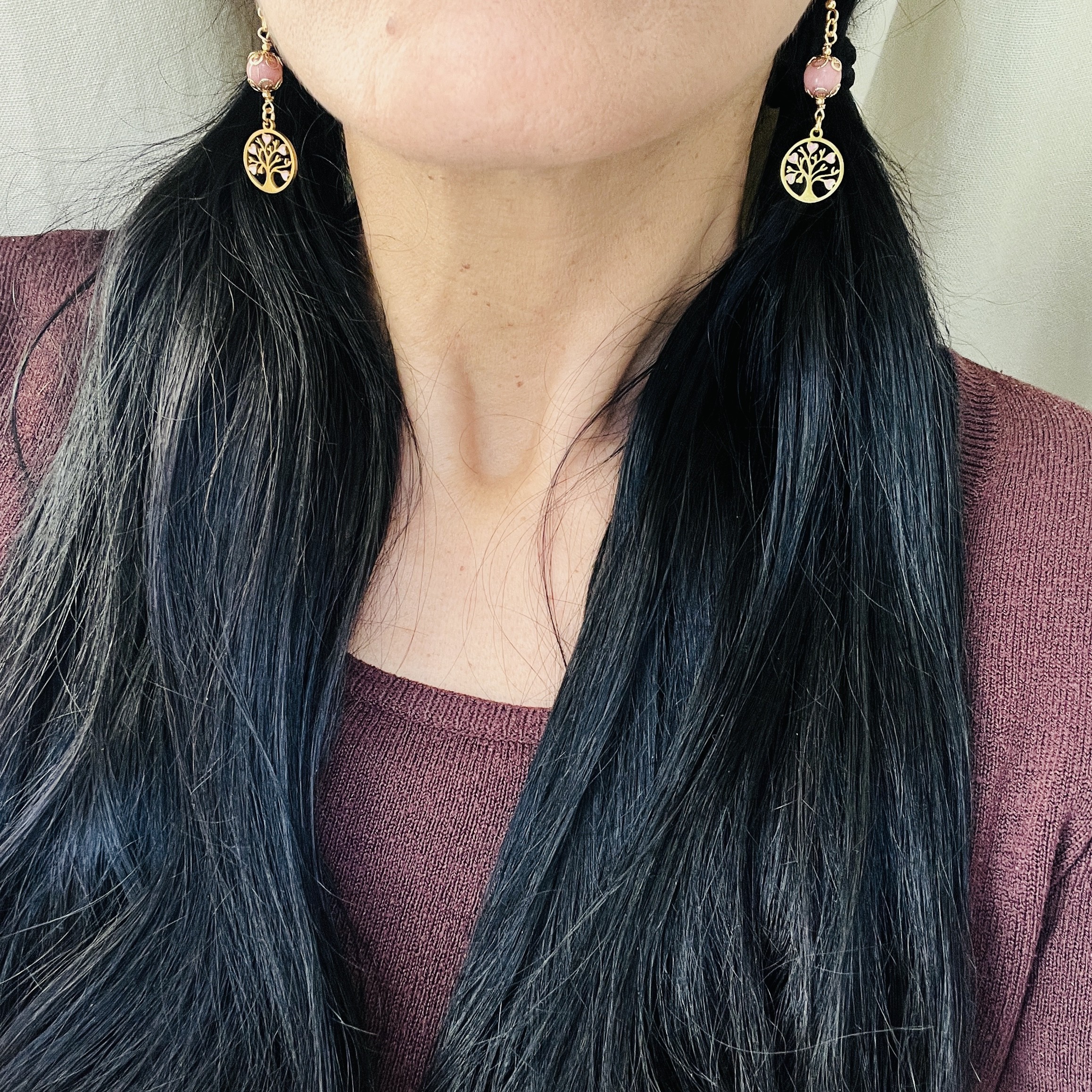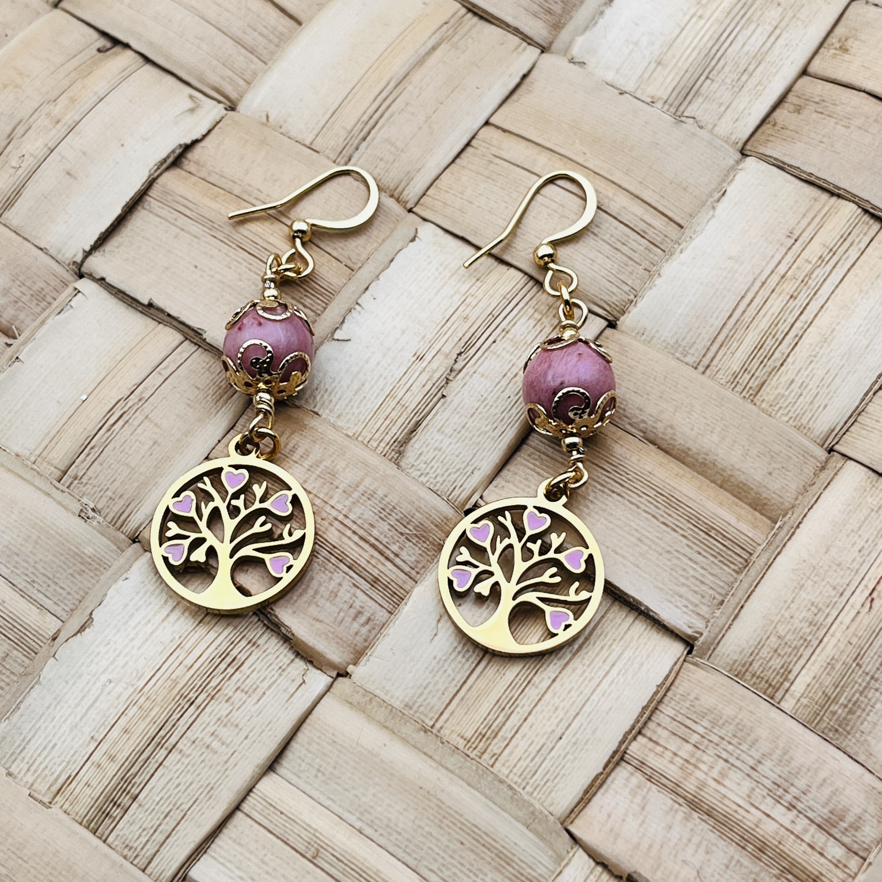 Boucles d'oreilles de StValentin avec ses perles Rhodonite délicatement parées de jolies coupelles ajourées plaquées Or 18k et de breloques Arbres parsemées de cœurs roses.