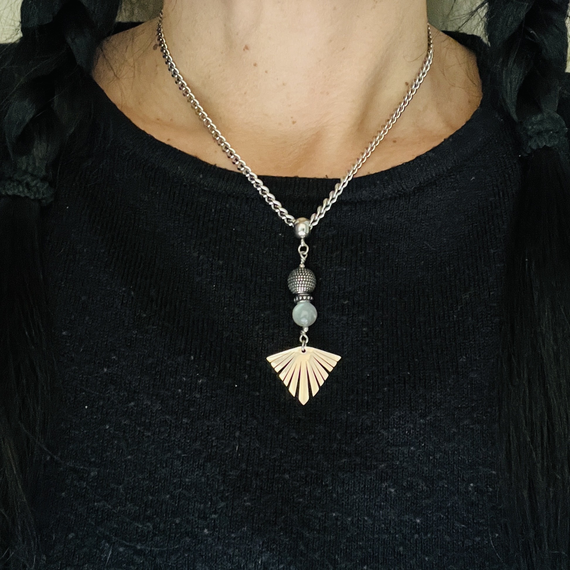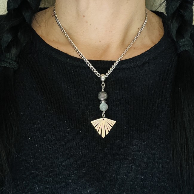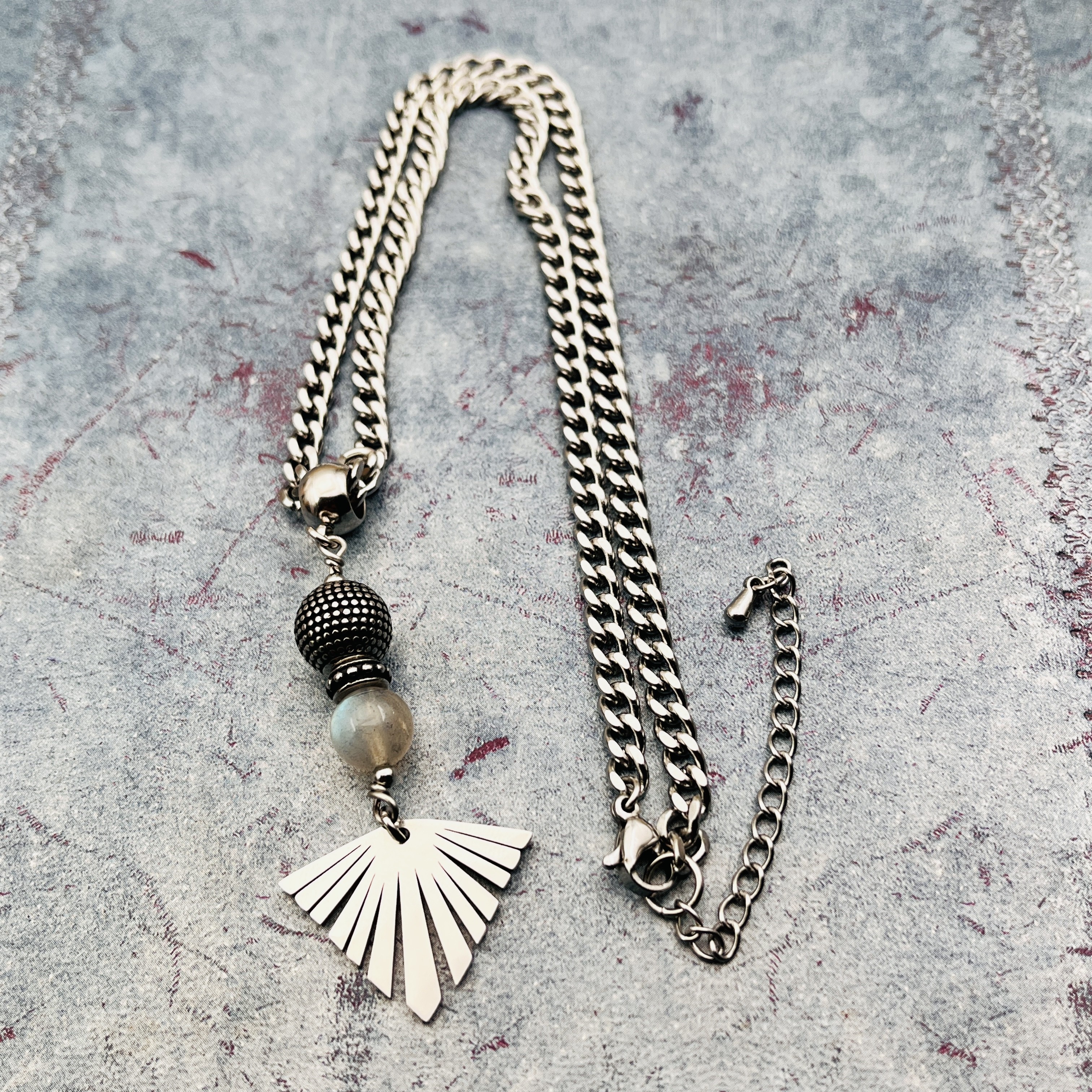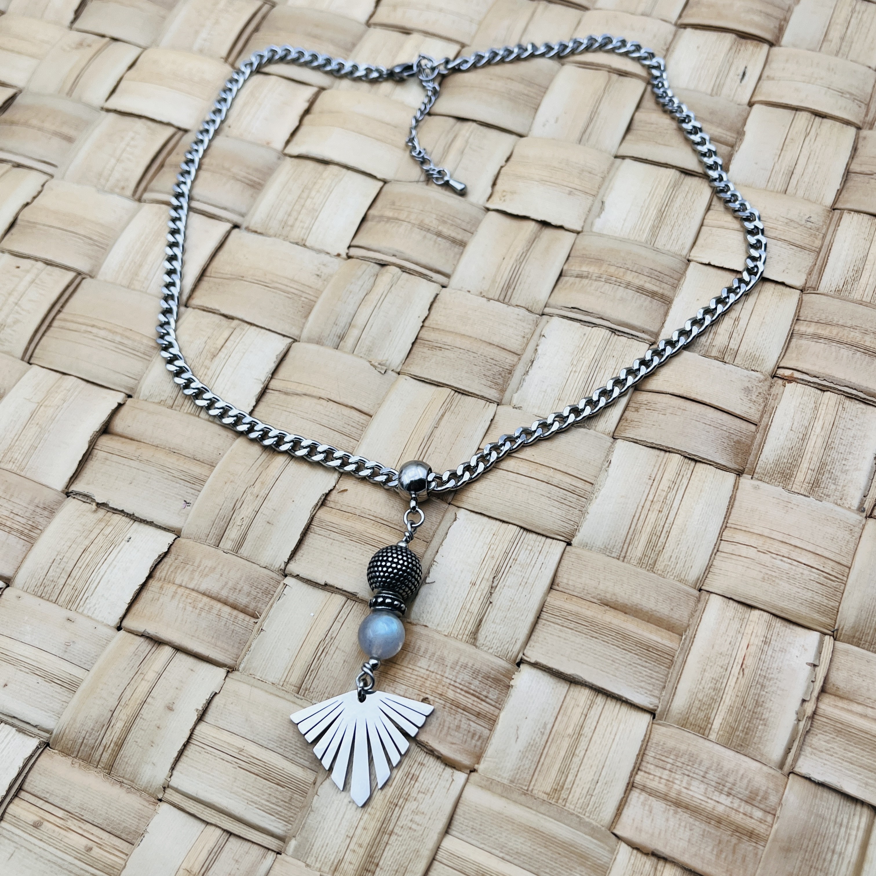 Superbe collier en pièce unique composé d'une jolie Labradorite aux reflets bleus, perle et rondelle pois, terminé par une breloque éventail, sur une chaîne épaisse maille cheval.