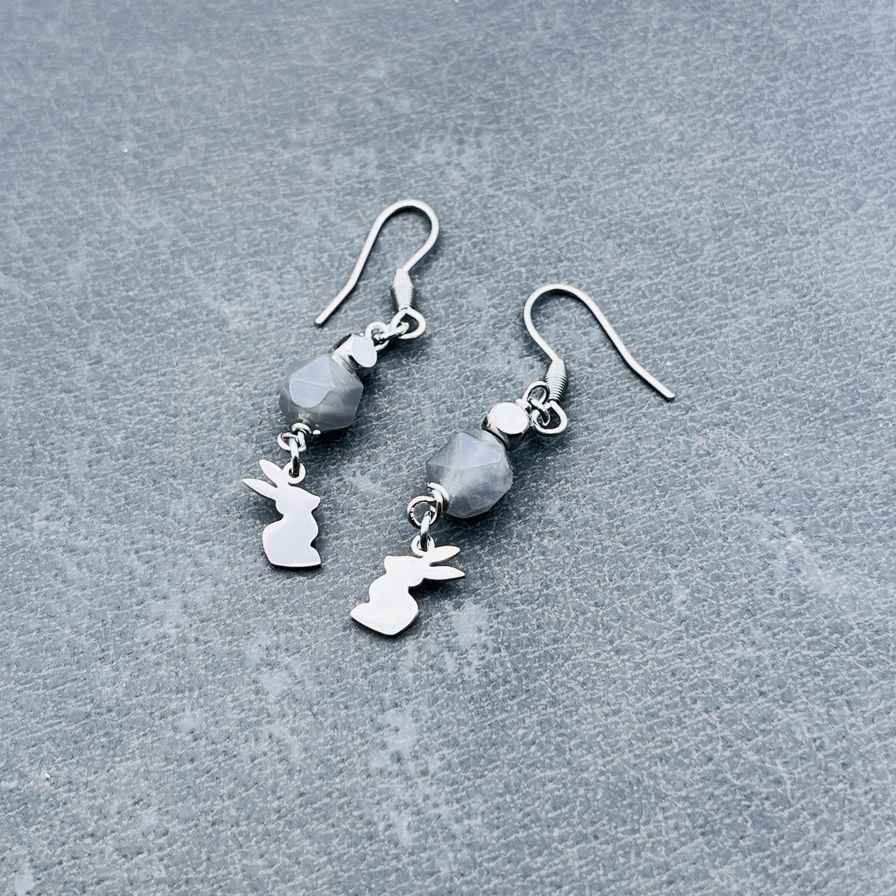 Jolies petites boucles avec perles de Quartz girasol facettées surmontées de cubes argentés avec des pendants Lapins.
