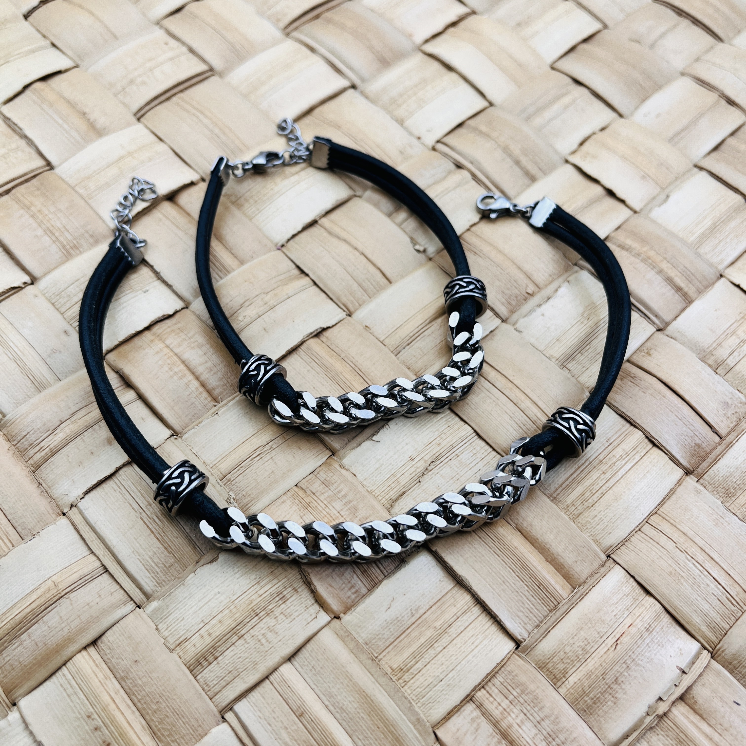 Bracelets cuir et chaîne Foxtail avec perles décorée.