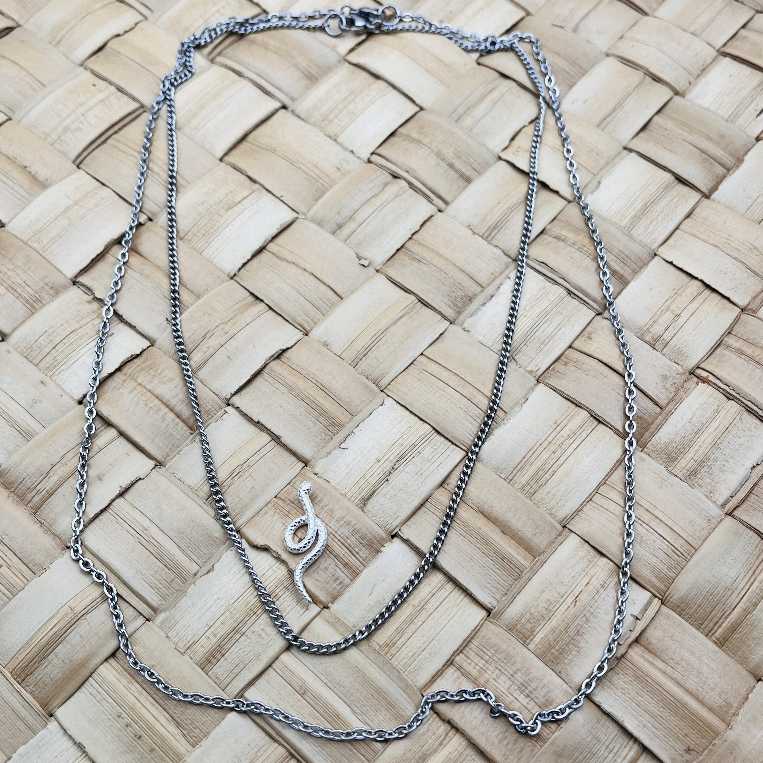 Deux chaînes, maille forçat et maille cheval, respectivement de 55 et 45cm en acier inoxydable et une breloque serpent en Argent 925