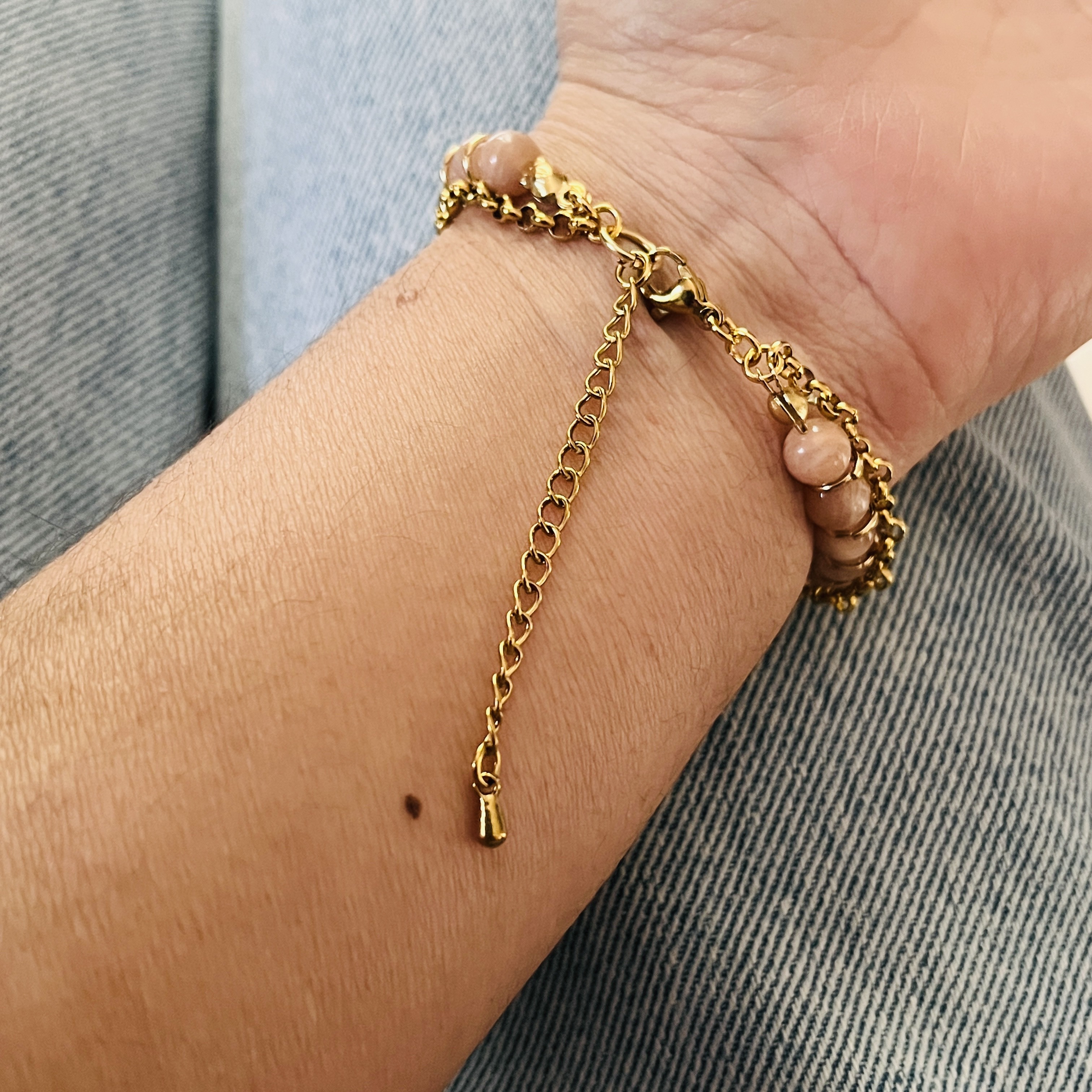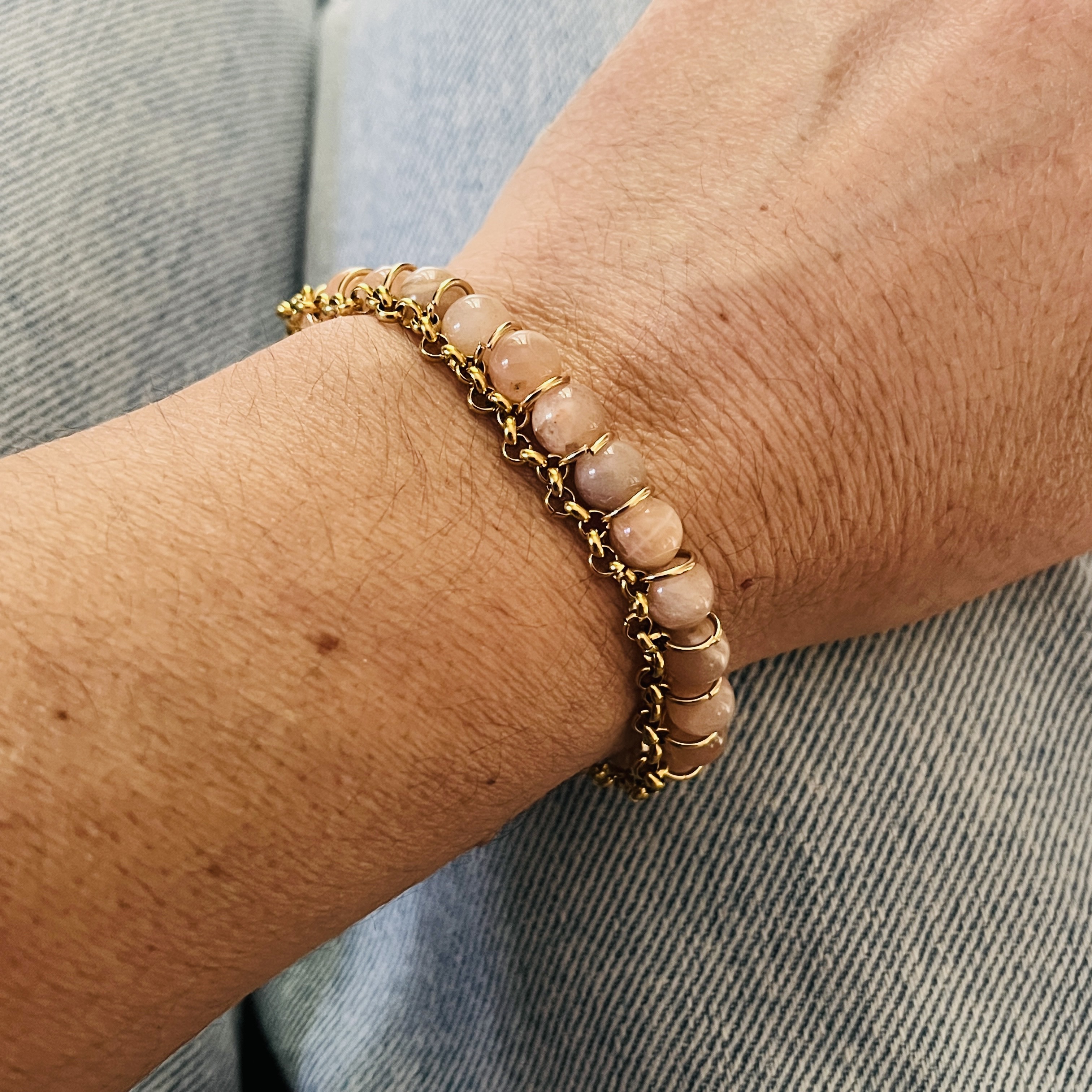 Bracelet Pierre de Soleil avec chaîne, ici maillle Jaseron relié au rang perlé par anneaux.