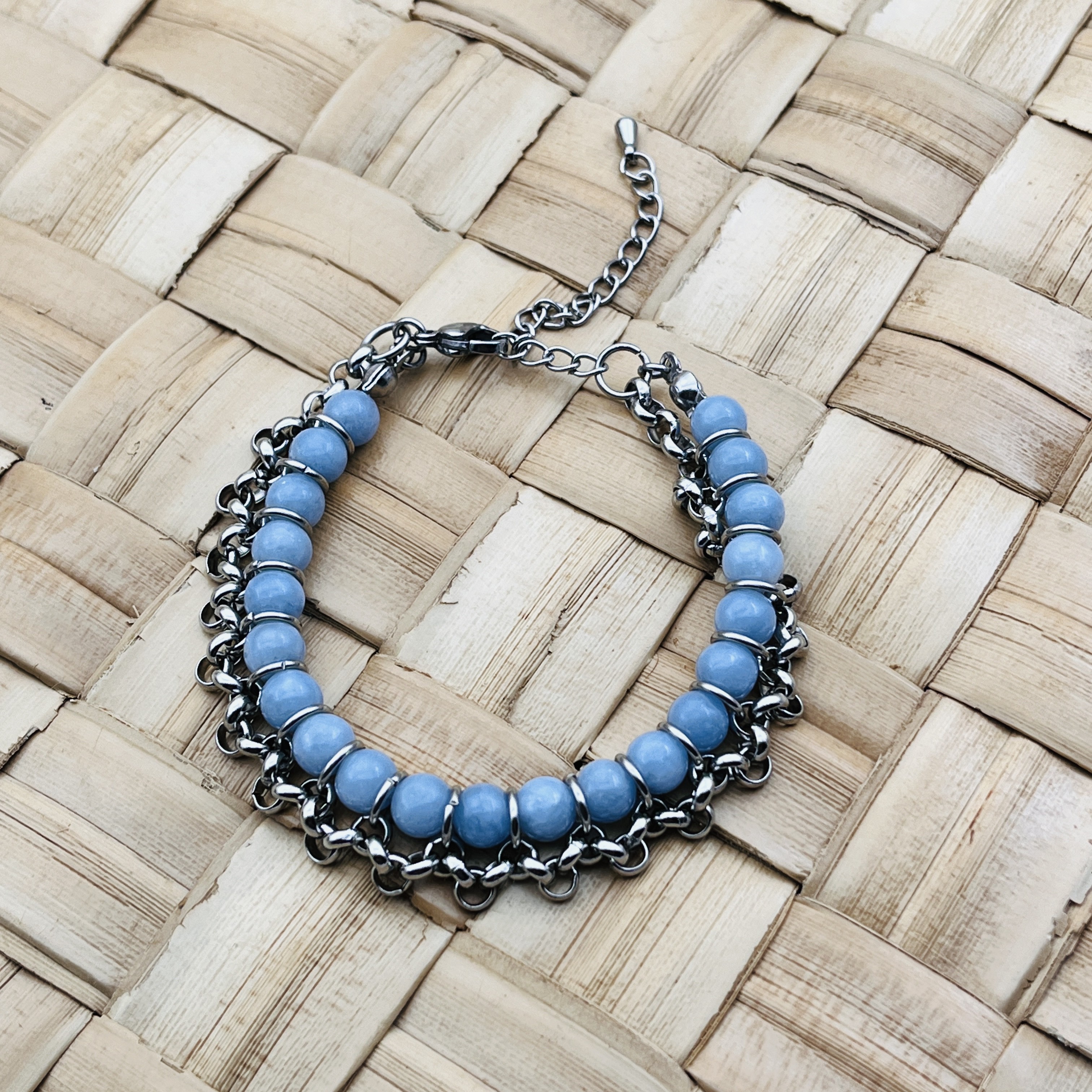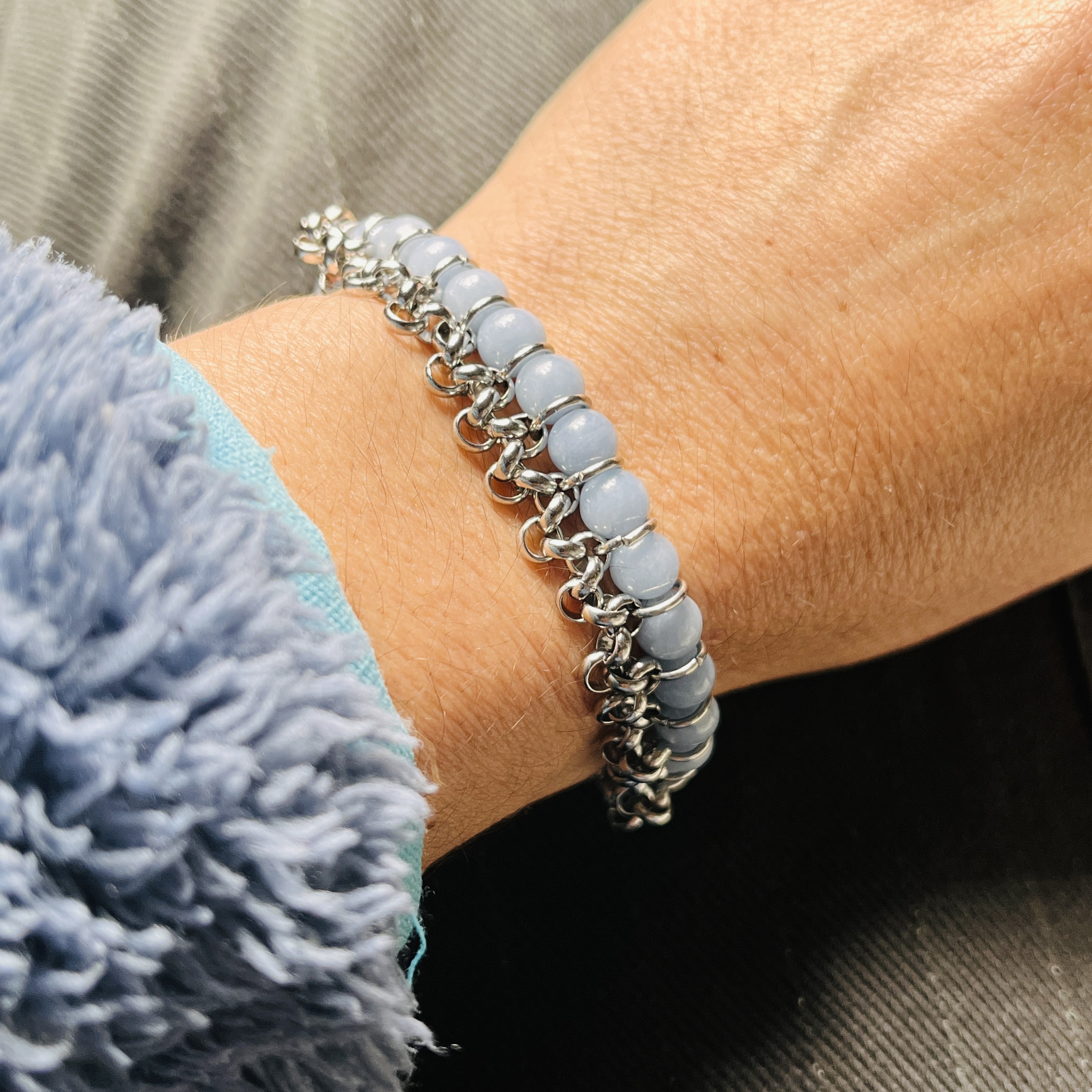 Bracelet en perles Angélite 6mm, chaîne Jaseron reliée par anneaux.