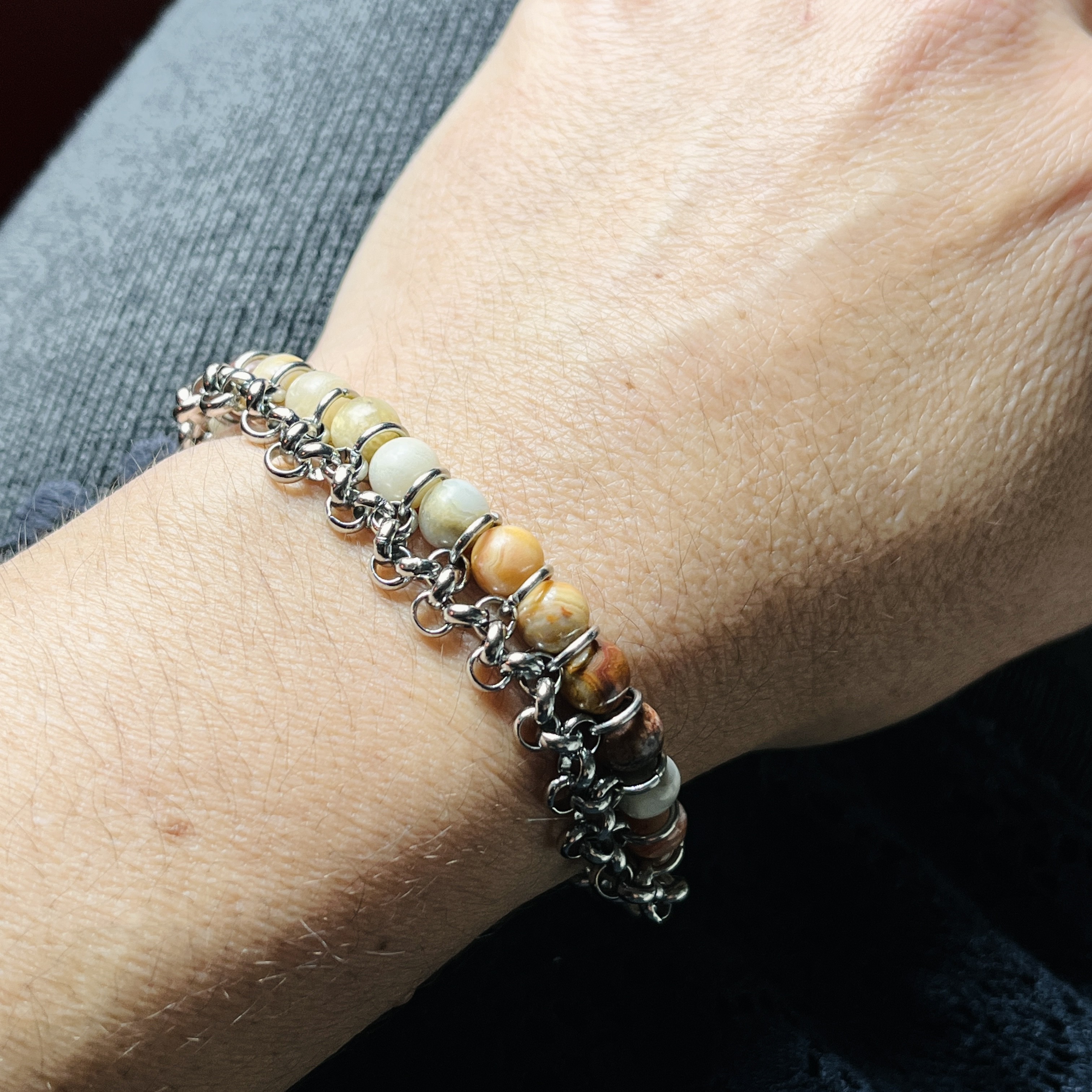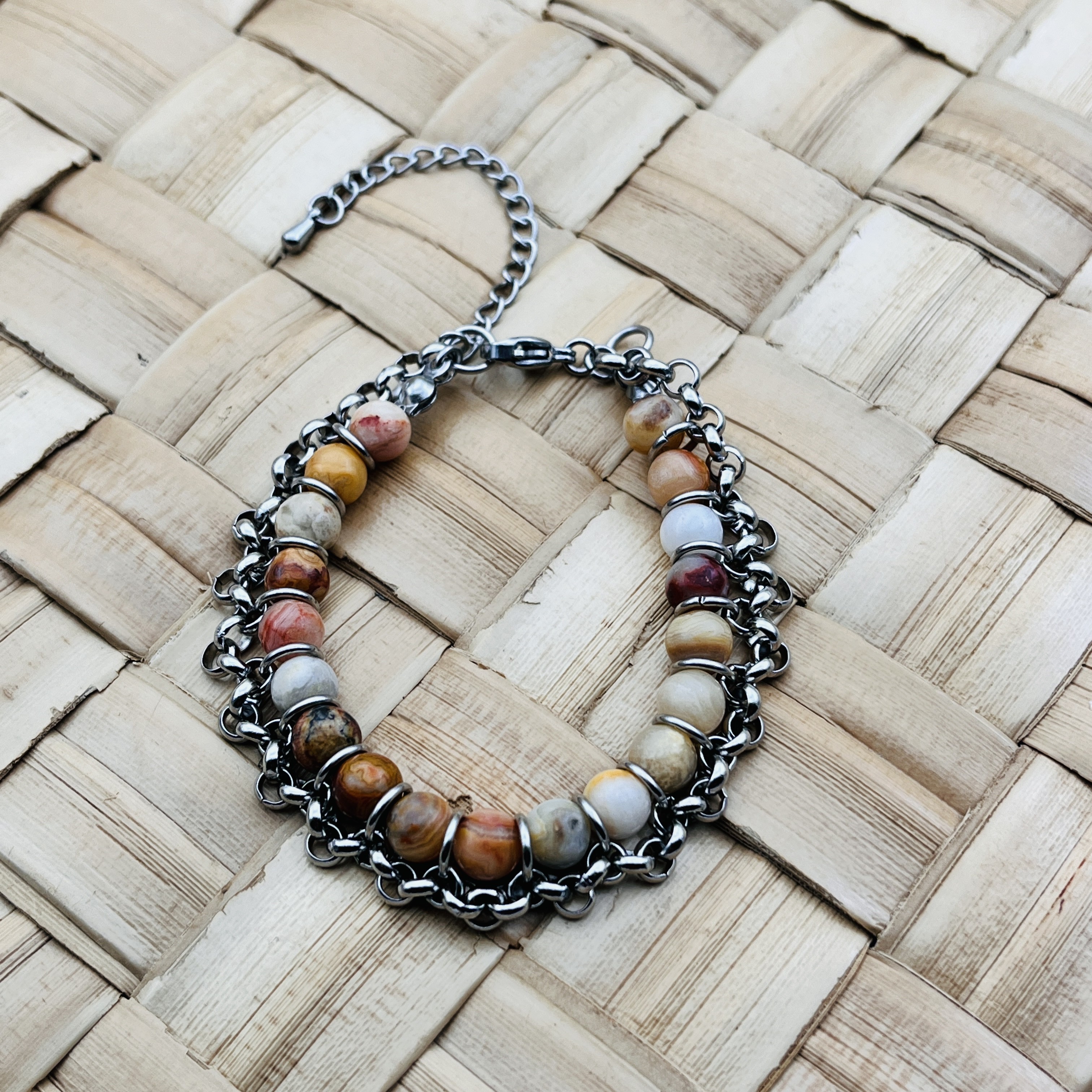 Bracelet Agate Crazy Lace en 6mm et chaîne Jaseron reliée par anneaux.