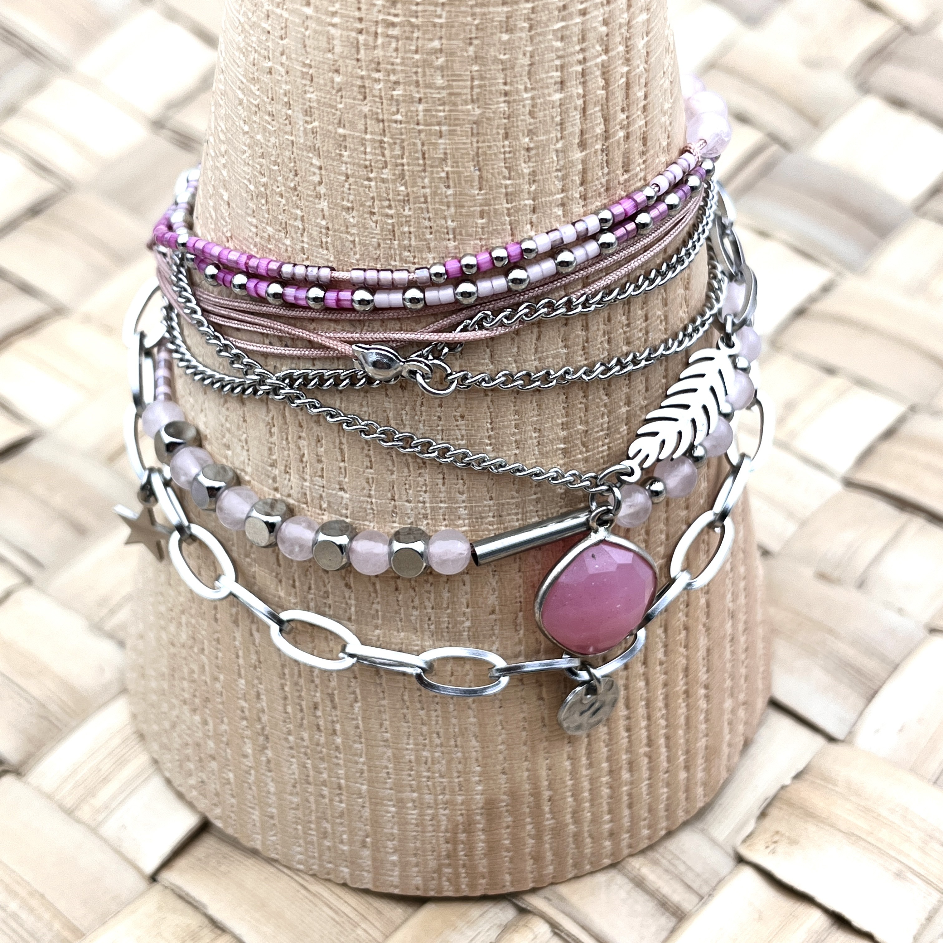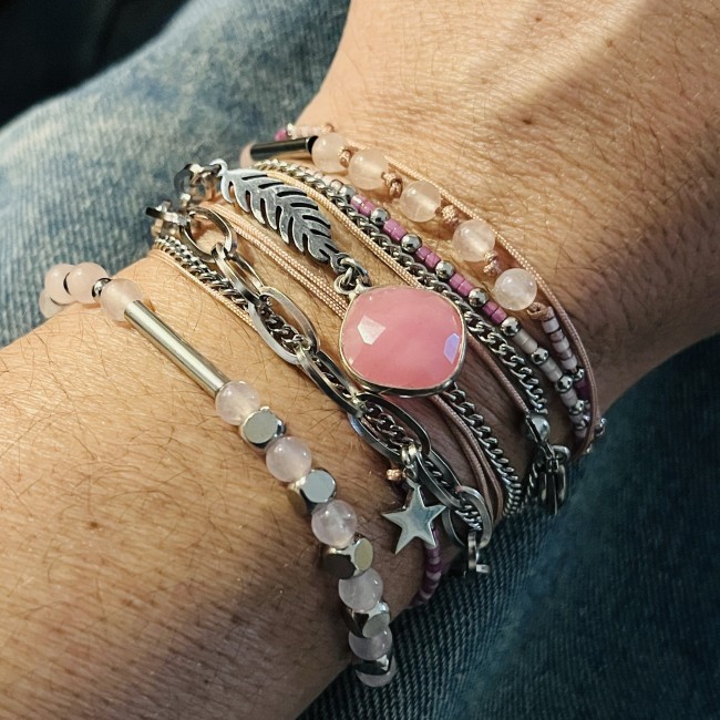 Acier inoxydable, Quartz rose, rocaille et miyuki, étoile, sequin, sillimanite sertie teintée.