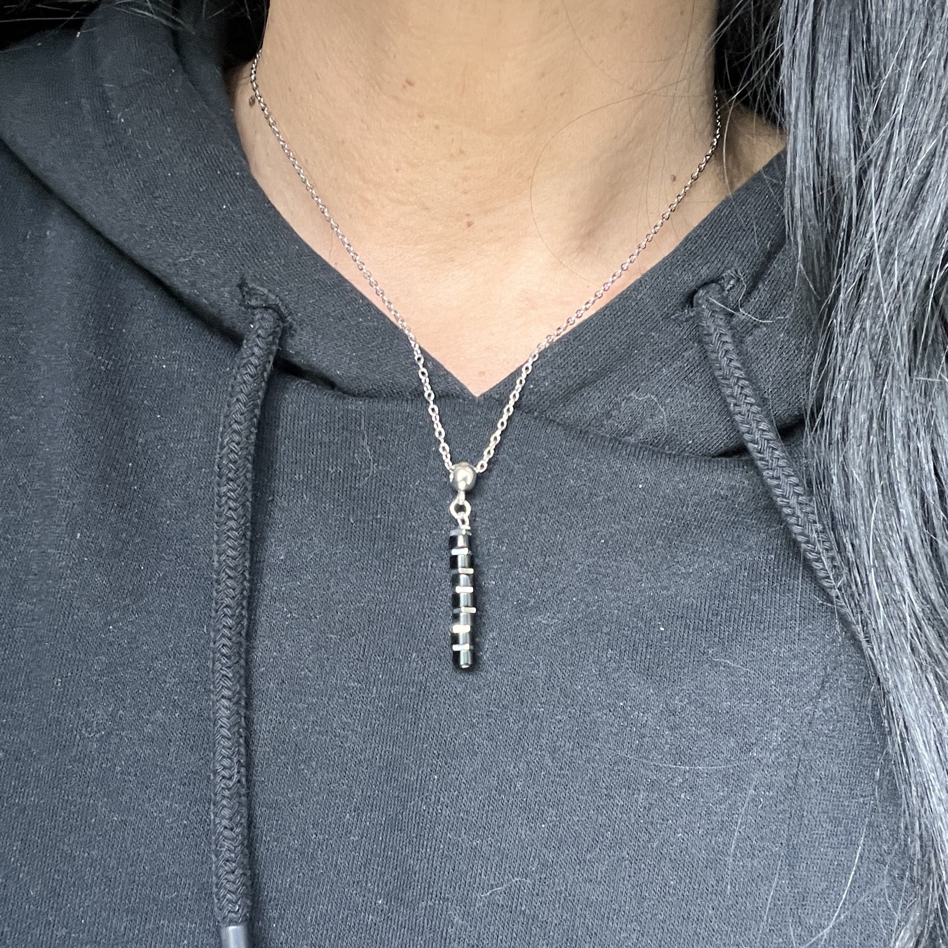 Collier pendentif rondelles heishi et carrés hématite.