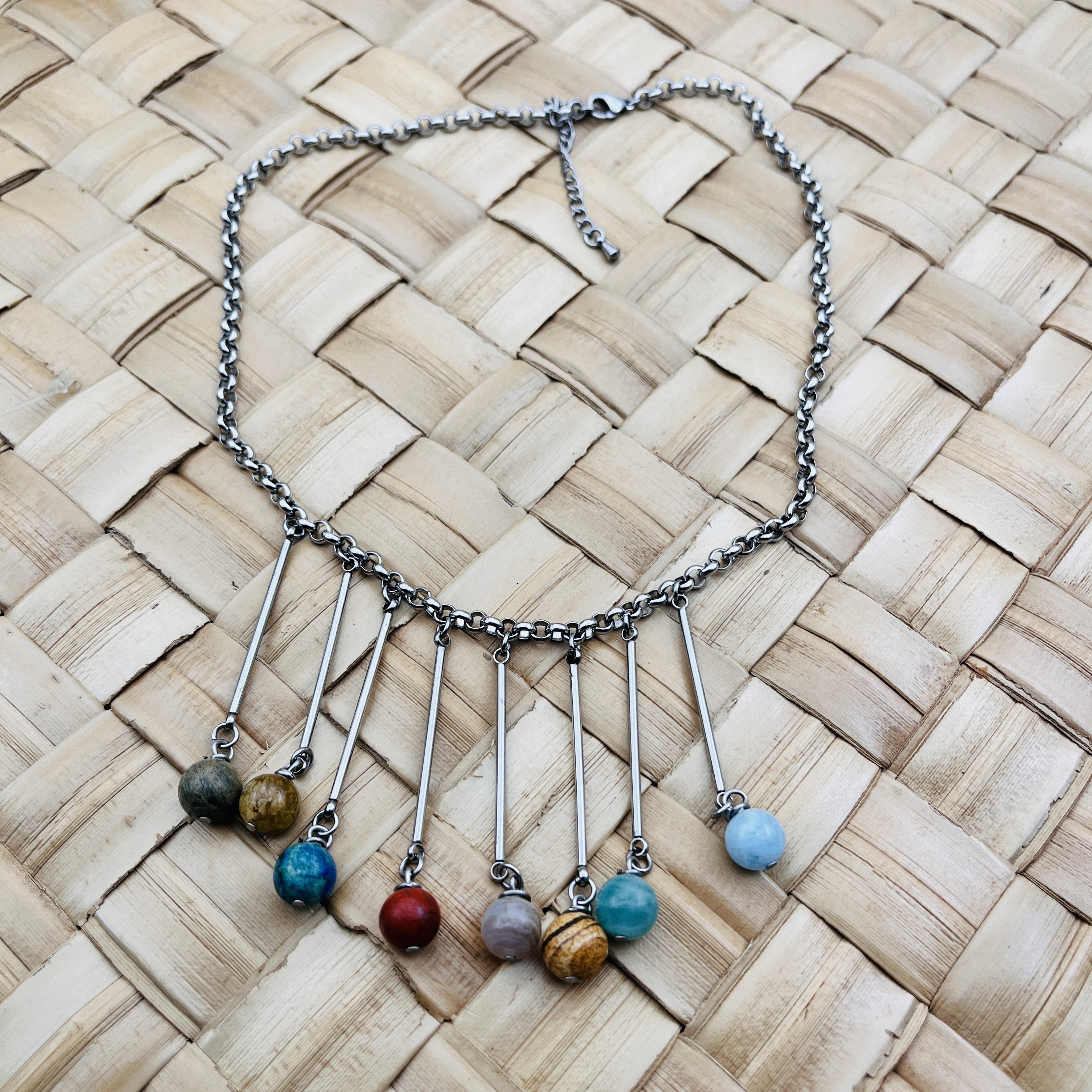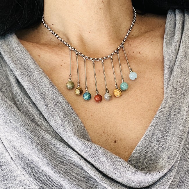 Collier Système solaire, chaque perle représentant une planète au bout d'une tige sur chaîne maille Jaseron. Composé de Morganite bleu, Amazonite, Jaspe paysage, Agate Botswana, Jaspe rouge, Chrysocolle, Grenat vert, Jaspe feuille.