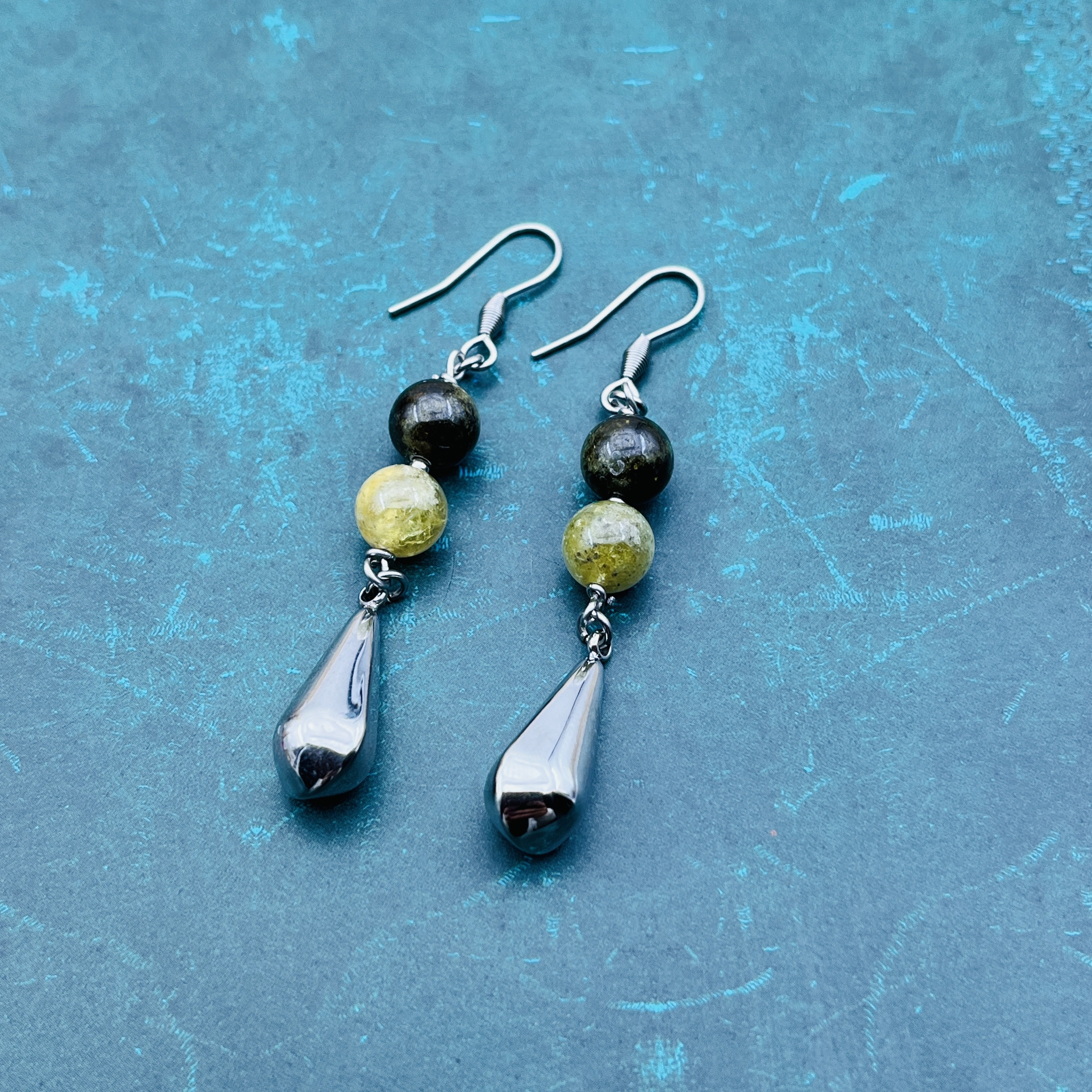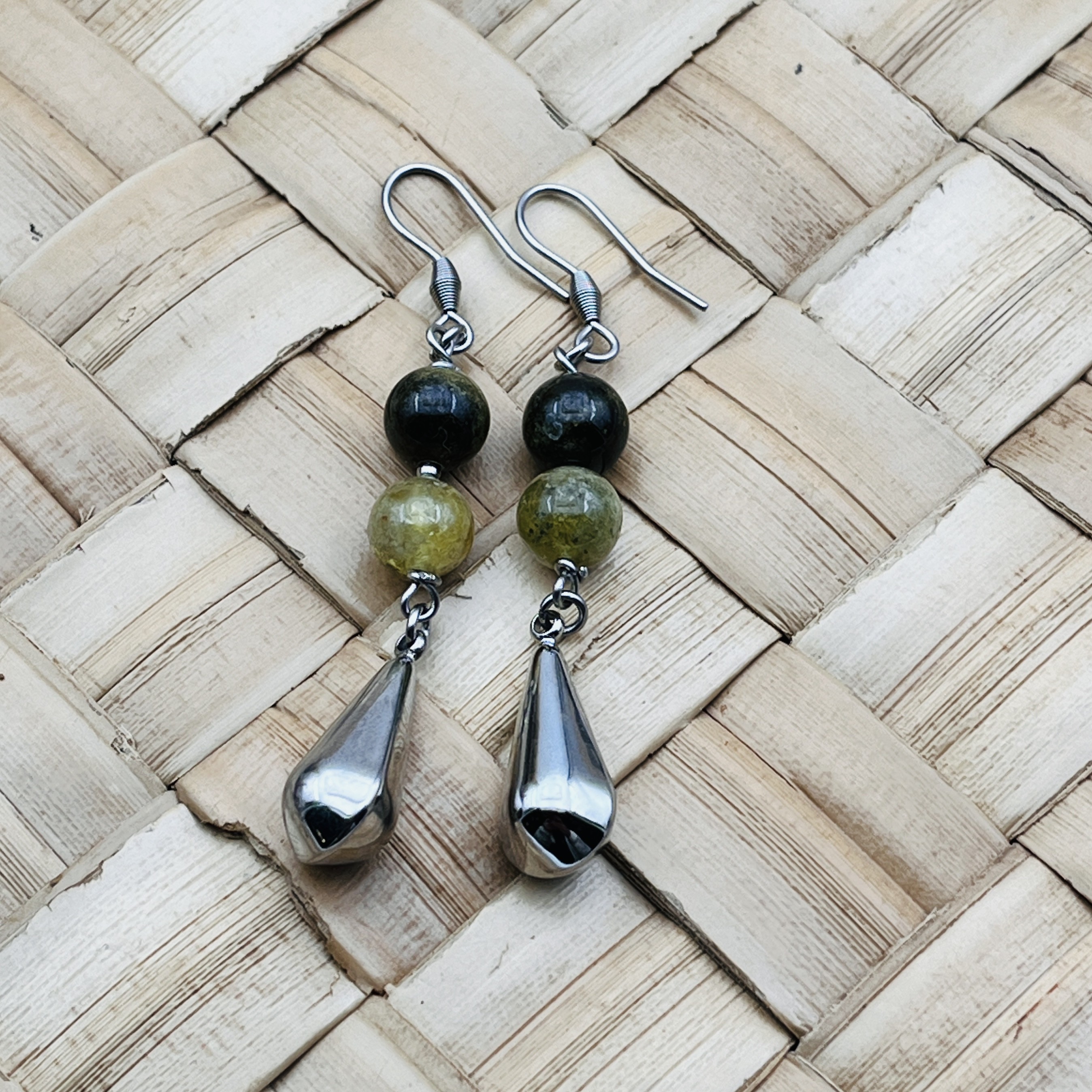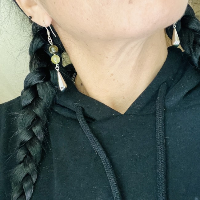 Boucles d'oreilles sur crochets, duo de Grenat vert, un clair et un foncé avec goutte pendantes.
