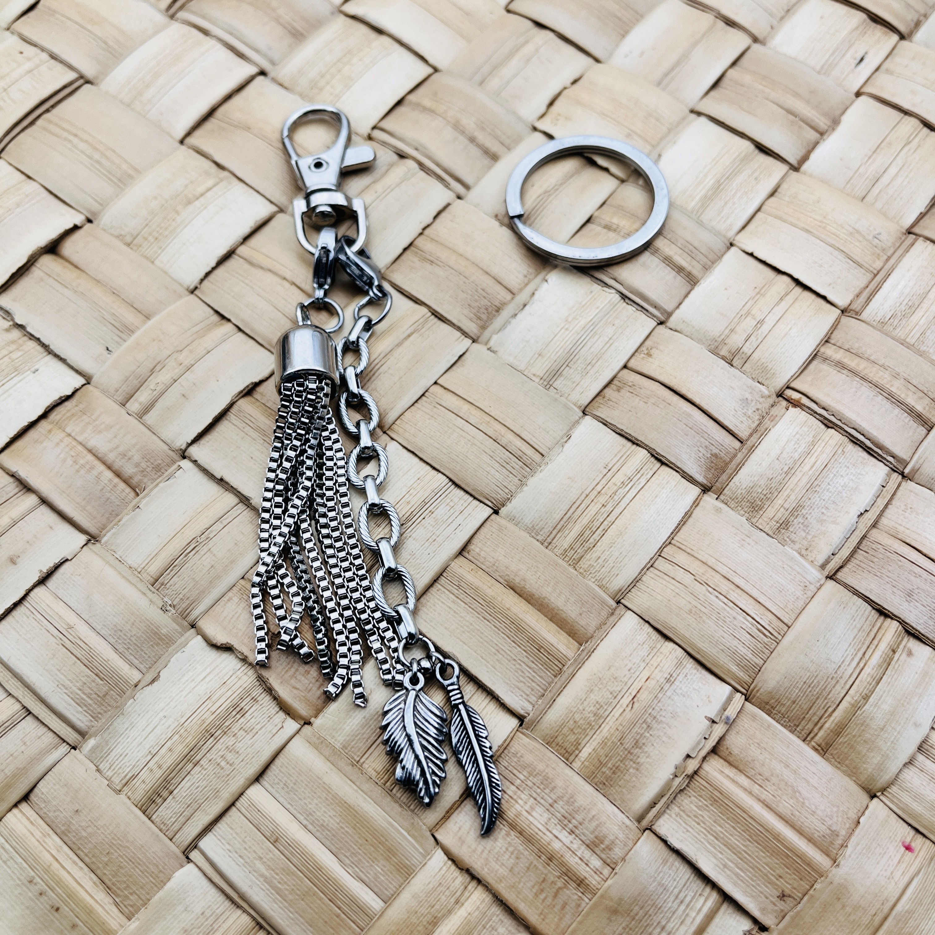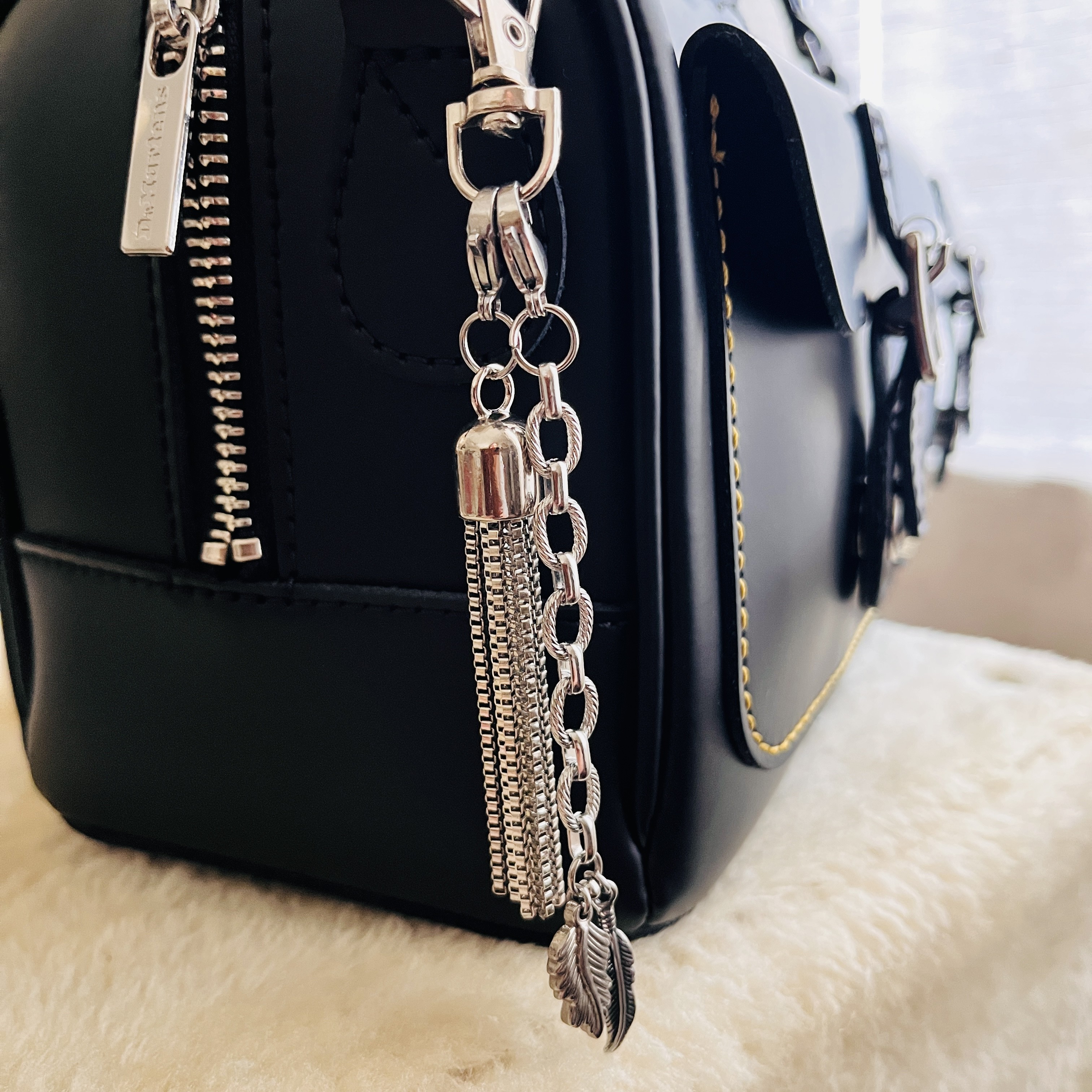 Bijou de sac argenté, pompon maille vénitienne, chaîne grosse maille et breloques plumes, avec anneau porte clé, pour pouvoir interchanger grâce aux mousquetons!