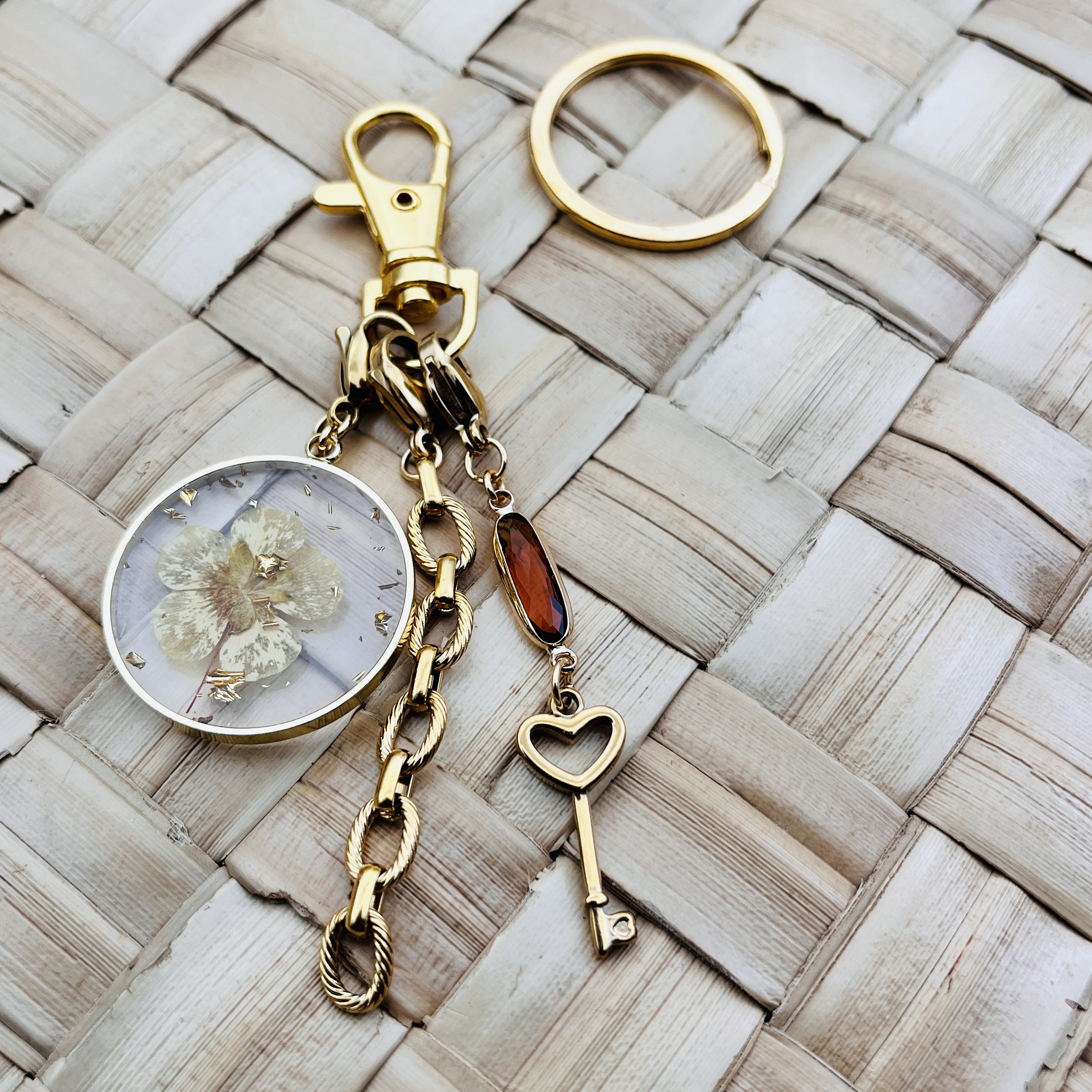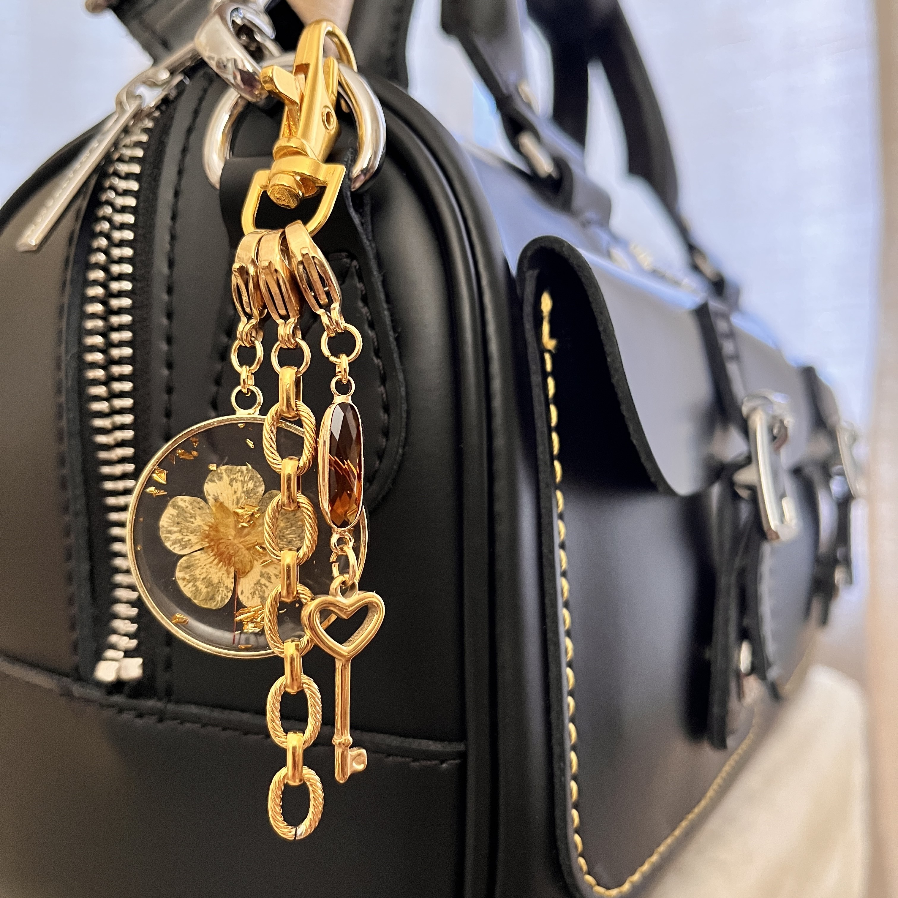 Bijou de sac doré, Fleur jaune, perle de verre ambrée, breloque clé et chaîne épaisse maille forçat, avec anneau porte clé, pour pouvoir interchanger grâce aux mousquetons!