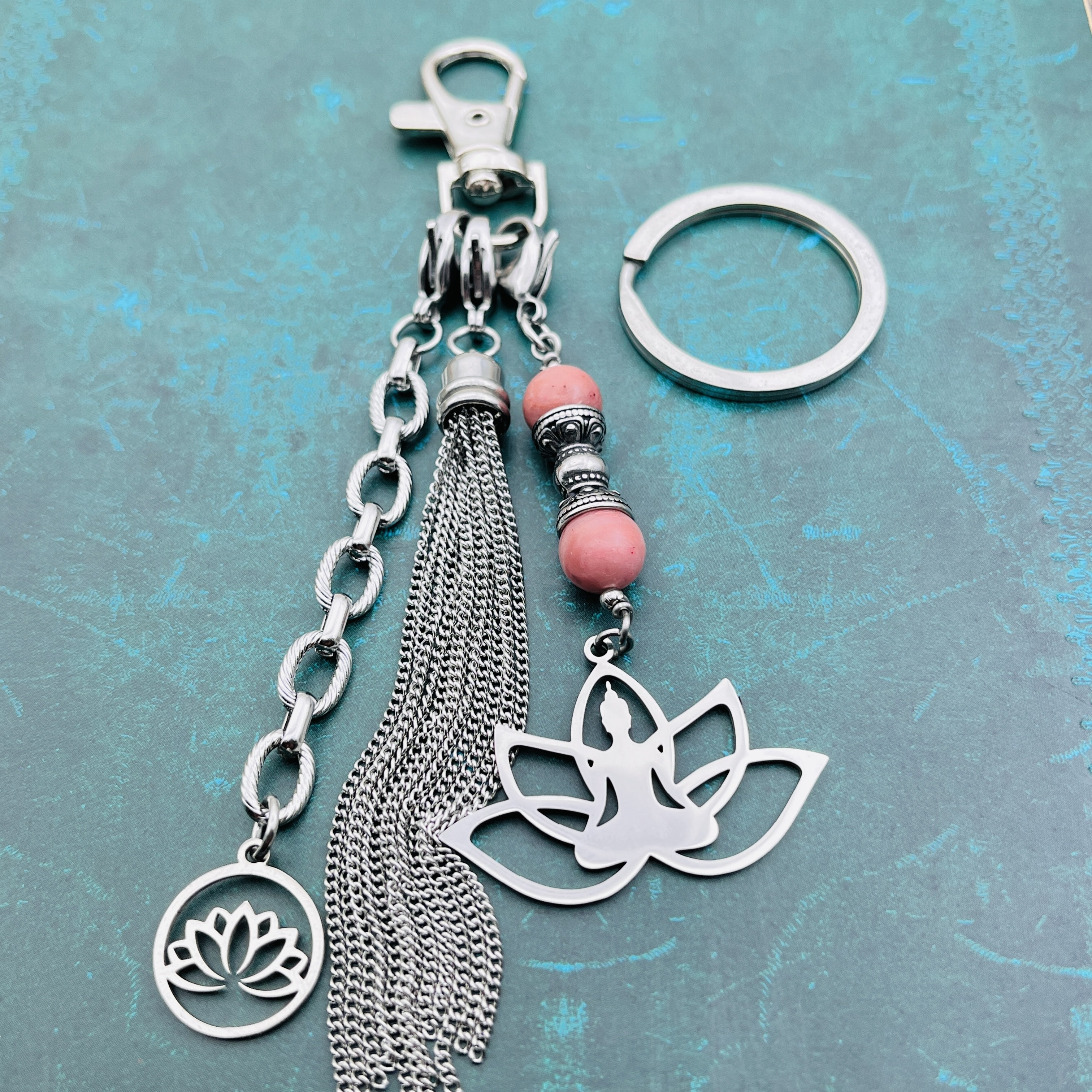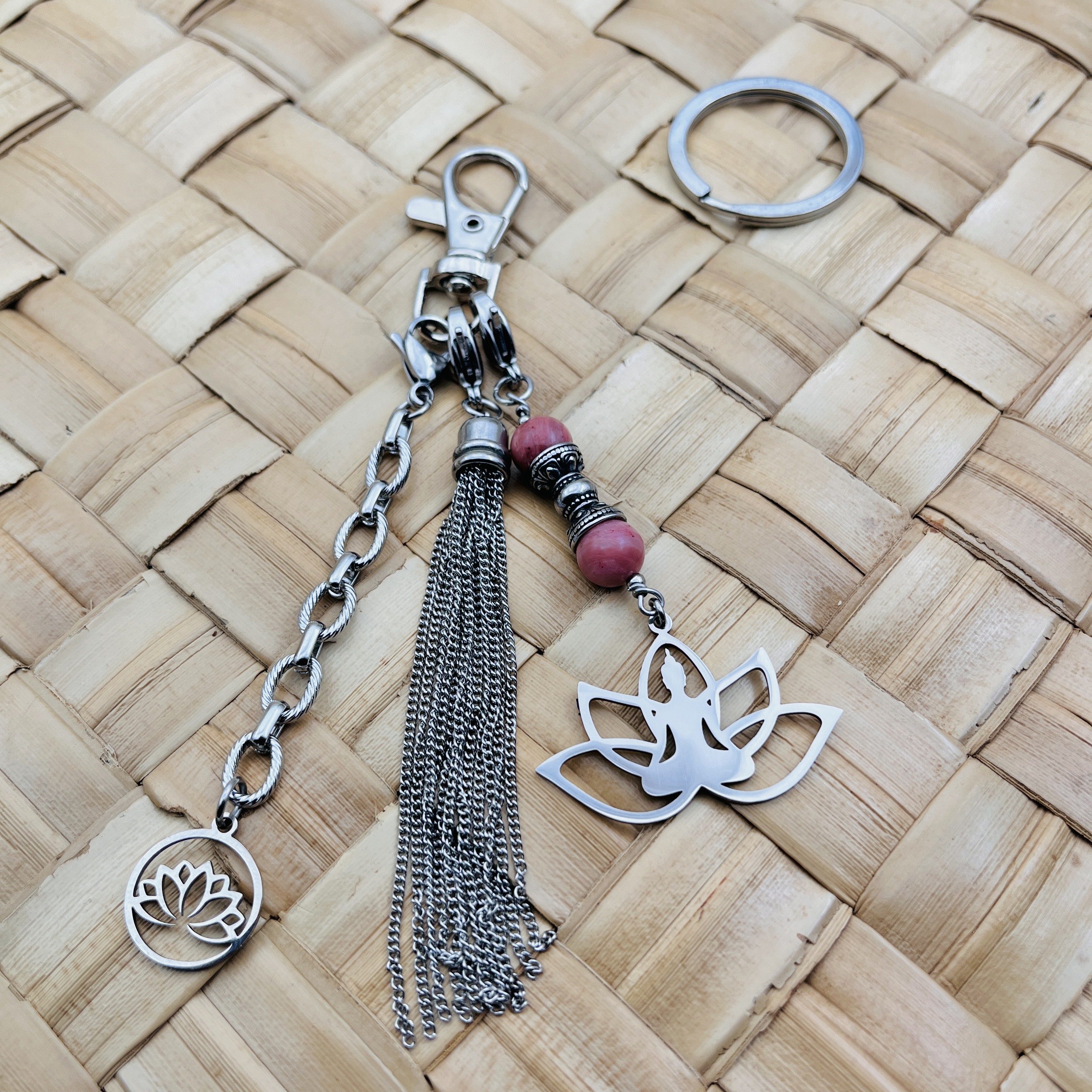 Réalisé cette fois sur le thème zen Lotus, chaîne épaisse maille forçat, tige de Rhodonite avec perle sablier décorée, agrémenté du magnifique pompon qu'on adore! Accessoire amovible pour deux utilisations, un anneau porte clé est inclus pour pouvoir interchanger grâce aux 3 mousquetons!