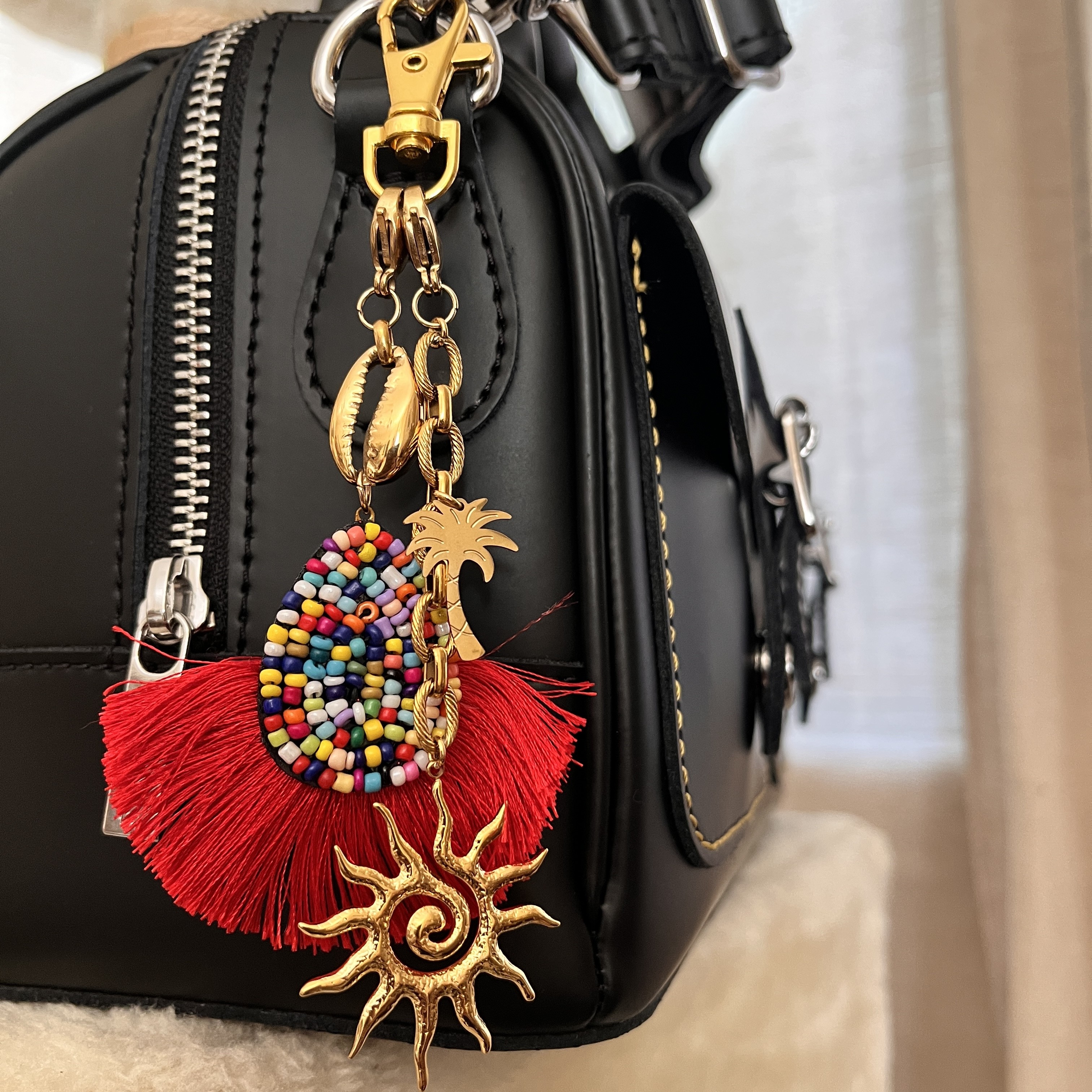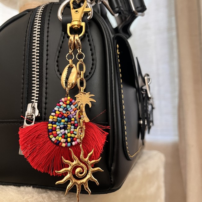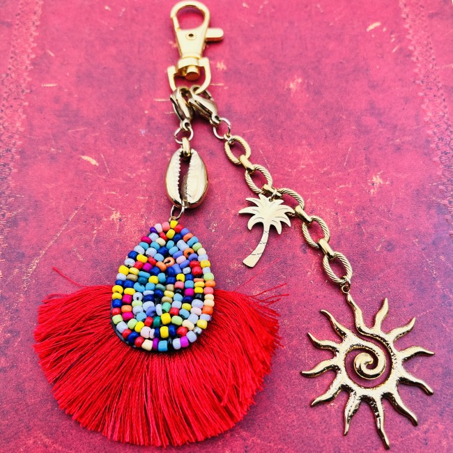 Bijou de sac coloré esprit estival, décoration perlée à frange ton rouge et coquillage cauris, chaîne épaisse maille forçat avec breloque Soleil et palmier.