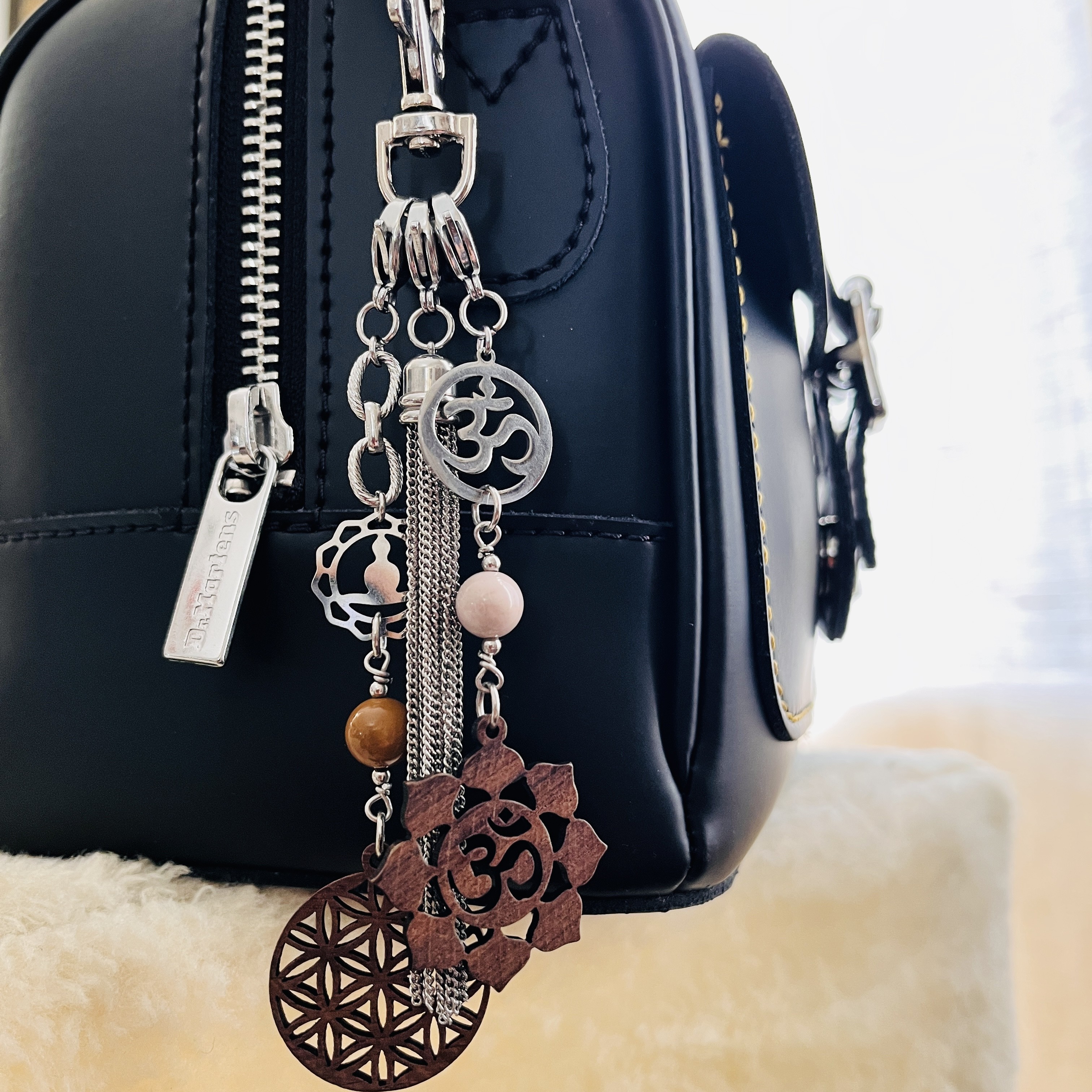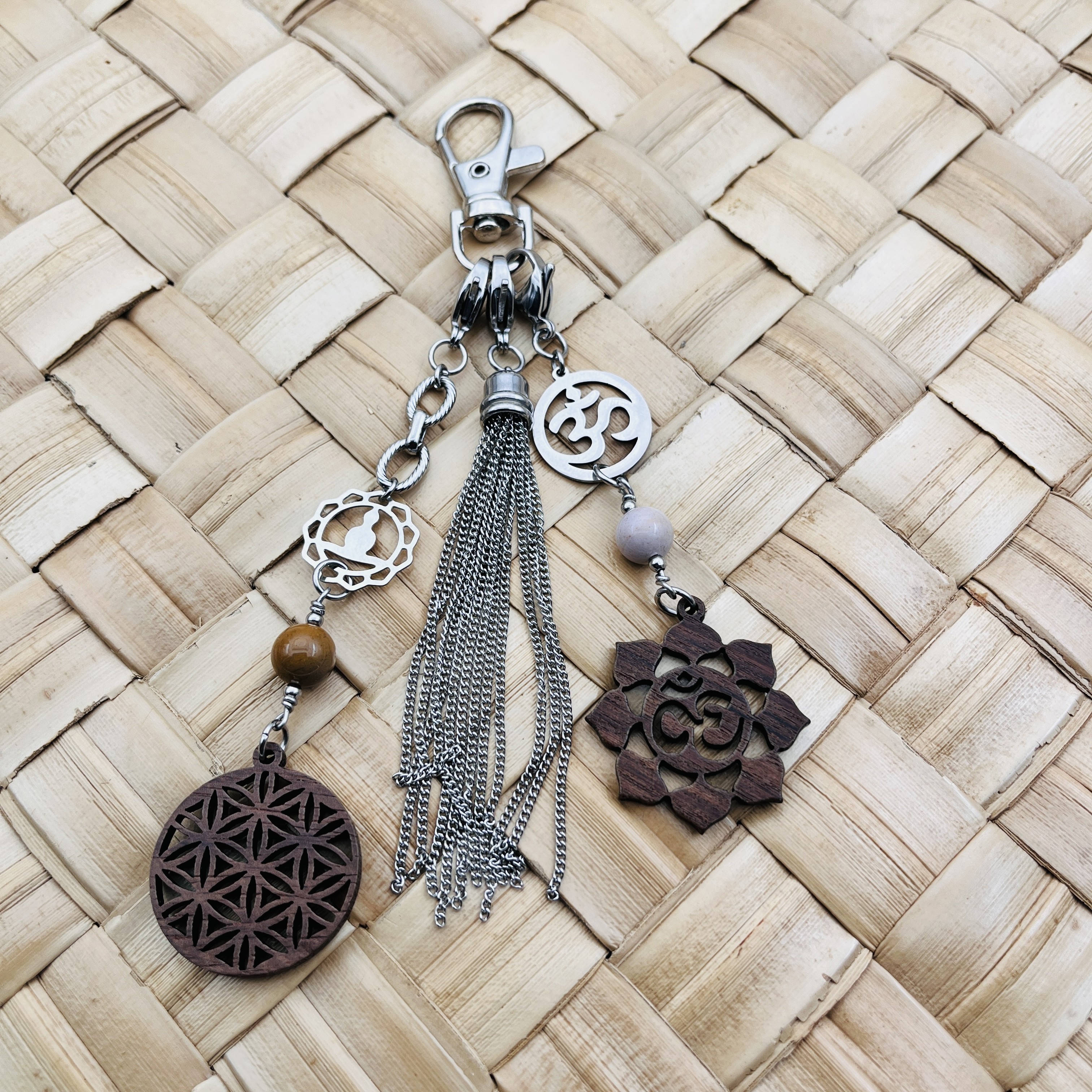 Bijou de sac esprit zen avec une touche naturelle grâce à ses pendants Fleur de vie et Aum en bois Juglans (noyer), ses perles Mokaite couleur terres: Pierre de la purification, des projets, de la Sérénité.