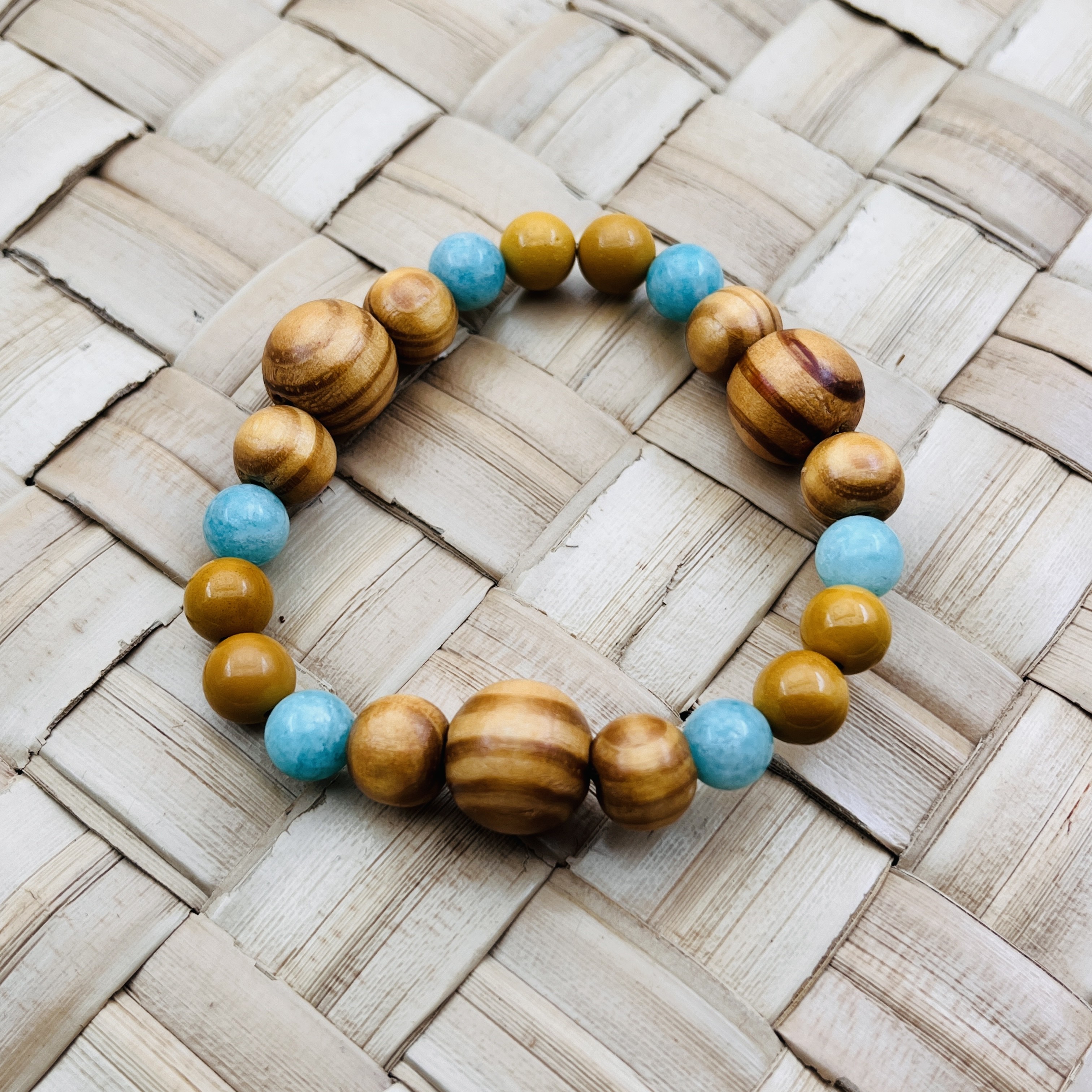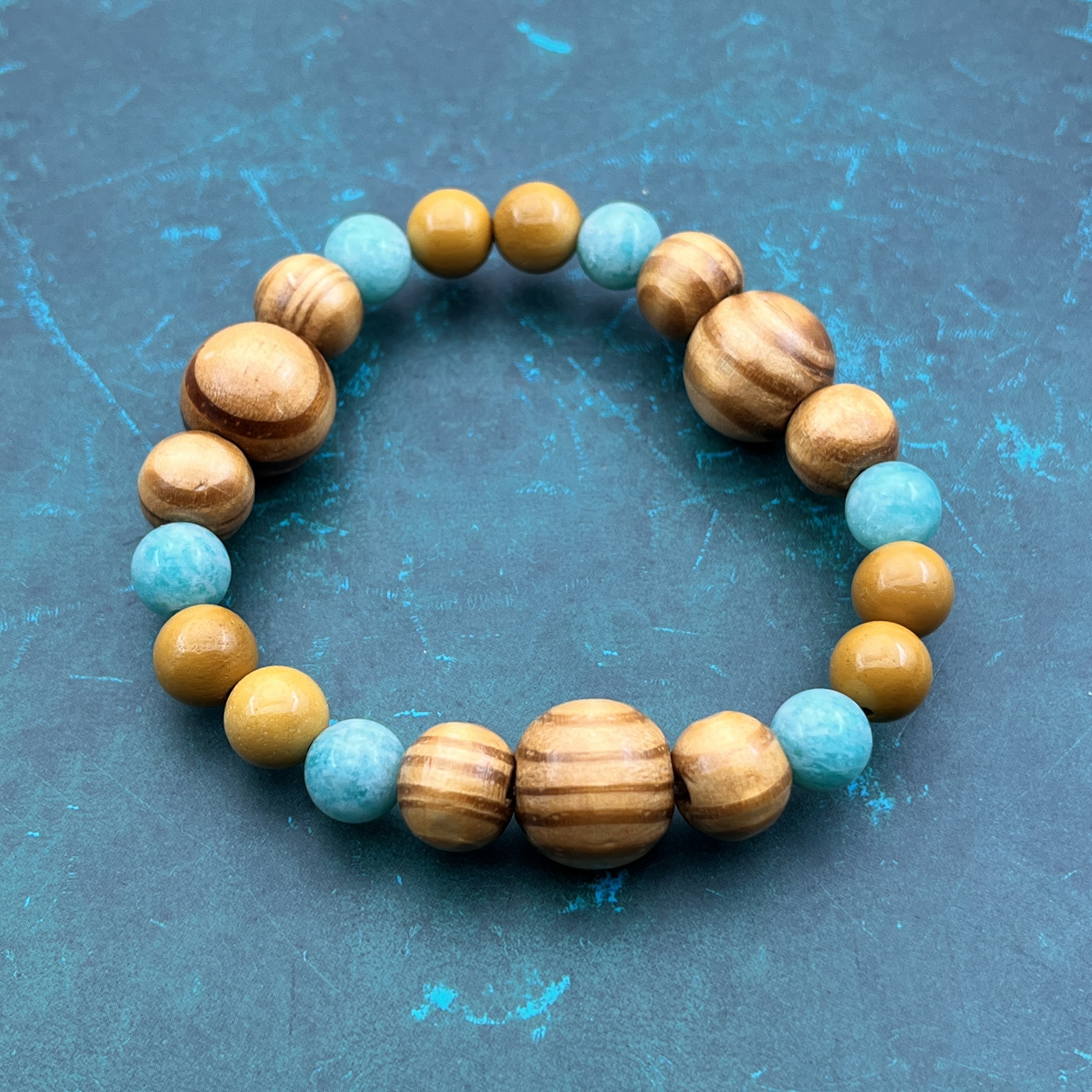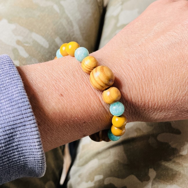 Bracelet Apaisement et élan en perles de pin de deux diamètre différent, Amazonite et Jaspe jaune.