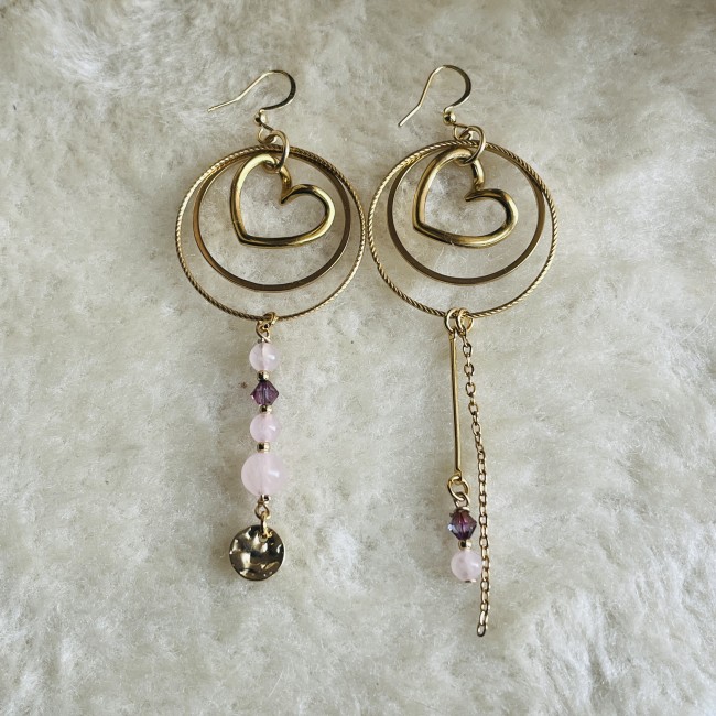 Boucles d’oreilles dorées asymétriques Quartz rose RÉSERVÉES Christine.M